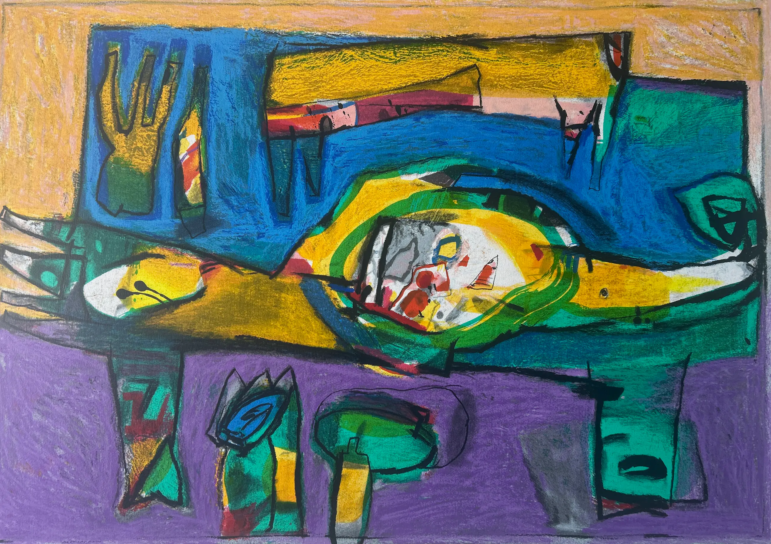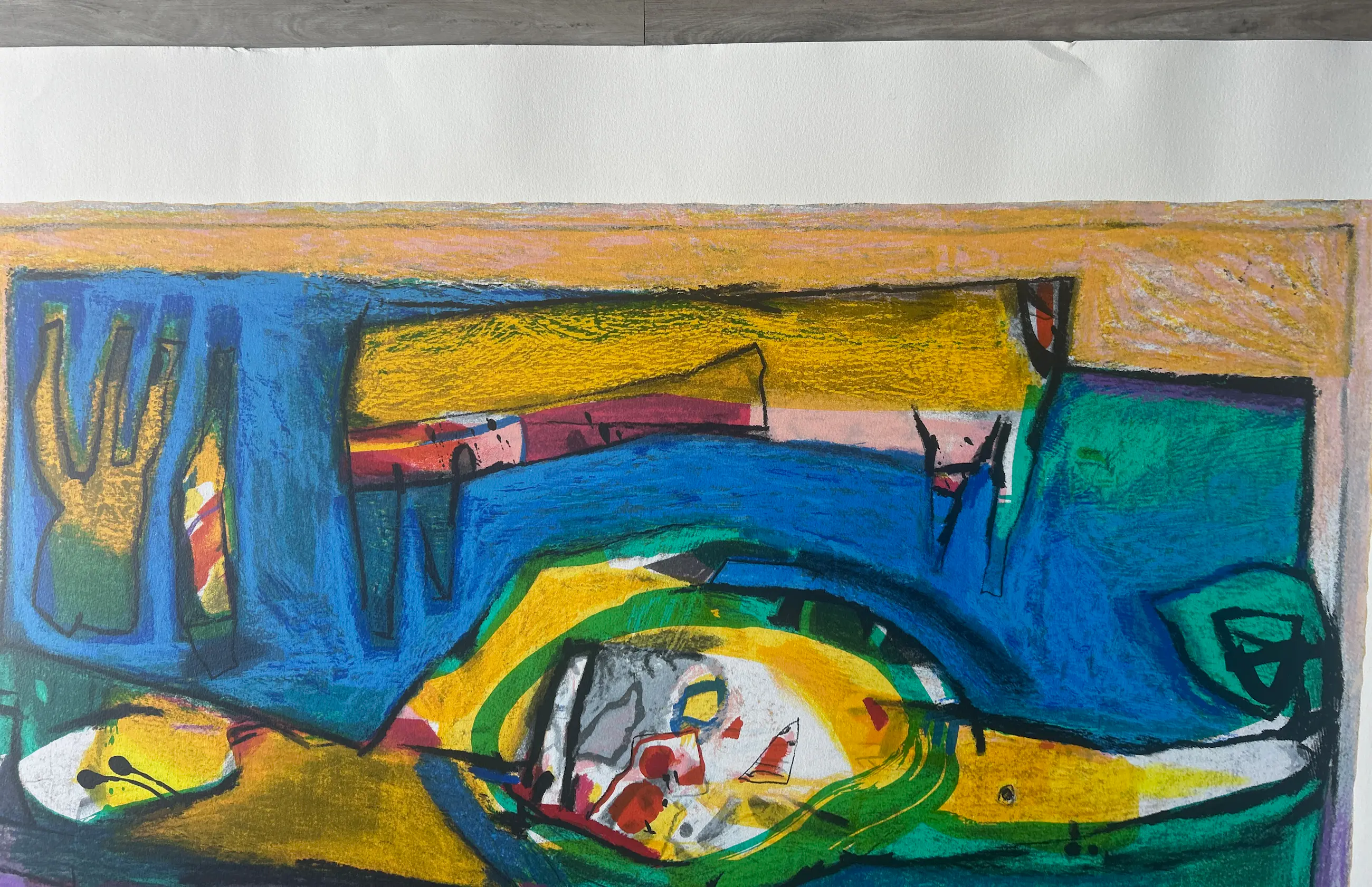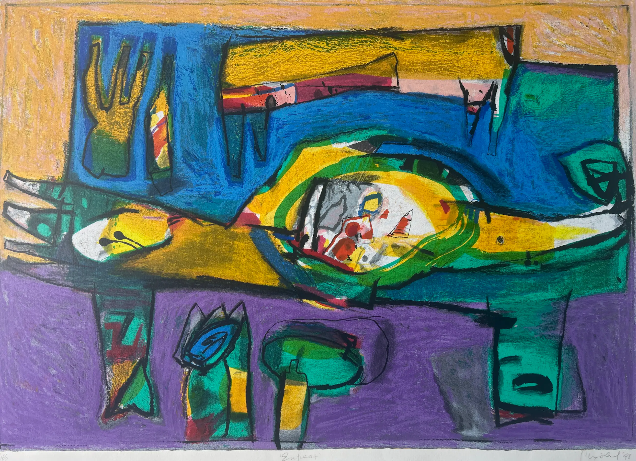 Conditie: zeer goed. Vel heeft lichte deukjes vel rechts en scheurtje 1,5 cm links, zie foto's. Oplage: 82/166. Afmeting: afbeelding 70 x 99 cm. Wordt zorgvuldig verpakt en verzekerd verzonden.