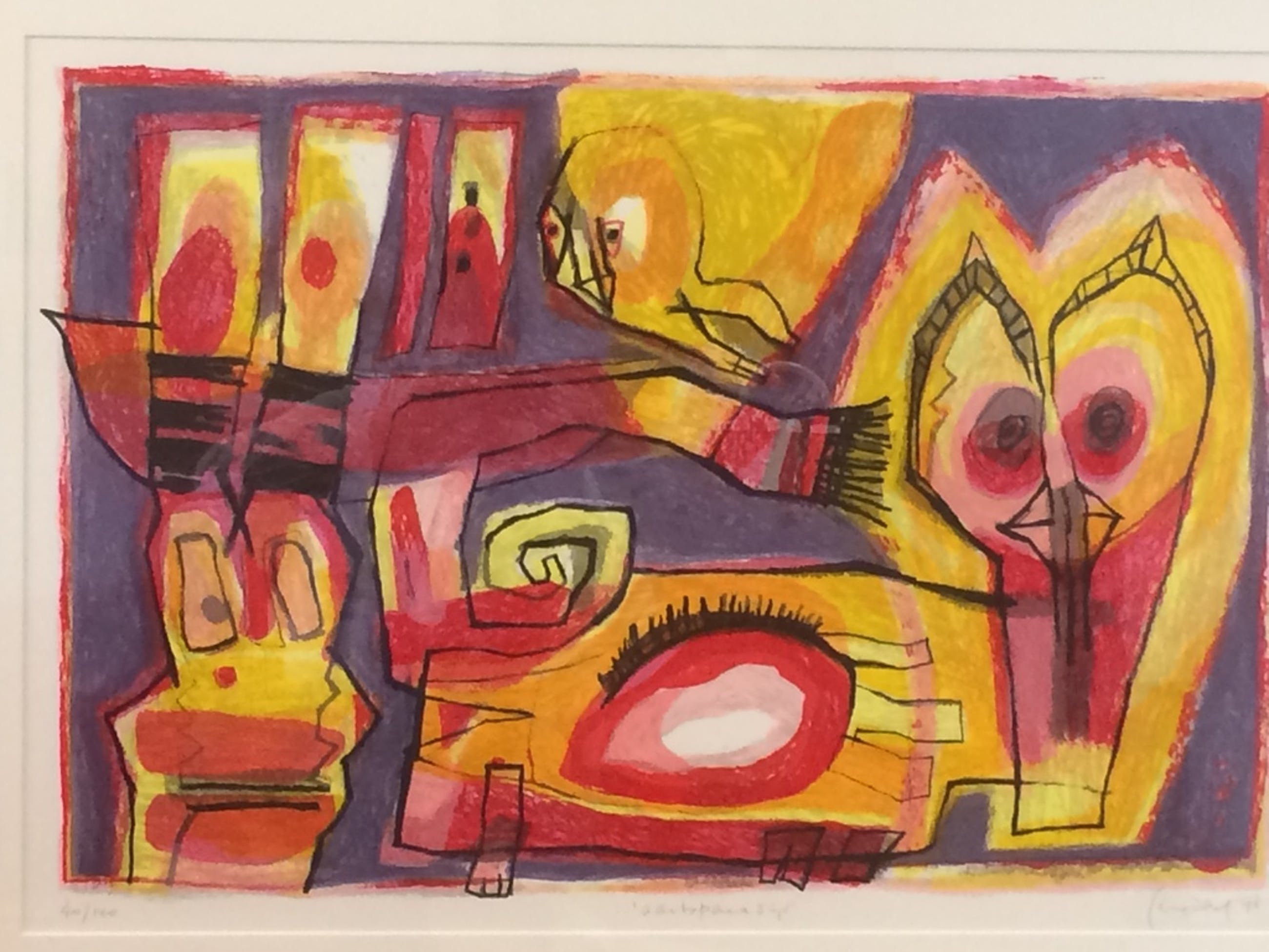 Kleurrijke zeefdruk van Geert Vrijdag in passe partout en zilverkleurige houten lijst (83 x 108 cm. Gesigneerde en genummerde zeefdruk in nieuw staat. Papierformaat ca 65 x 90 cm. Nummer 40 uit een serie van 140. De zeefdruk kan worden bekeken en/of opgehaald in onze galerie Rotor in Arkel of aangetekend worden verzonden zonder lijst en passe partout in een stevige kartonnen verpakking. De voorkeur wordt gegeven aan ophalen of koerier zodat de lijst behouden kan blijven. De lijst kan zo aan de muur worden opgehangen!