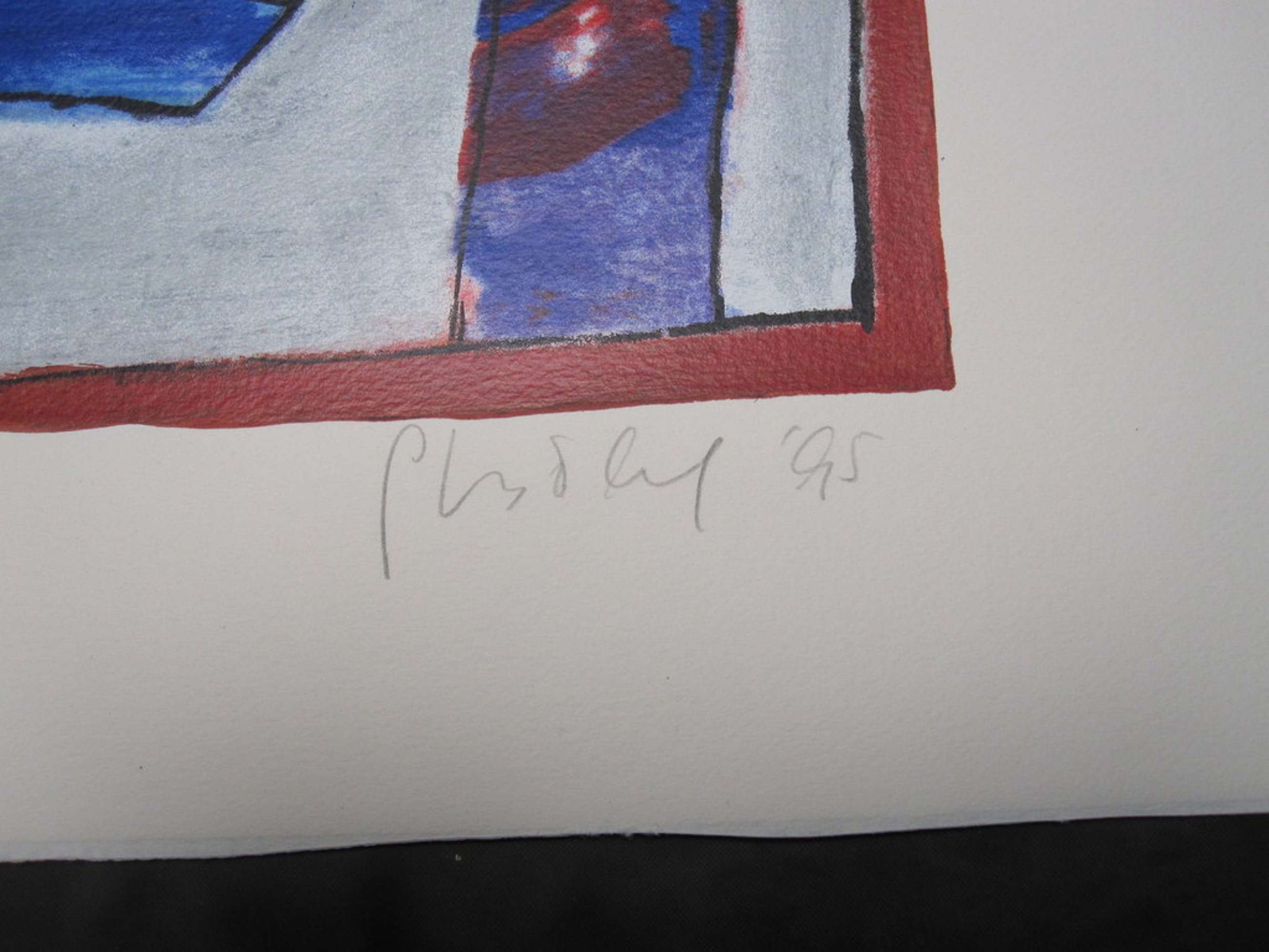 Zeefdruk ''Compositie in Blauw'' uit 1995 van Geert Vrijdag (1943-1999)