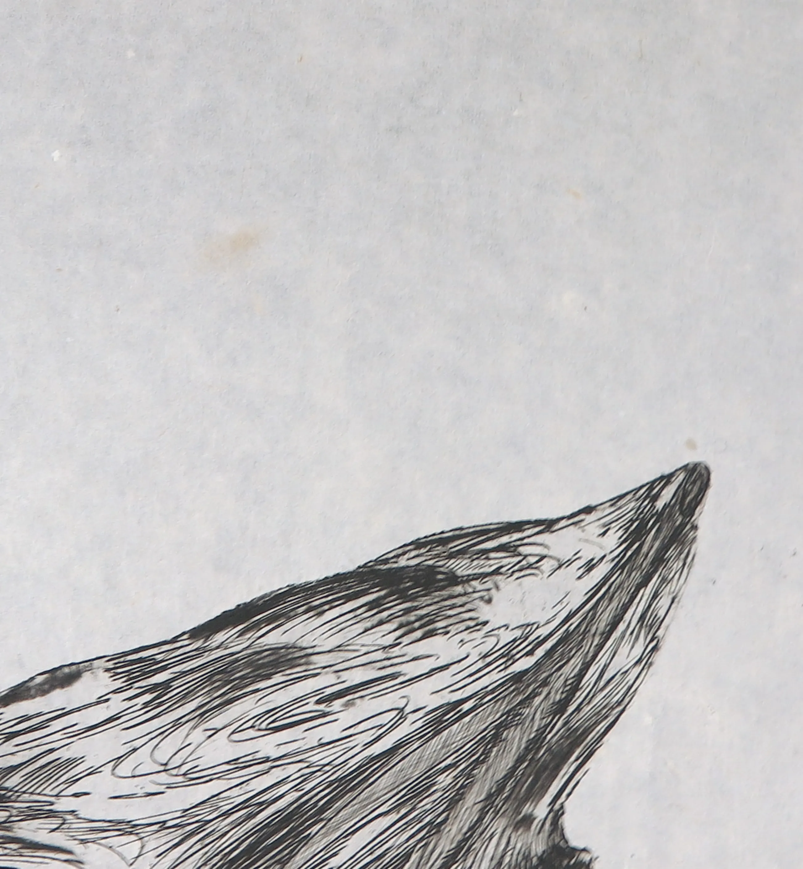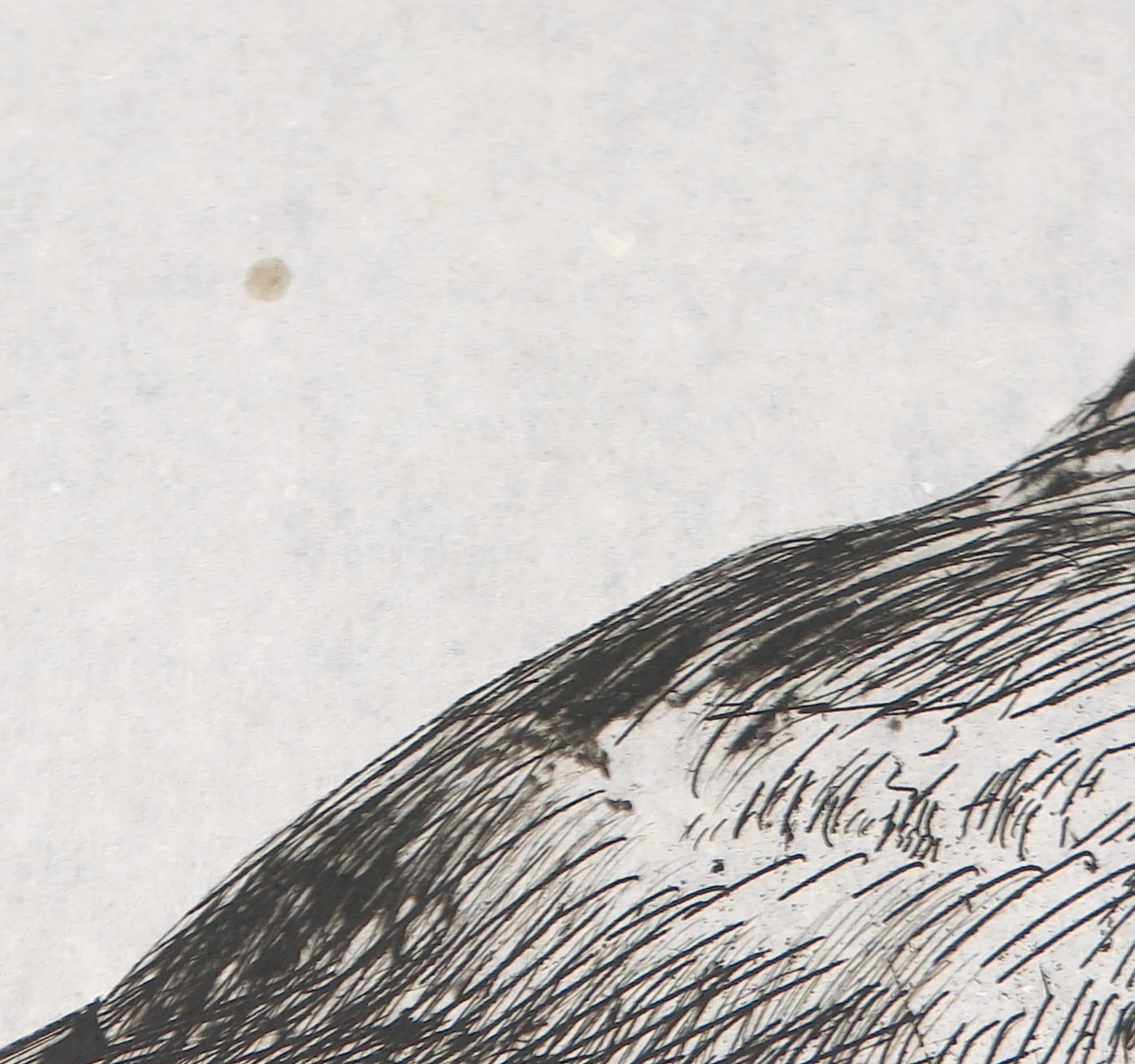 | Het papier is vergeeld met hier en daar wat imperfecties, foxing en wat zichtbare vezels Ook zitten er wat kreukels in het papier. | |