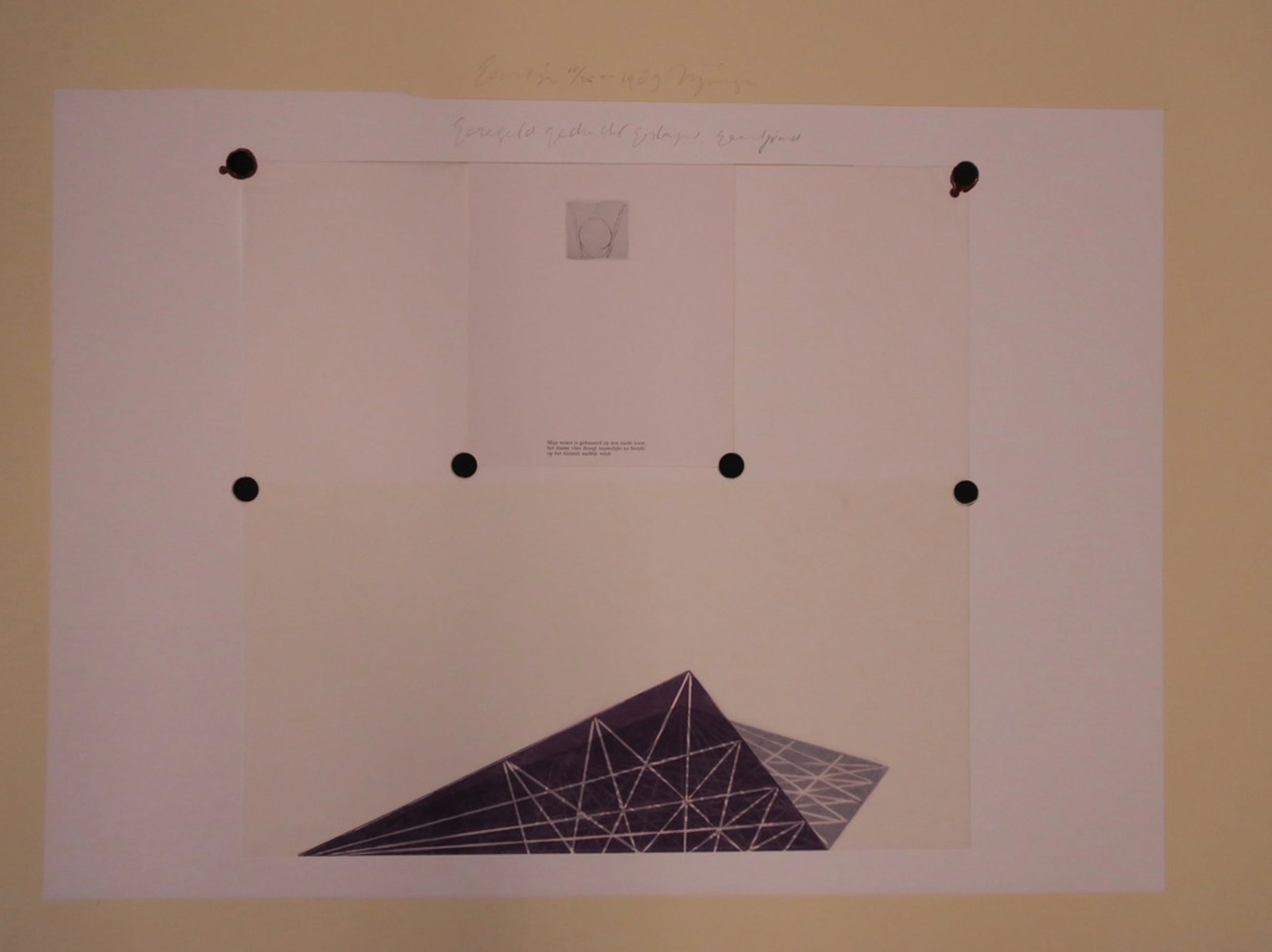 Materiaal: Gemengde techniek, o.a. houtdruk op Japans papier en collage bevestigd op geelkleurig onderblad