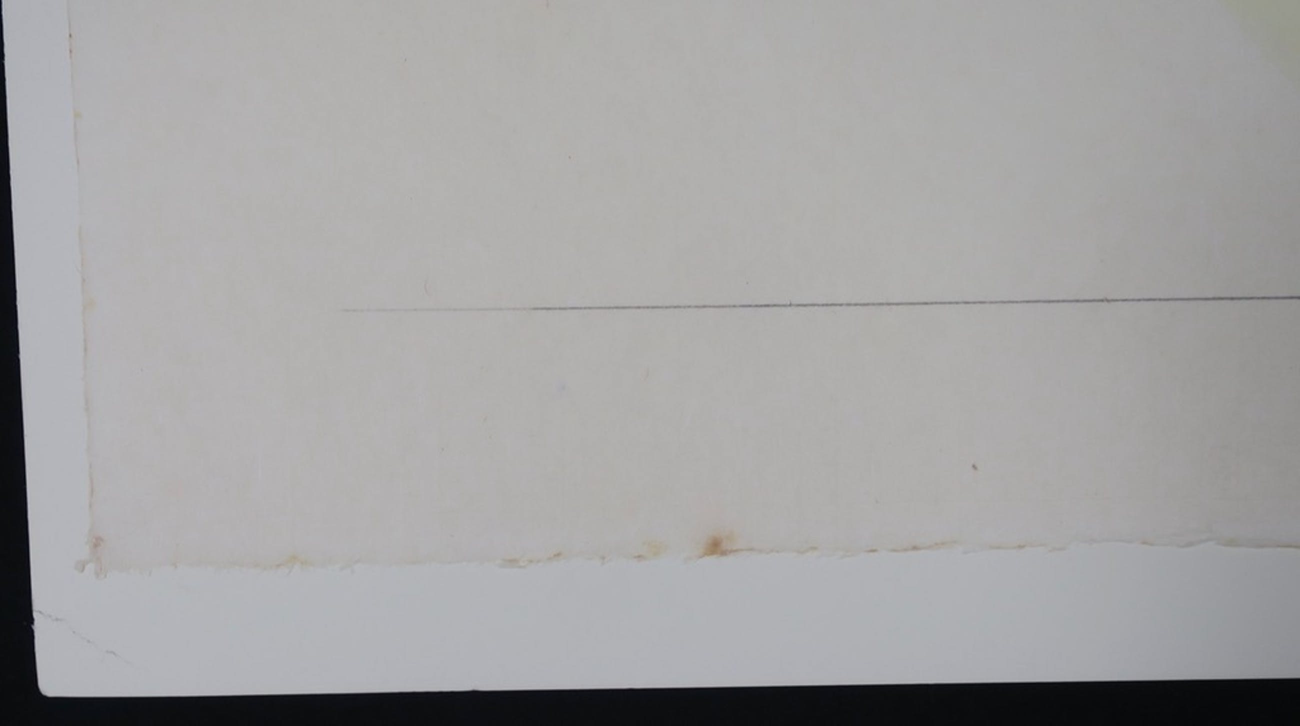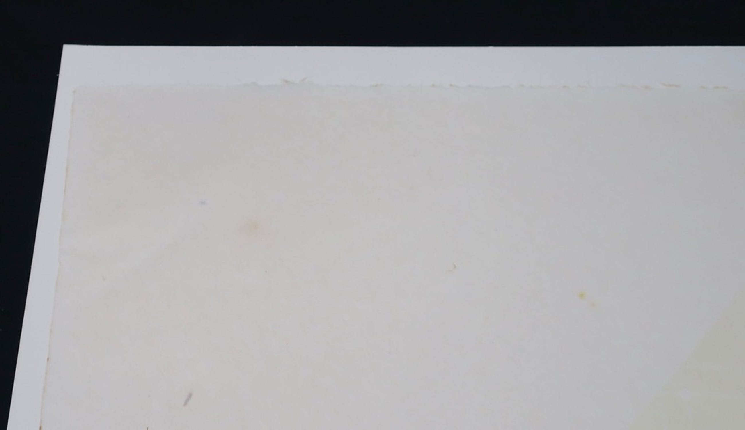 Conditie: In goede staat, maar met oxidatiestipjes in het blad en met wat lichte kreuk (haast onvermijdelijk bij dit fragiele papier), voornamelijk langs de randen. En met een lichte vouwlijn door het beeld heen.