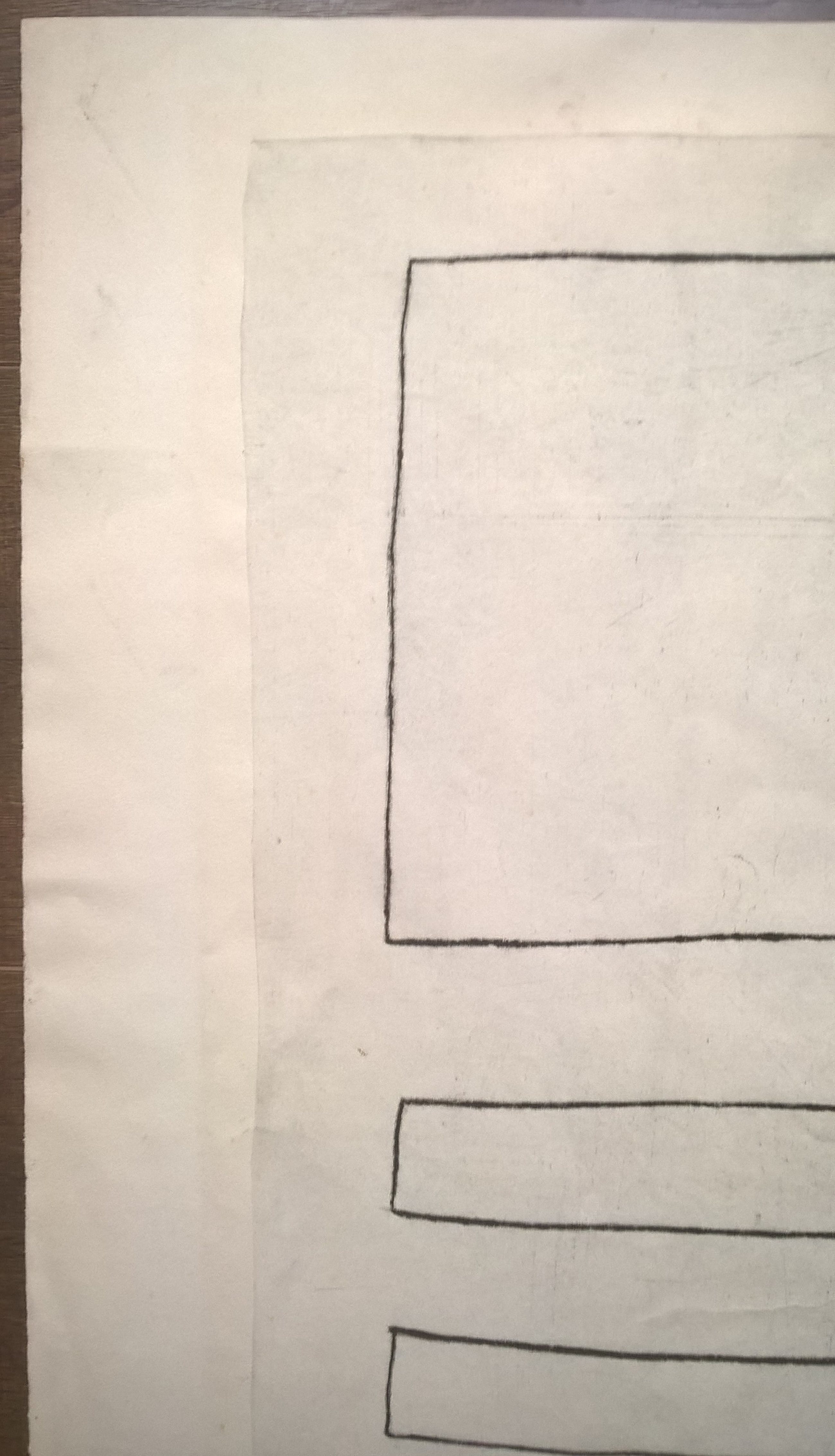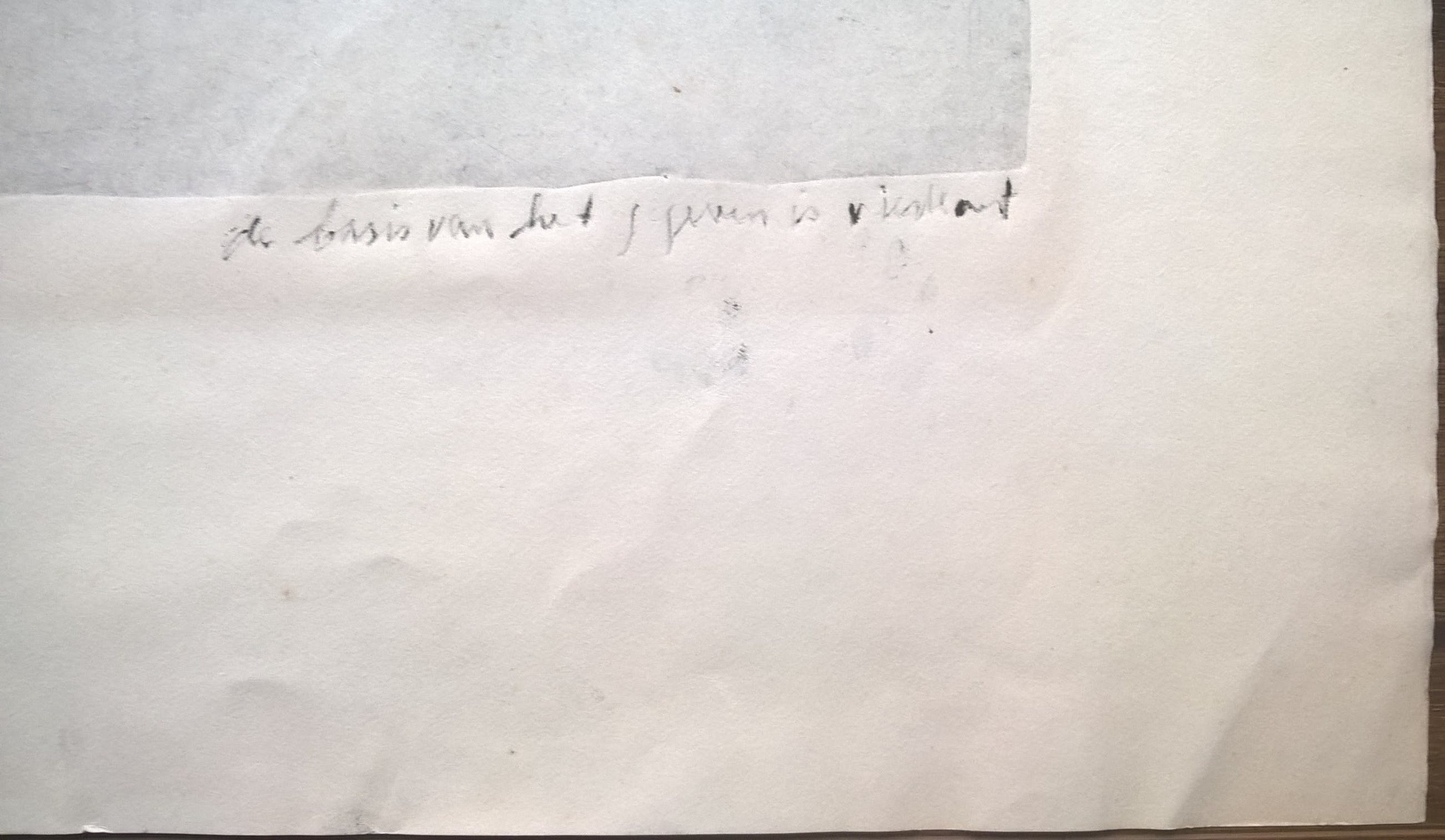 | Het papier is vergeeld door eerdere inlijsting, vlekjes buiten beeld, papier is op een aantal plaatsen gekreukt ,op de achterkant zijn tape resten zichtbaar. | |||