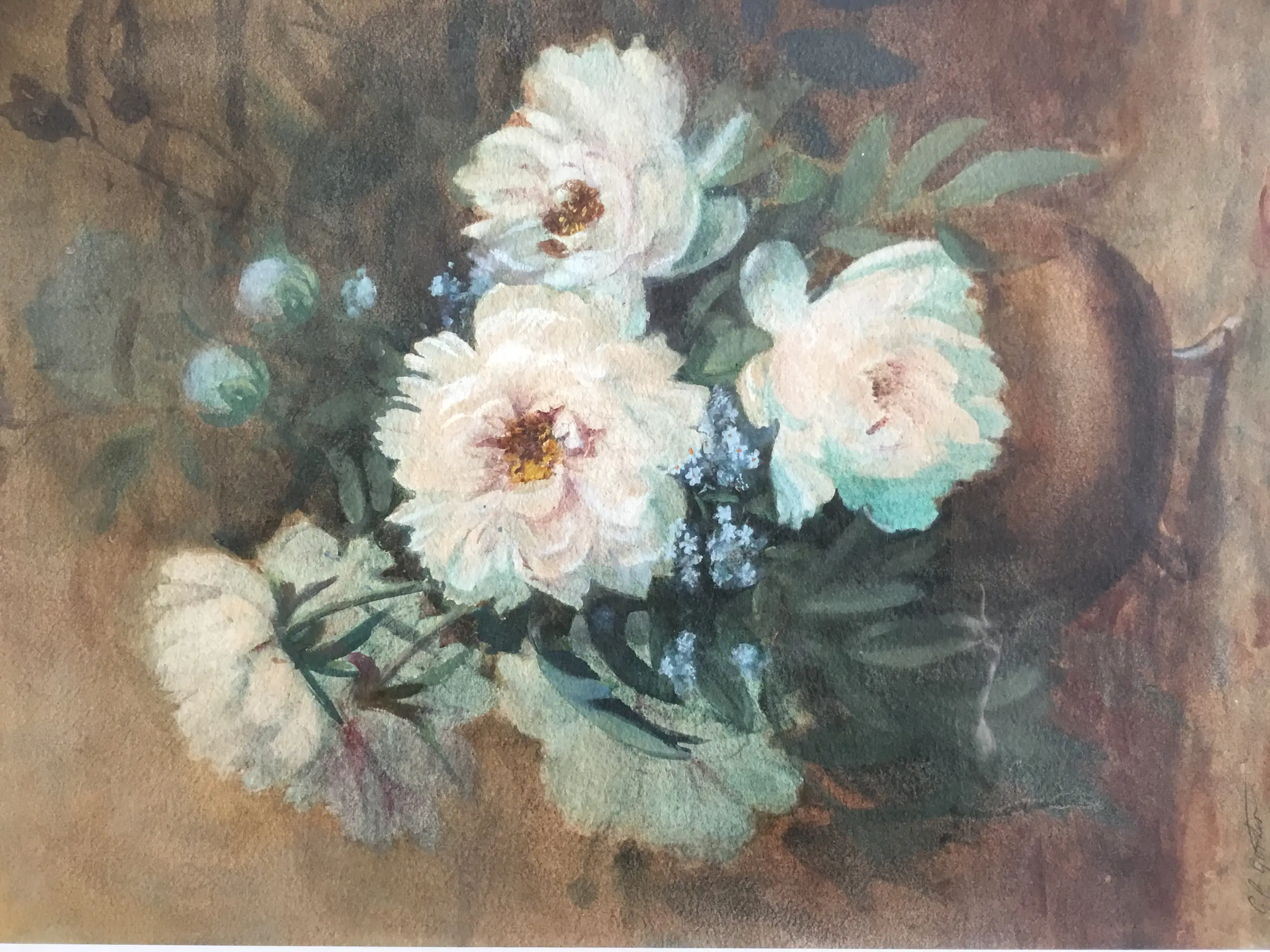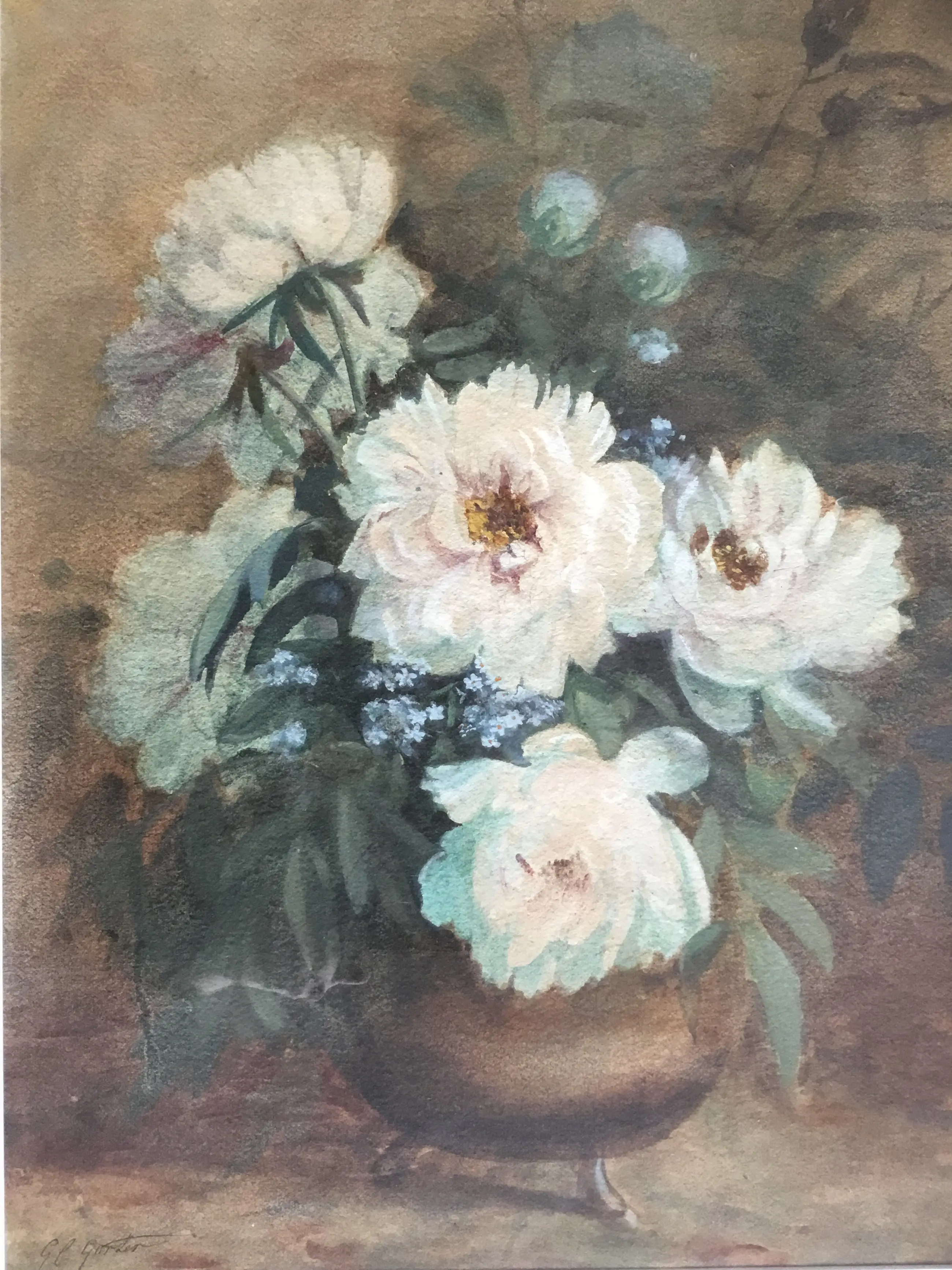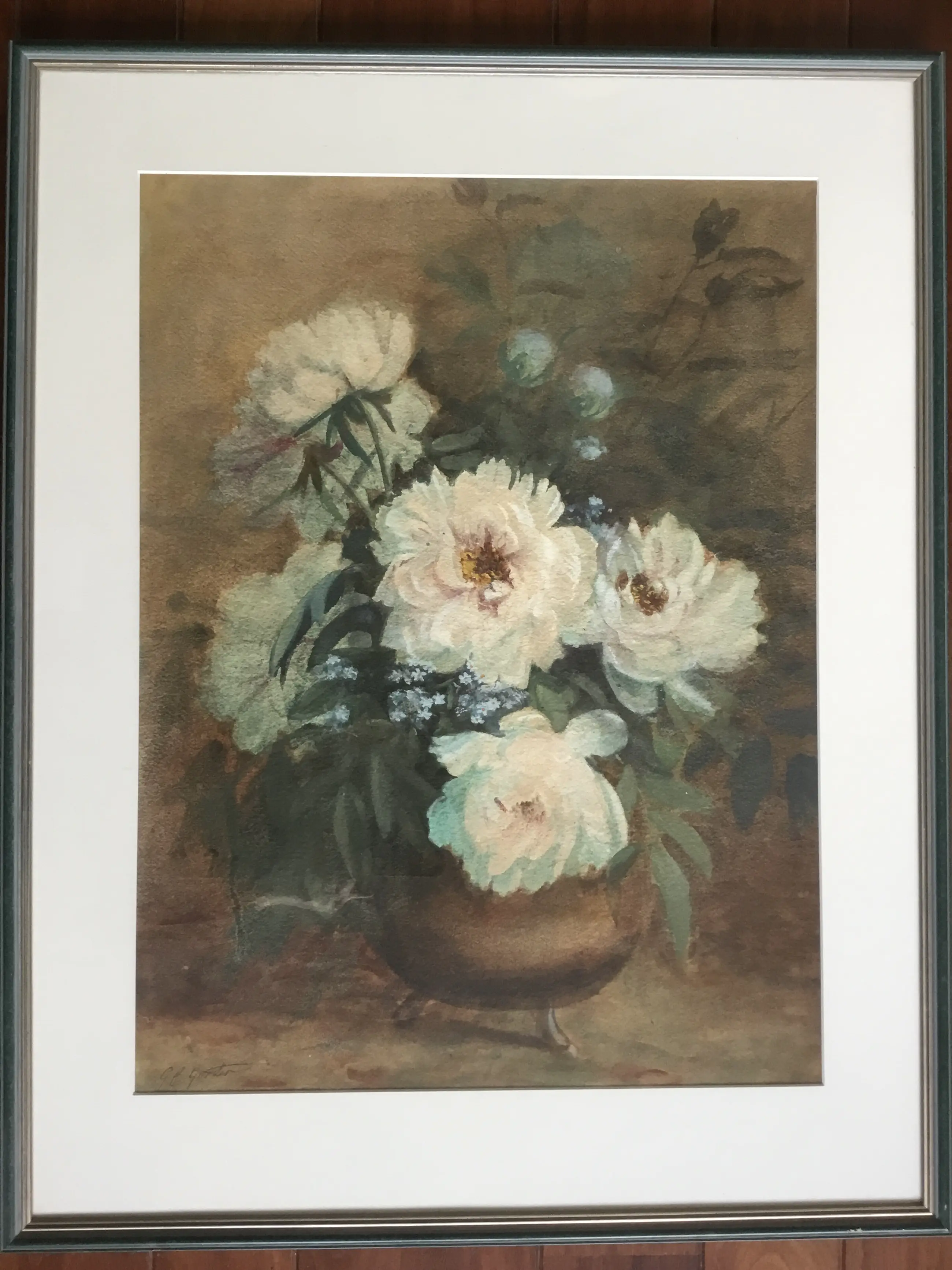Karakteristiek Aquarel pioenrozen op vaas van de Twentse schilderes Geertruida Gorter. Origineel en nog goed omlijst.