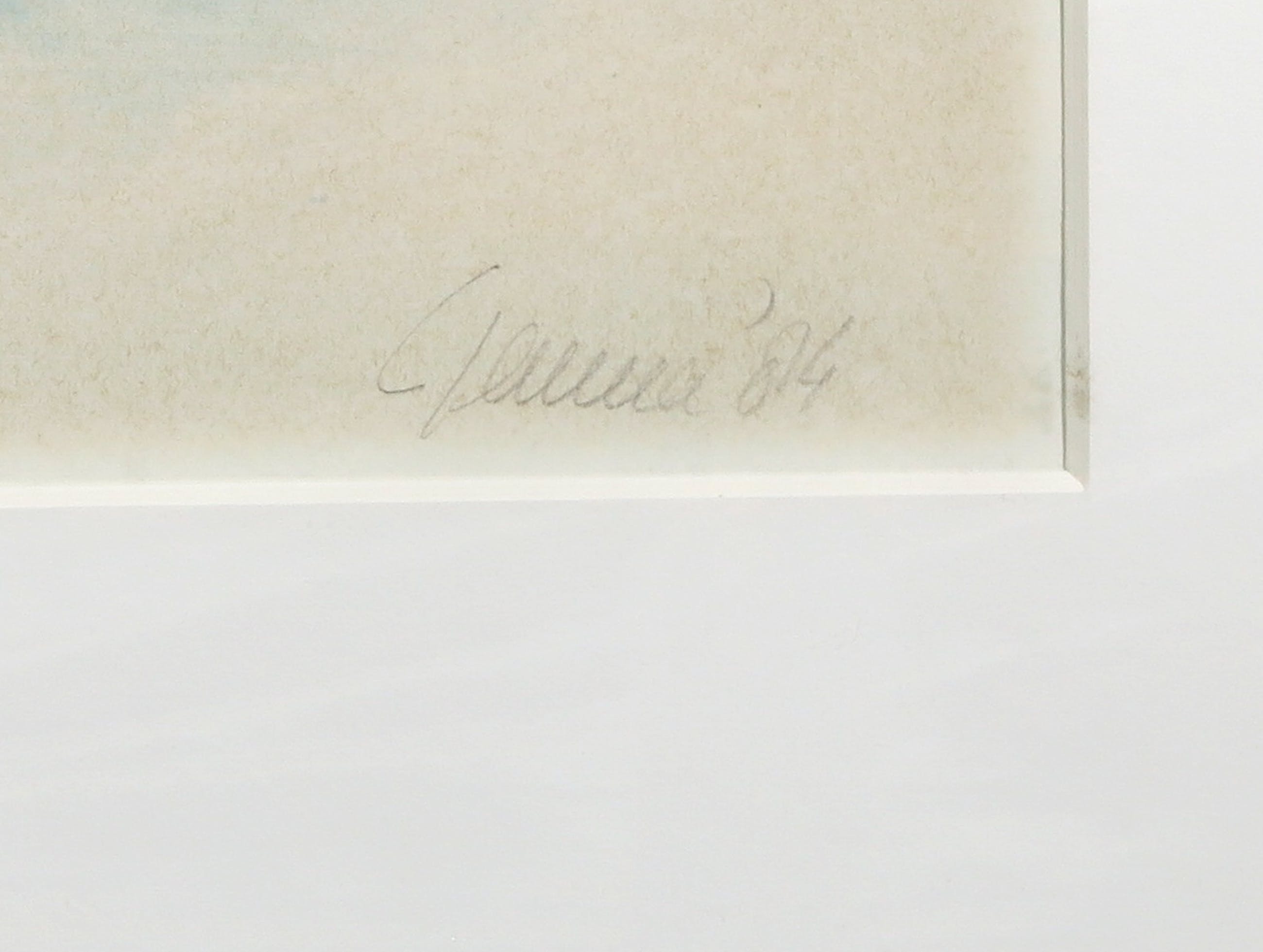 Het papier, en daarmee de kleuren van de aquarel zijn wat vergeeld. Dit is voornamelijk te zien bij de rand van de pas-partout. | |