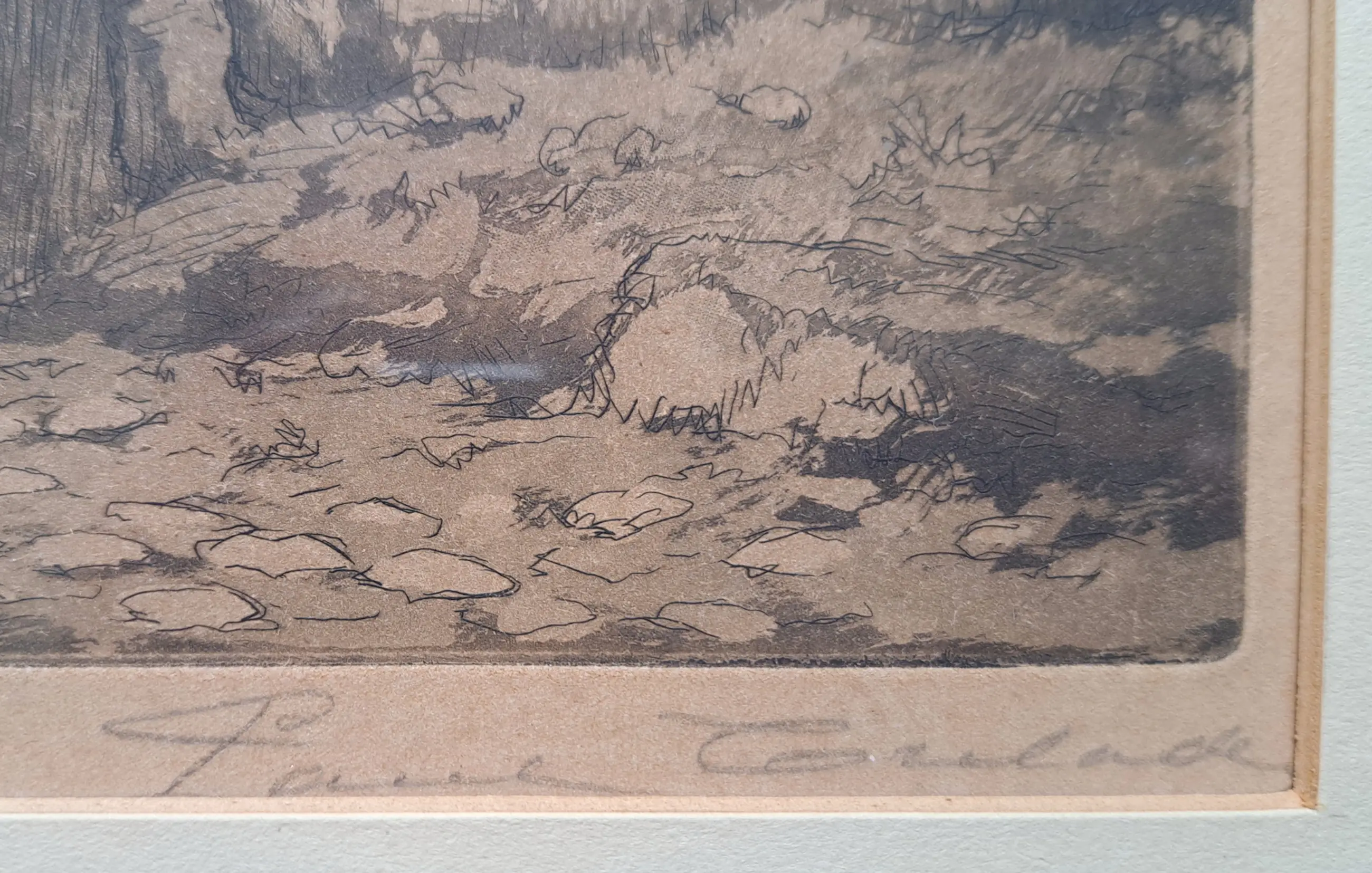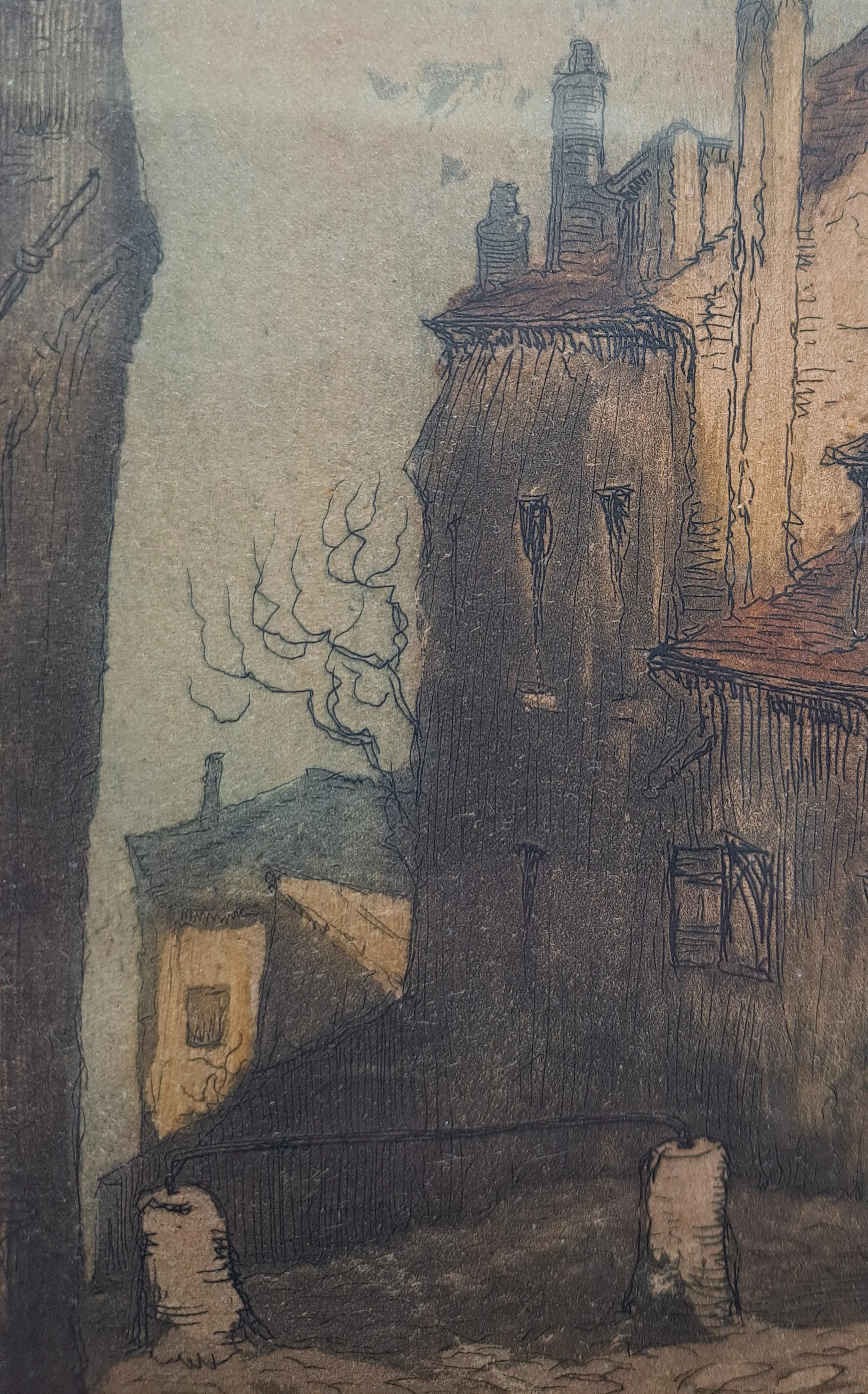 Verfijnde Techniek: Het betreft een aquatint, een grafische techniek die zeer gewaardeerd wordt om zijn schilderachtige effect. In tegenstelling tot harde lijnen, toont dit werk zachte tooneffecten en kleurnuances die doen denken aan een aquarel of gewassen inkttekening.