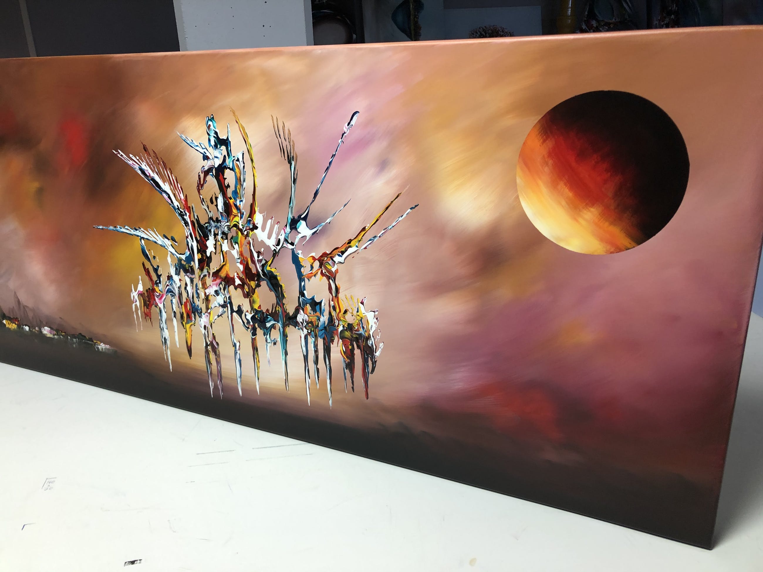 Origineel schilderij van kunstenaar Gena. Wordt geleverd met een certificaat van echtheid. Acrylverf Amsterdam op doek.Zijkanten zijn mee geschilderd, zodat geen lijst nodig -direct op te hangen.Het schilderij is voorzien van een vernislaag, dus extra beschermd tegen stof, vuil en vochtinvloed! Formaat 60x140cm3D