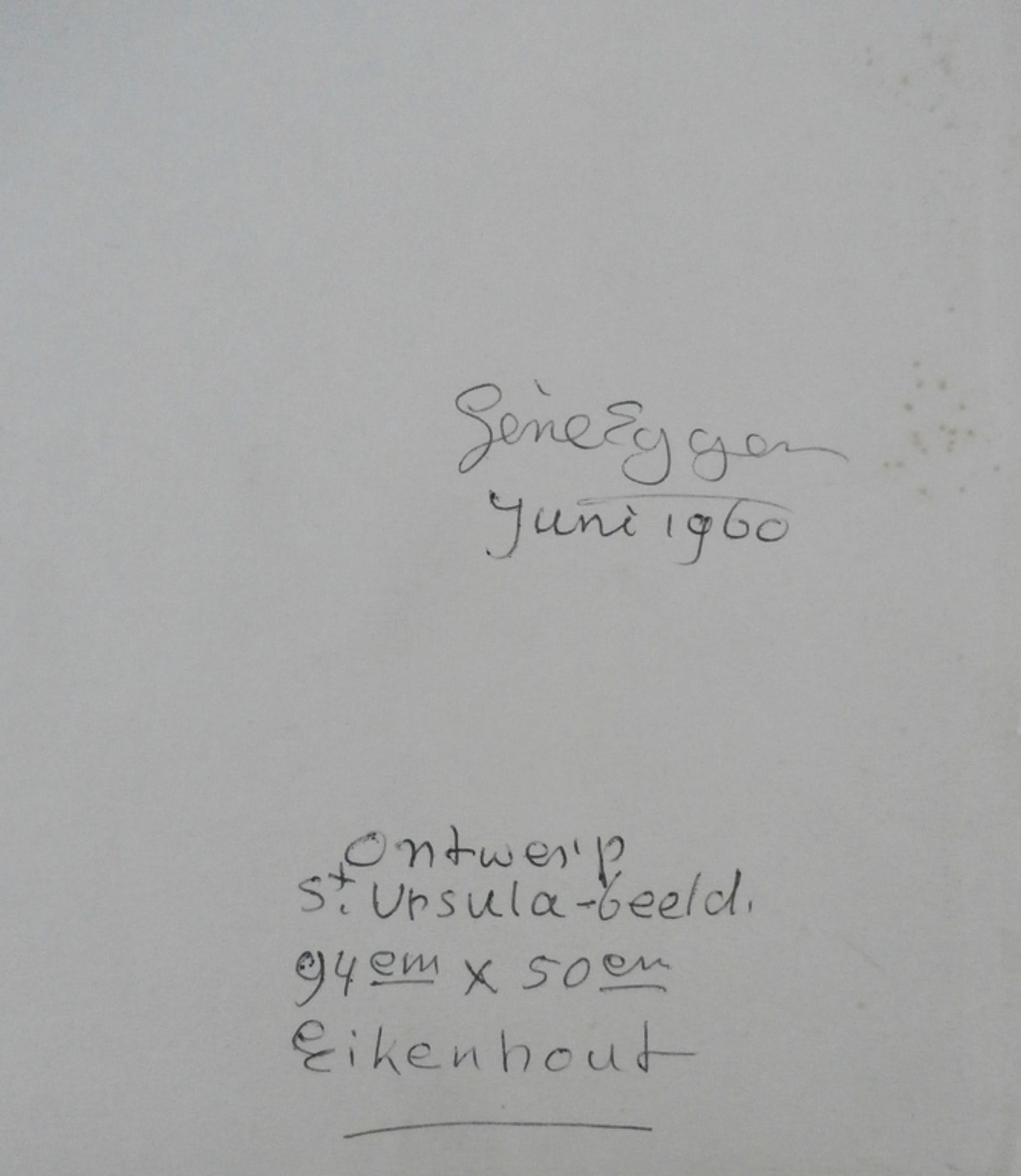 Aquarel van Gene Eggen. Het betreft het ontwerp voor het St. Ursula beeld. Jaar: 1960 (juni). Afmetingen aquarel: H33 x b25 cm. Afmetingen totale blad: H 33 x b 50 cm. Het werk is op de achterzijde gesigneerd. De authenciteit van dit werk wordt voor 100% gegarandeerd. Een certificaat kan, op aanvraag, worden meegeleverd.