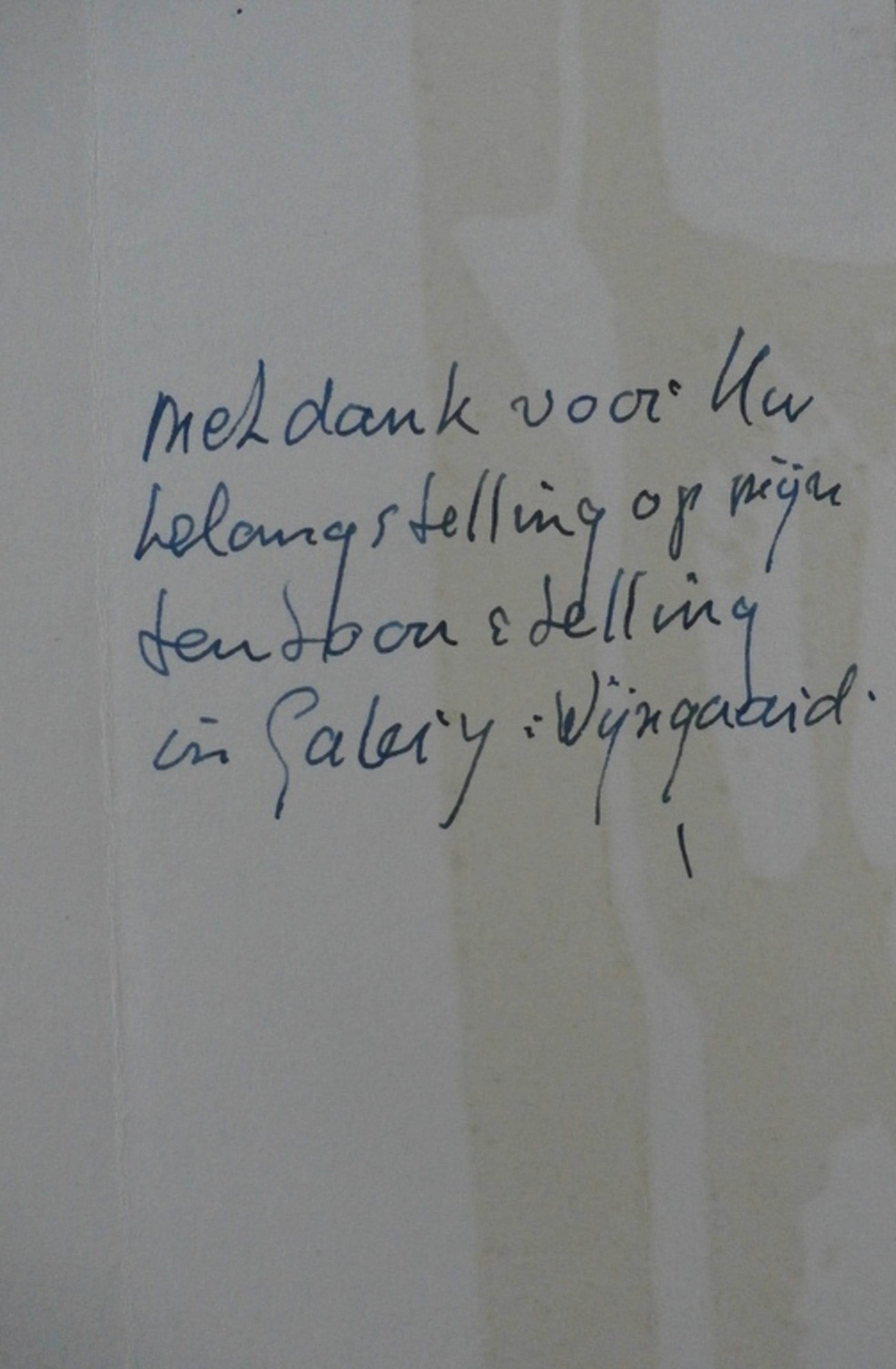 Houtsnede van Gene Eggen naar aanleiding van een tentoonstelling in Galerie Wijngaard. in 1971. Afmetingen: H 27,3 x b21,5 cm. Tekst: Met dank voor uw belangstelling op mijn tentoonstelling in Galery: Wijngaard. Met potlood gesigneerd en gedateerd.