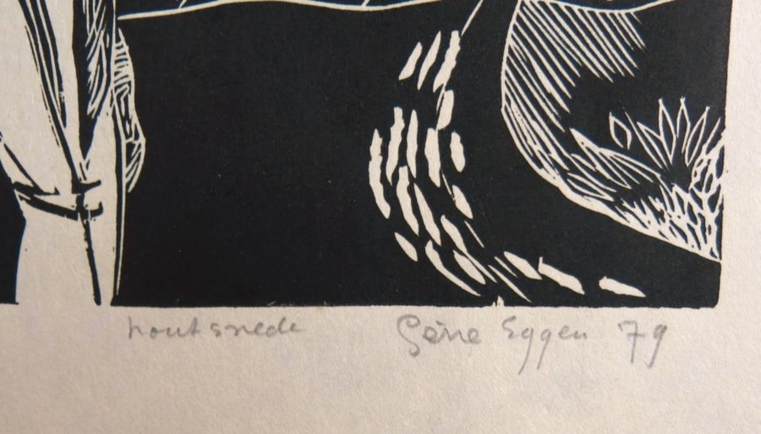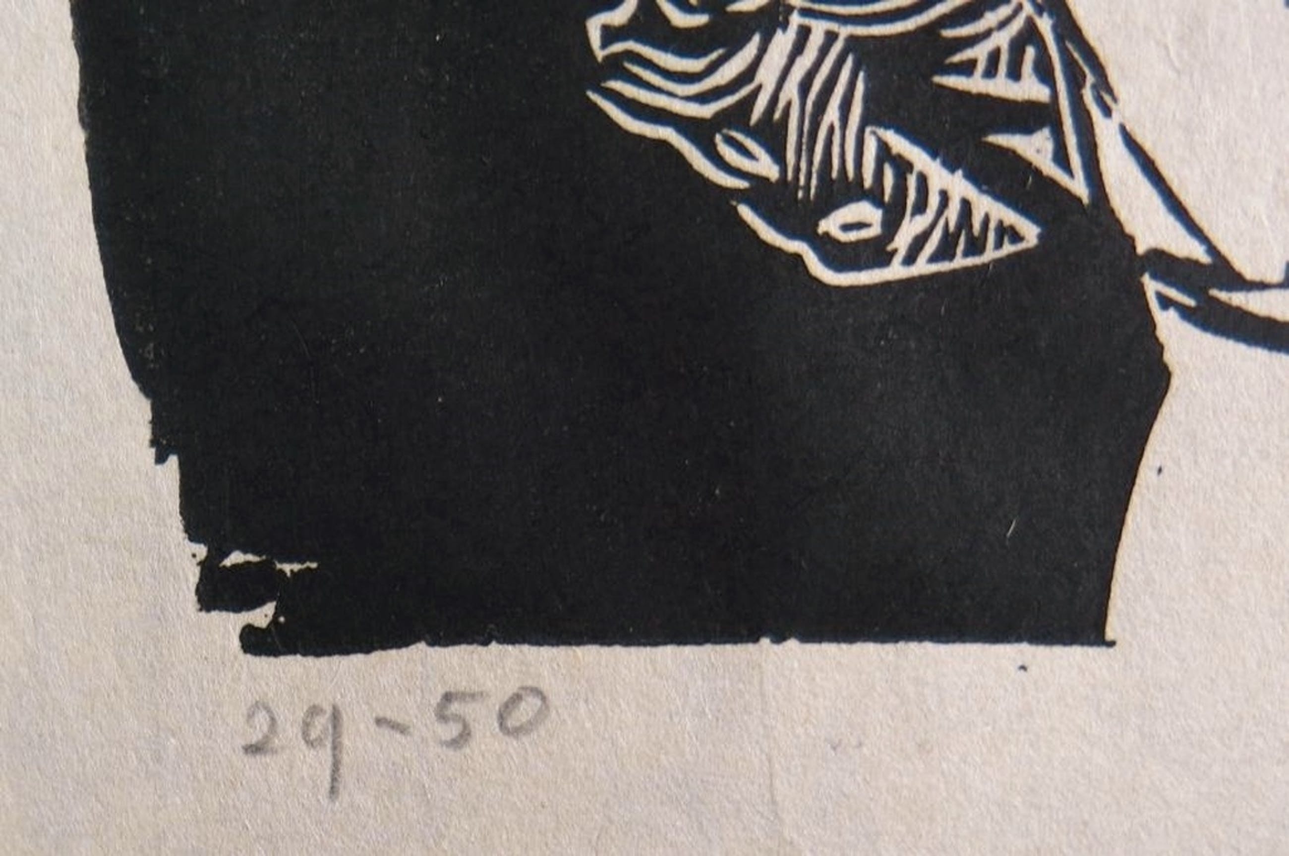 Materiaal: Houtsnede op dun geschept papier (toont wit op de foto, maar werkelijk geler papier)