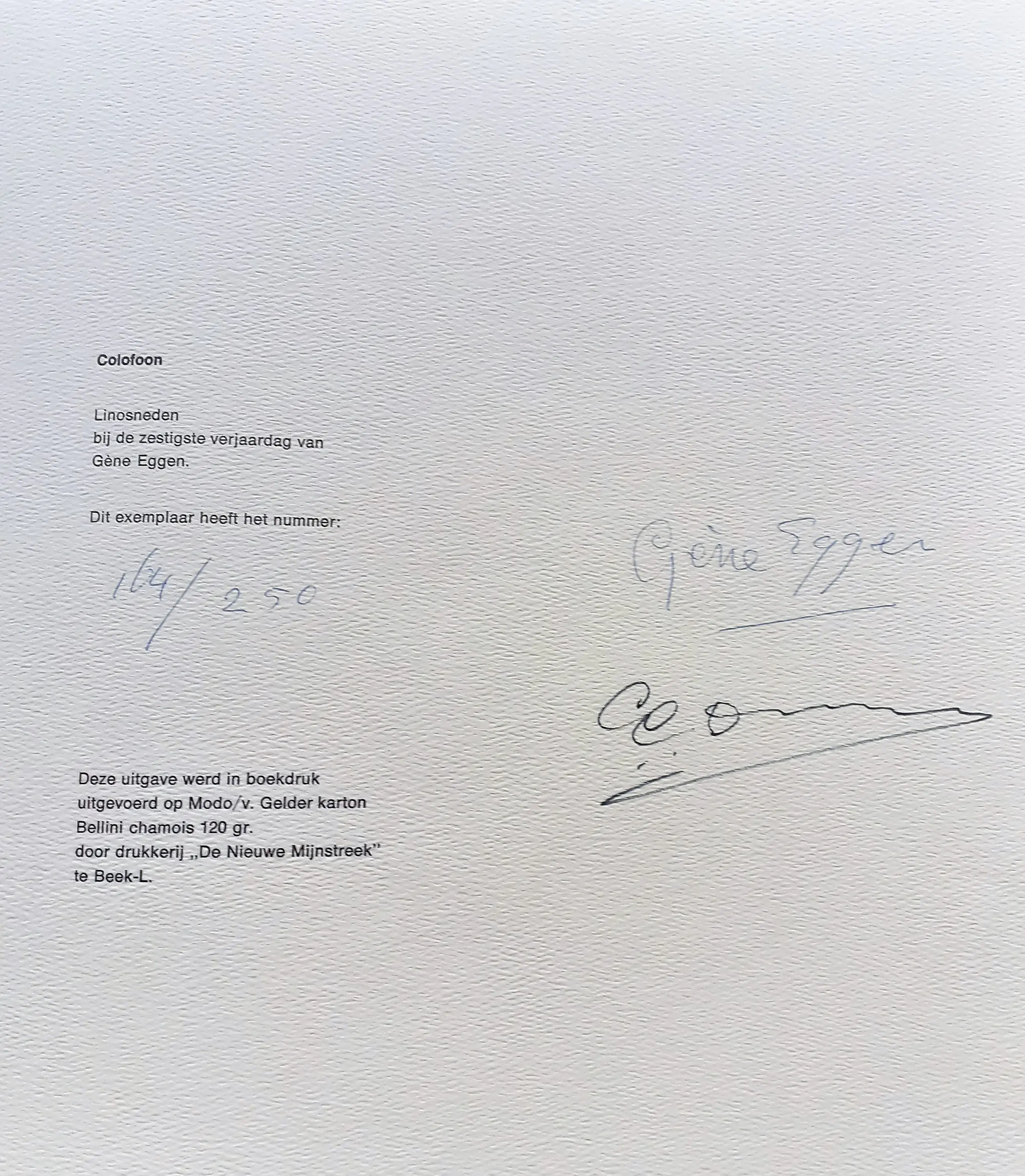 Monografie Gene Eggen door Cath. Dudok van Heel tgv 60e verjaardag van Eggen Incl. linosneden Gesigneerd door Eggen en Dudok van heel Genummerd 164/250