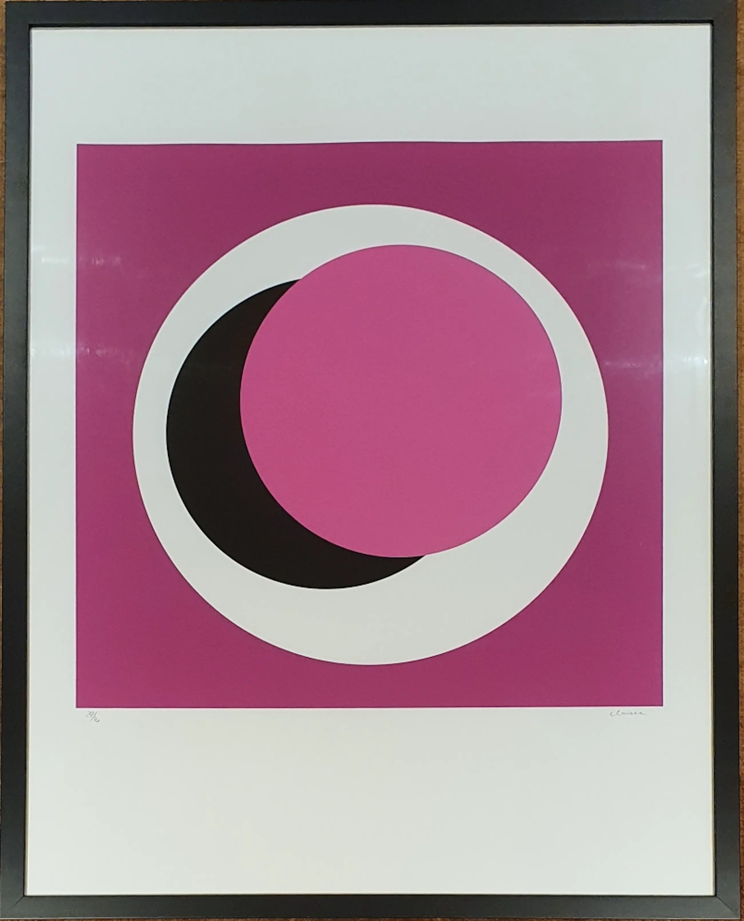Mooie compositie van Geneviève Claisse (1935-2018) gebaseerd op haar origineel werk 'Cercles' uit 1968. Het werk is ingelijst. Afmetingen inclusief lijst: 84 x 65 cm. Het werk is gesigneerd en genummerd 29/40.