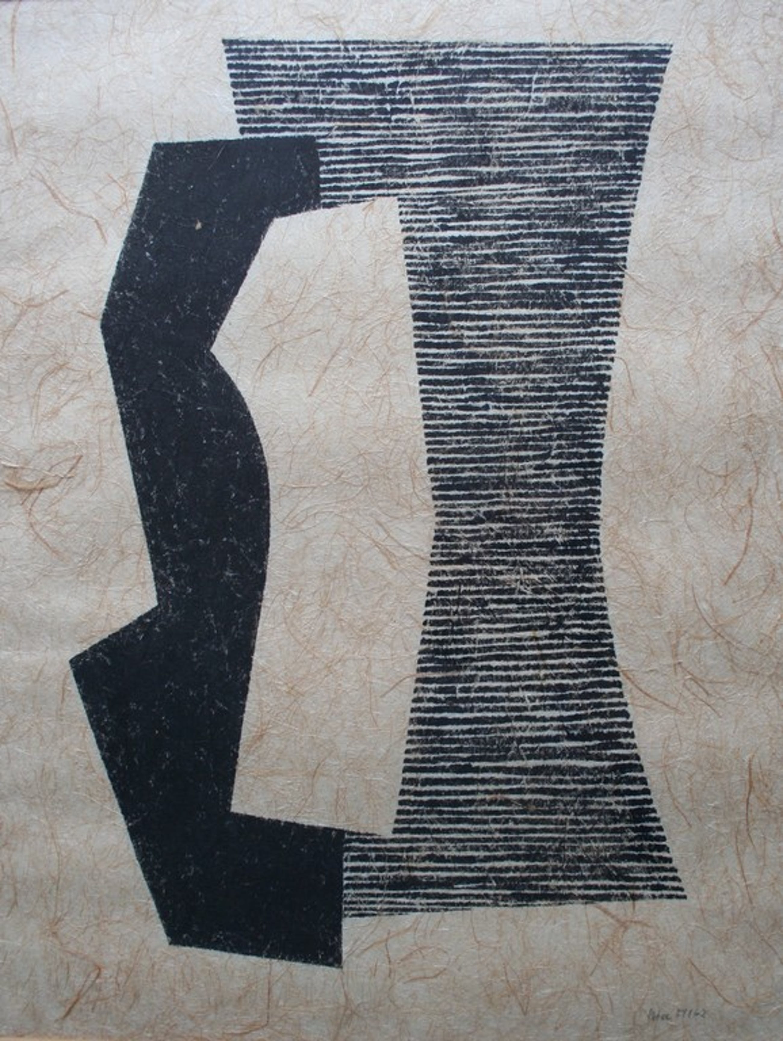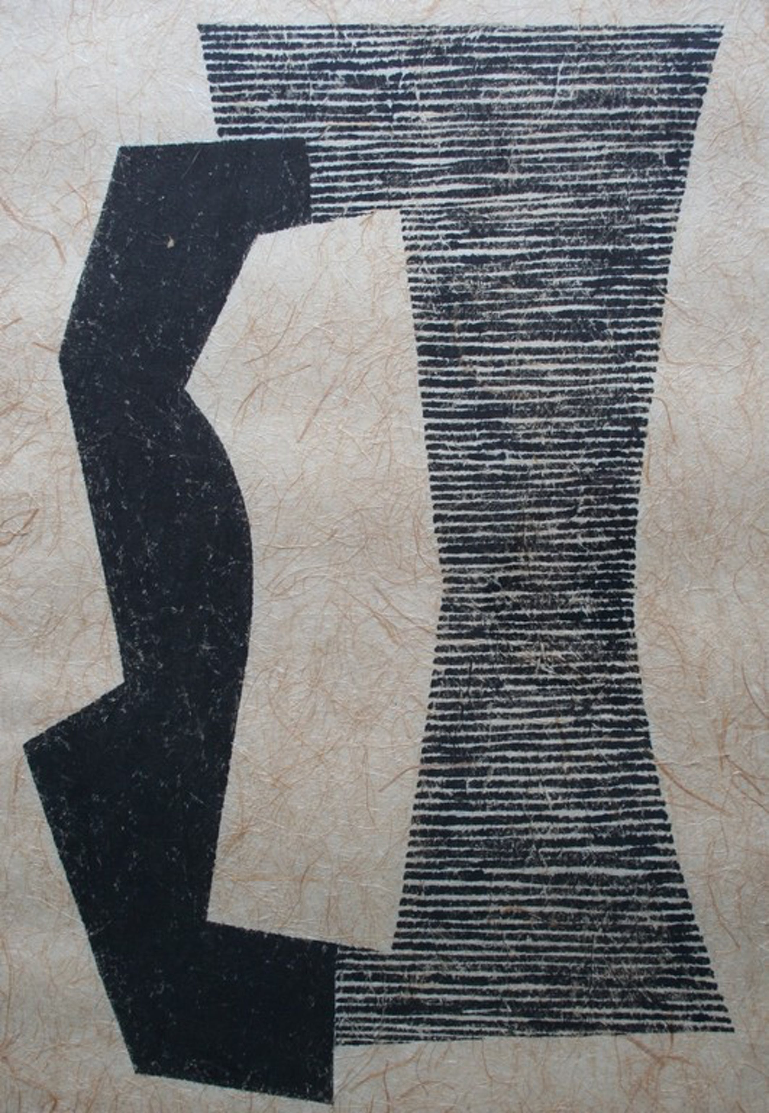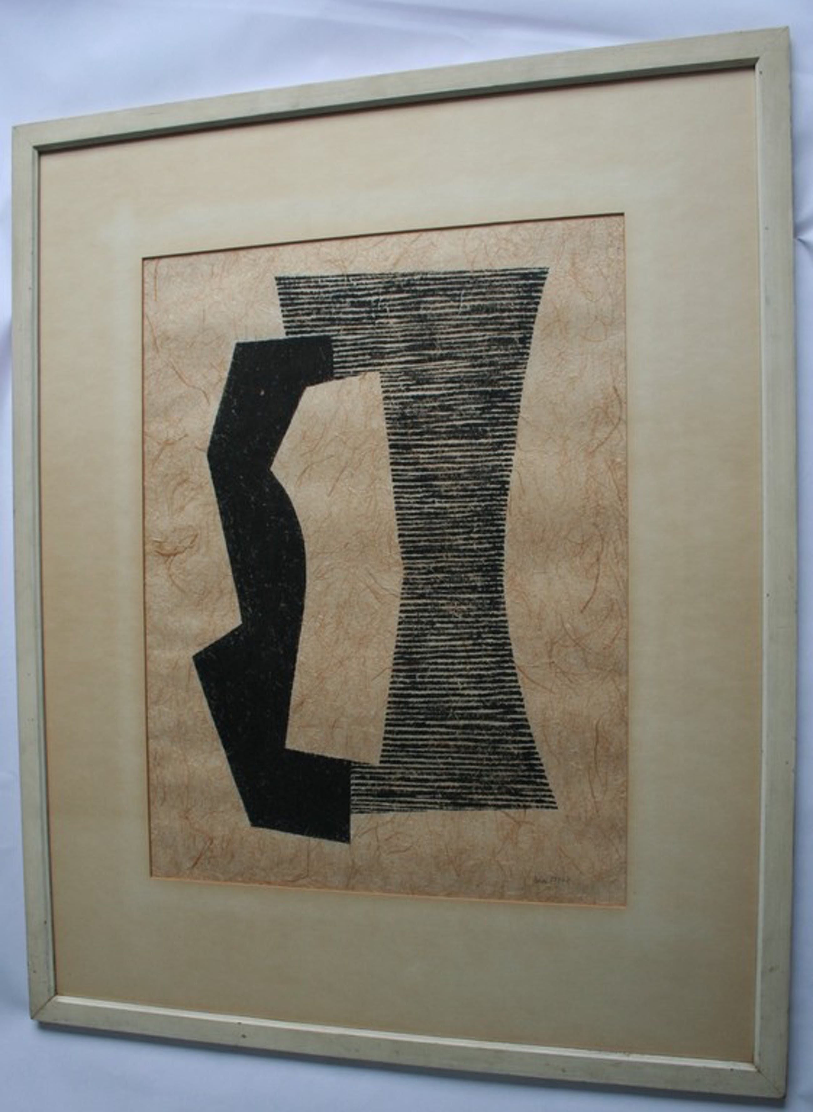 Mooie houtdruk van Geni Peter op speciaal grof vezelrijk papier. Bijzonder werk.
