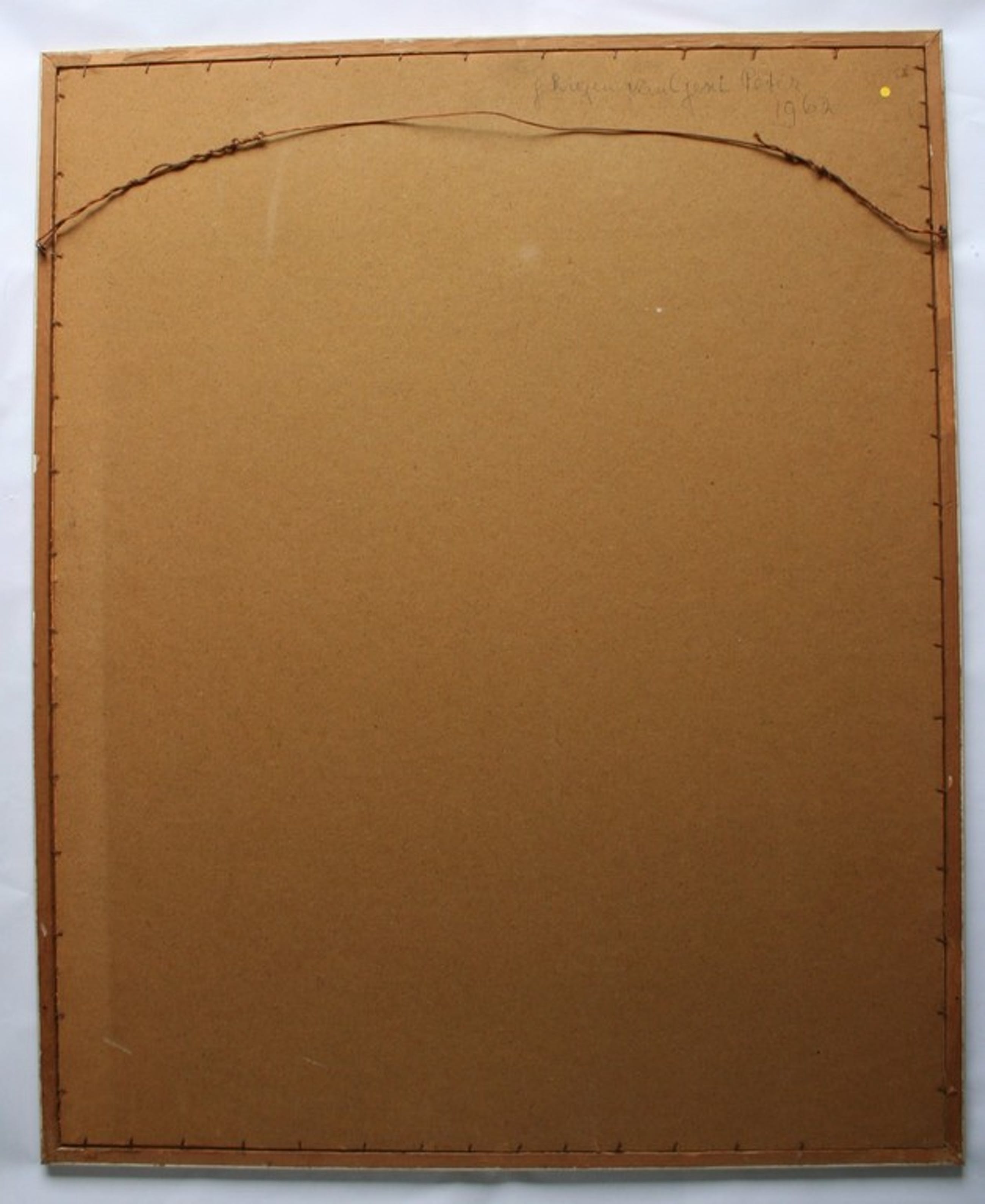 Ingelijst onder glas en passe partout in een houten lijst. Aan de achterzijde staat: gekregen van Geni Peter in 1962.