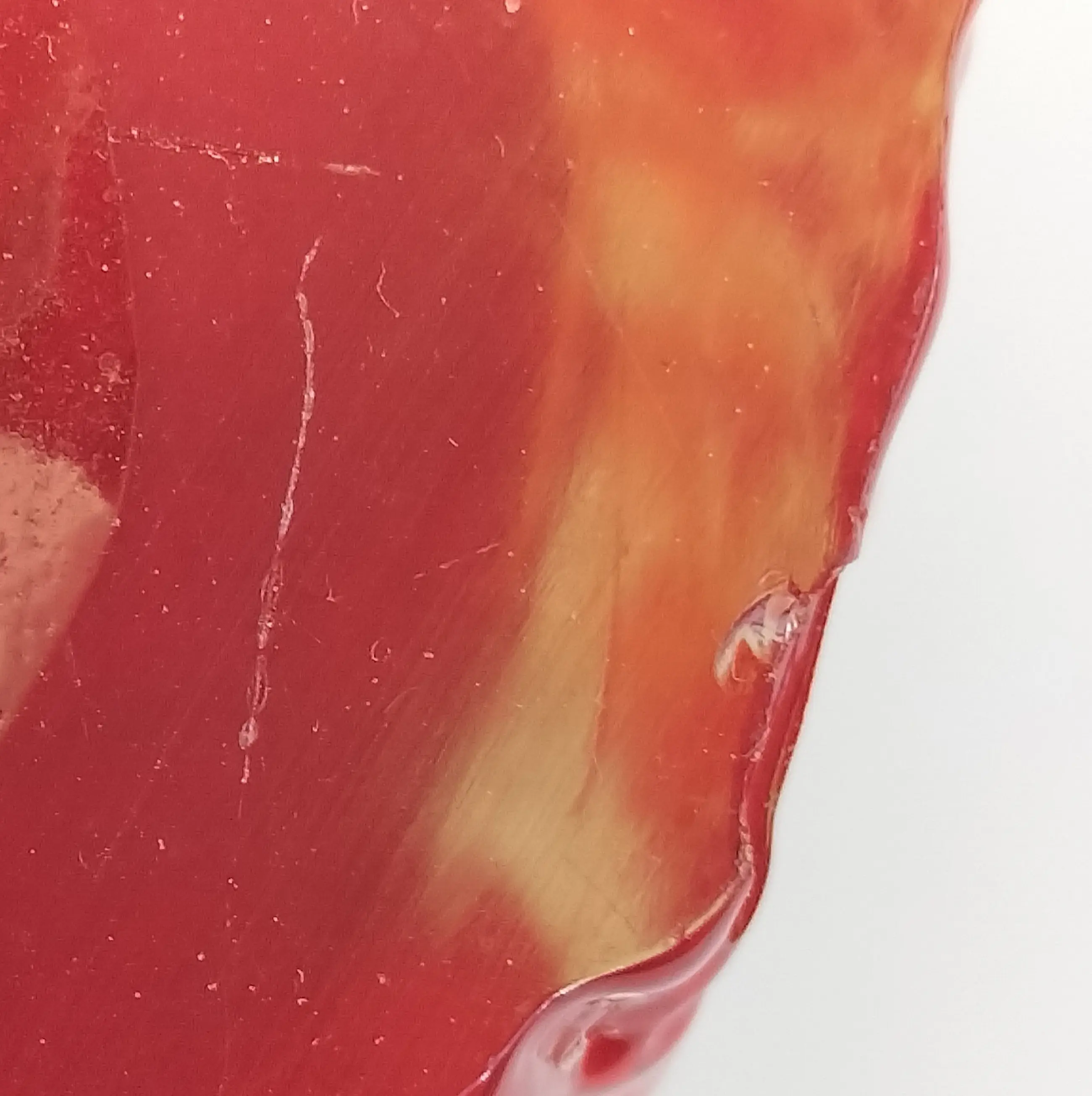 Een prachtig verloop van een diepe robijnrode kleur bij de bodem, oplopend naar lichter naar boven toe en tenslotte bij de bovenkant transparant helder glas, zichtbaar gemaakt op drie opeenvolgende foto's.