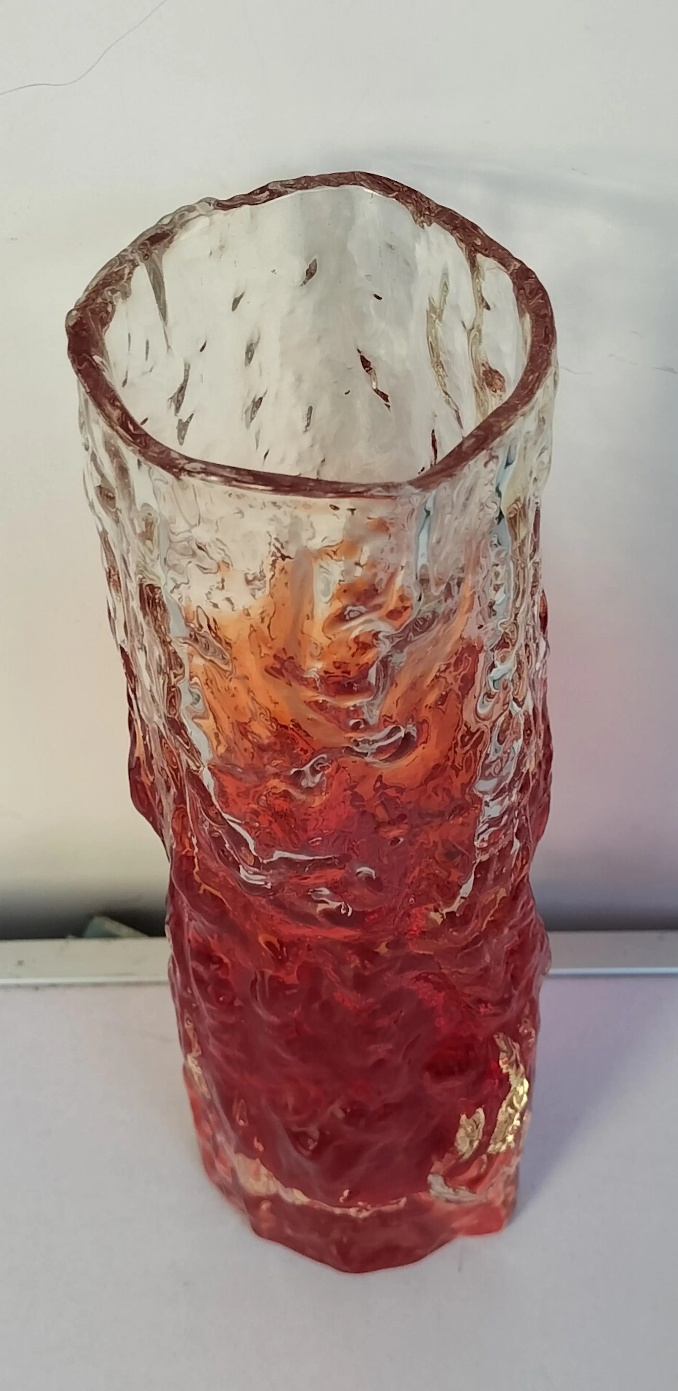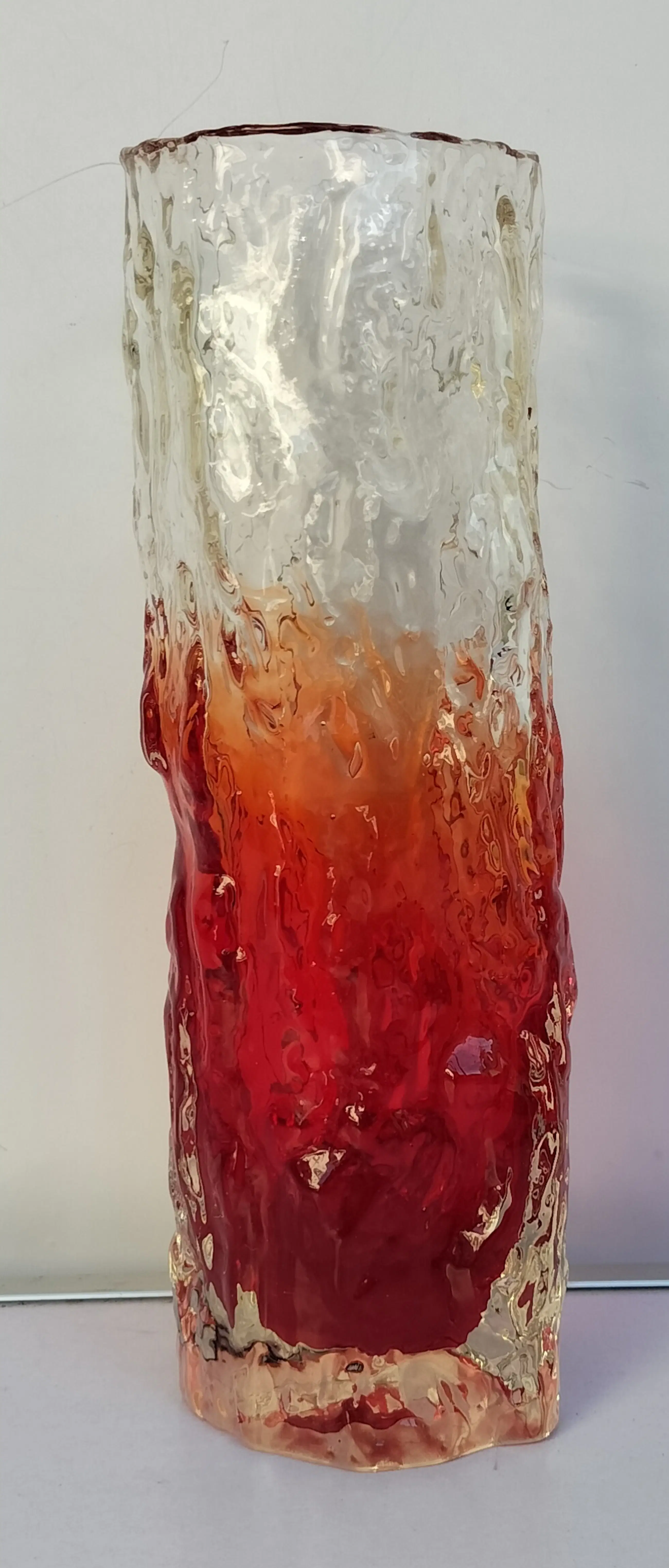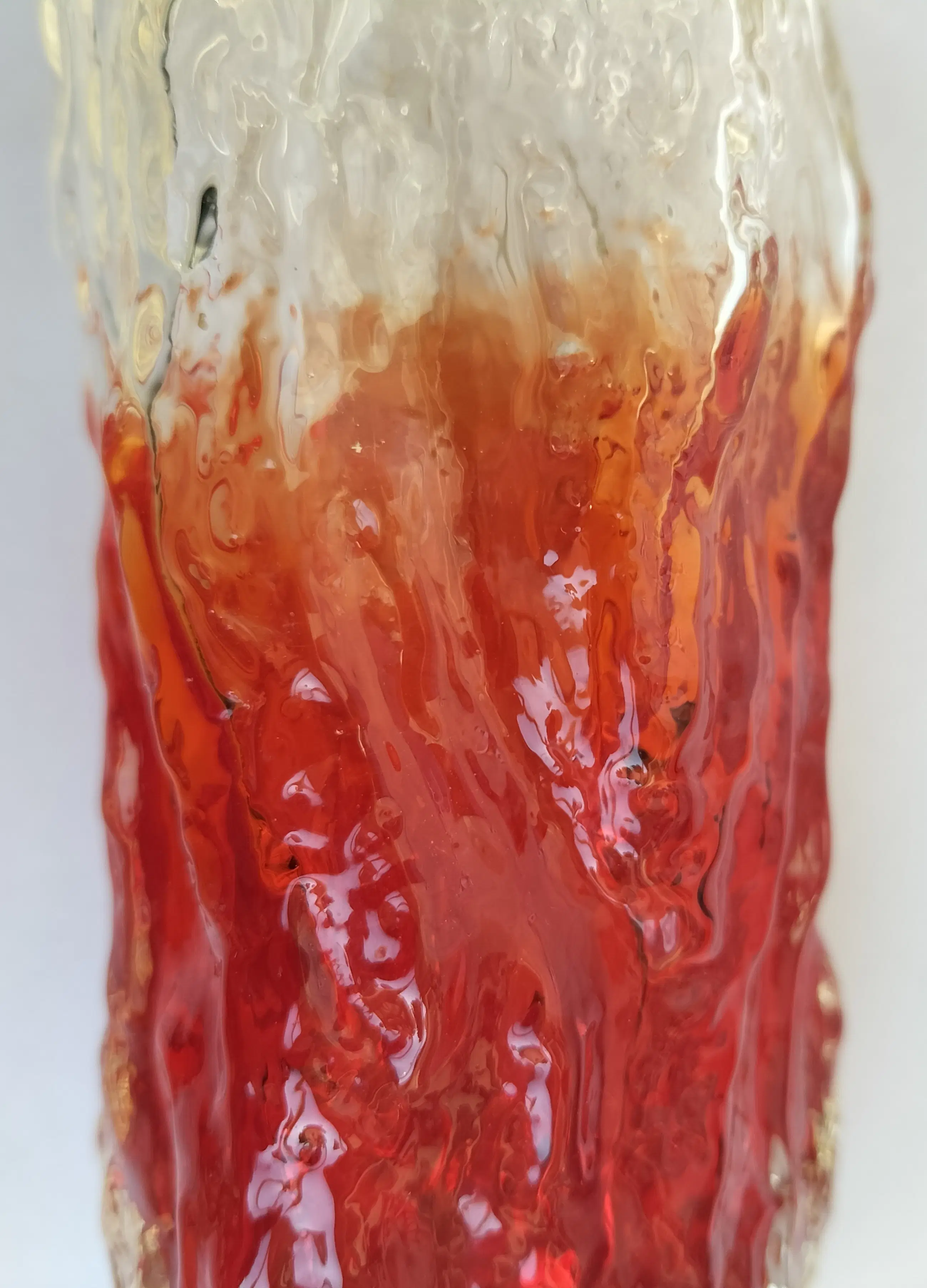 Zeer fraaie vaas van Geoffrey Baxter voor Whitefrairs Glasfabriek, Engeland. De vaas dateert uit de jaren 1960/1970 en het stevige glas heeft een aparte "boomschors-structuur"., voelbaar en zichtbaar.