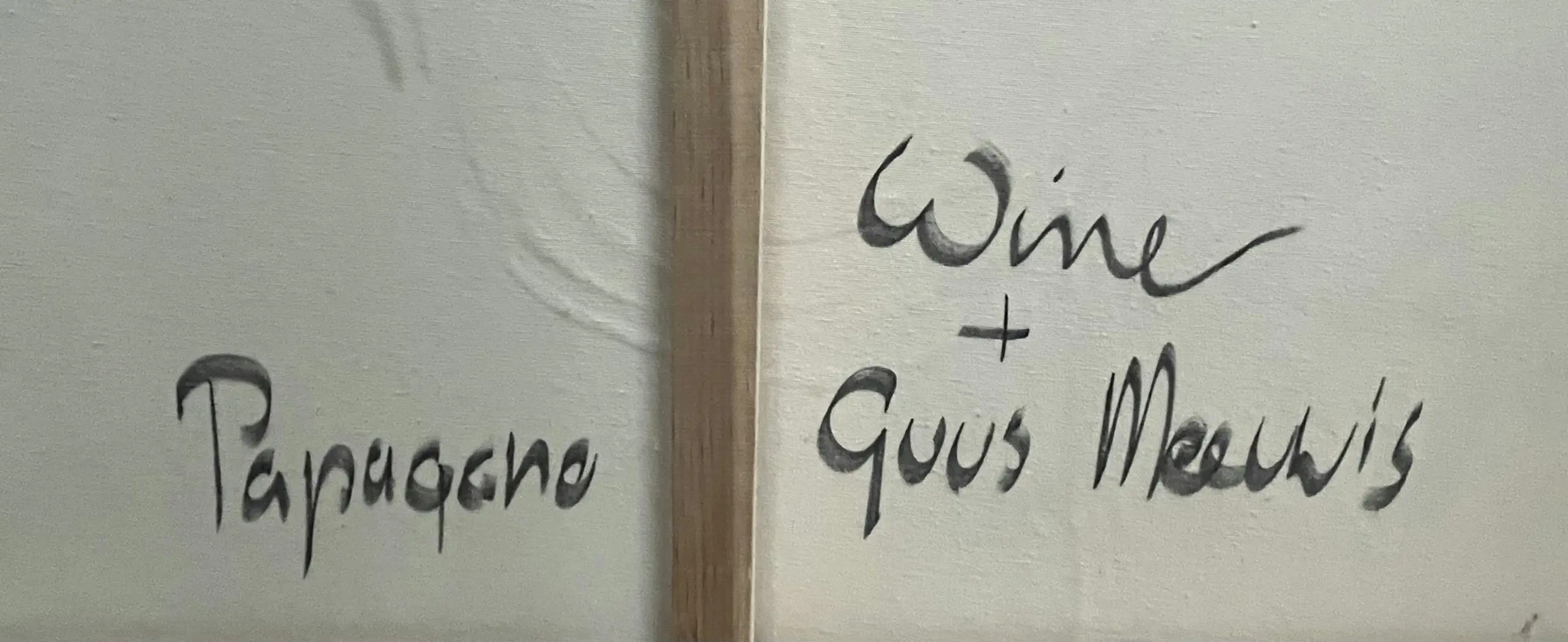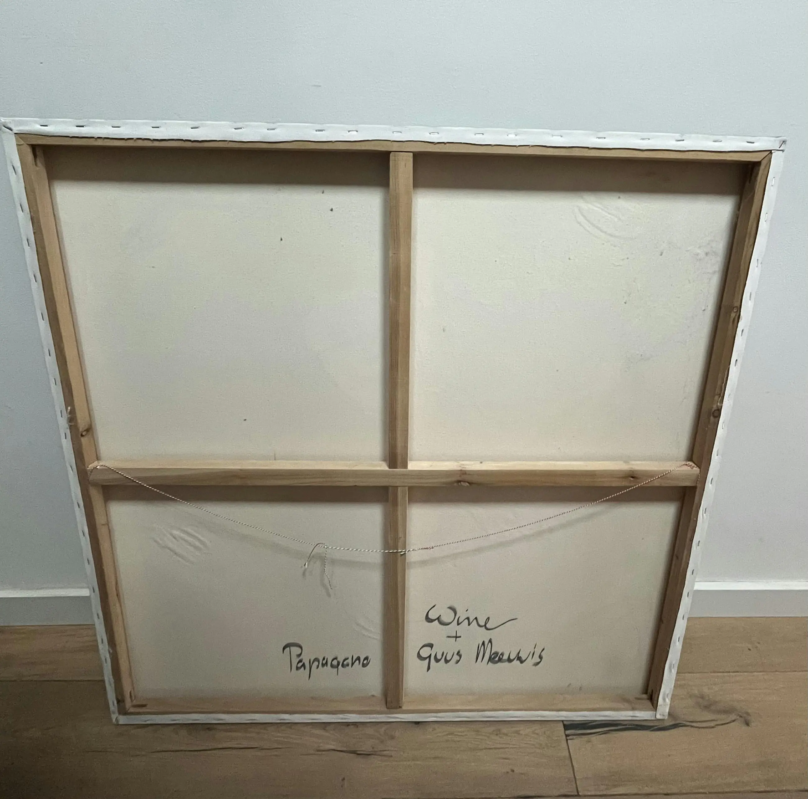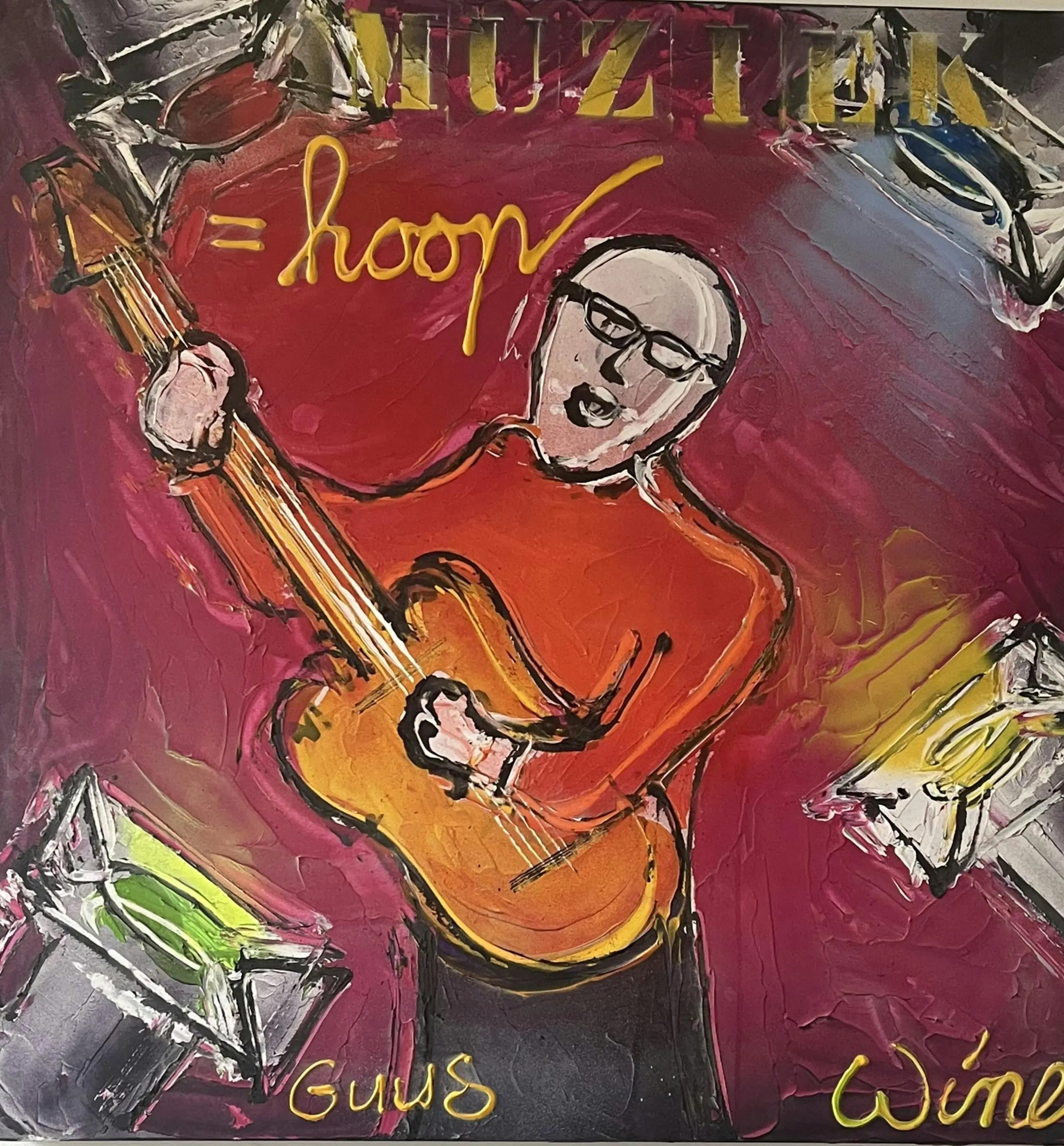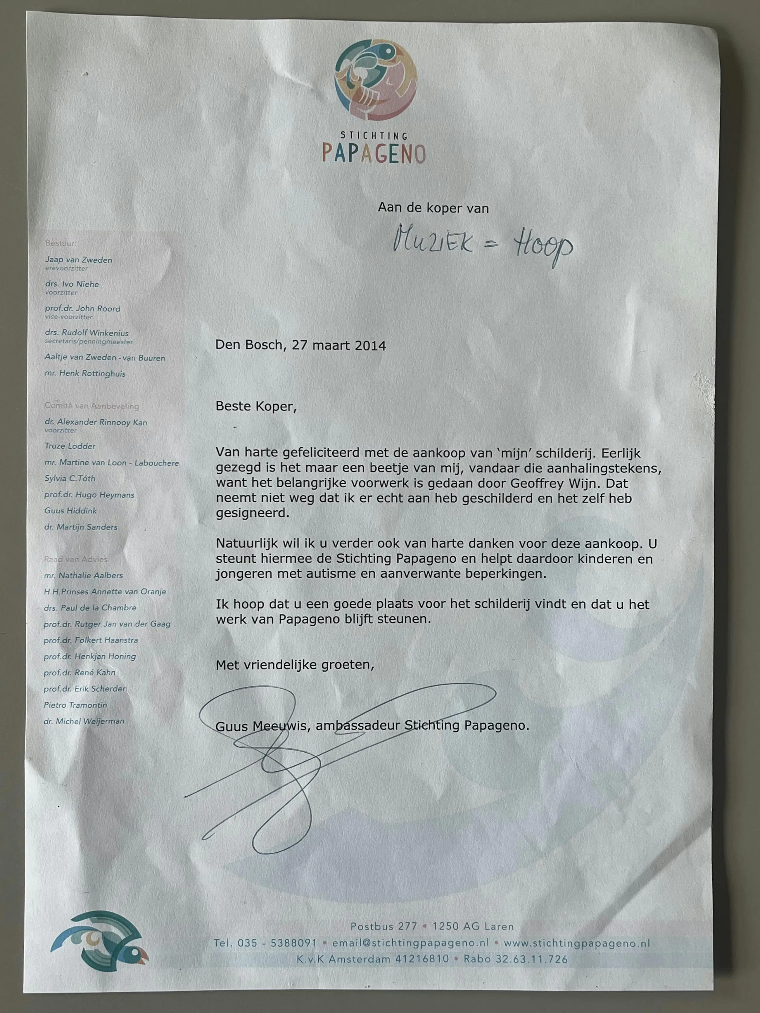 Dit unieke schilderij met als titel “Muziek = Hoop”, is ontstaan uit een samenwerking tussen Guus Meeuwis en beeldend kunstenaar Geoffrey Wijn (Wine) met als doel om geld in te zamelen voor de Stichting Papageno, waar Meeuwis ambassadeur van is. Dat heeft plaatsgevonden in 2014. De eigenaar heeft er onlangs afstand van gedaan.