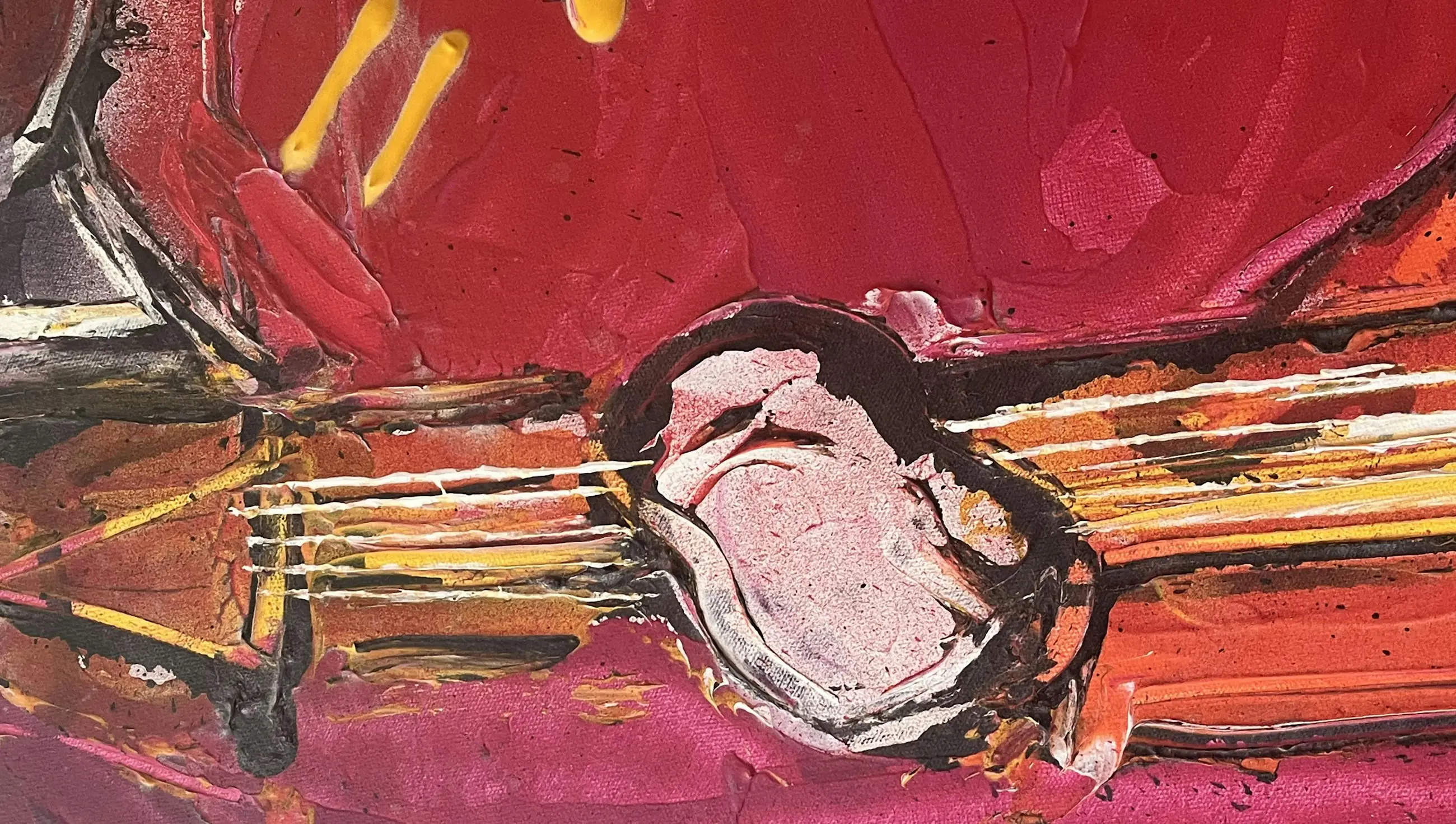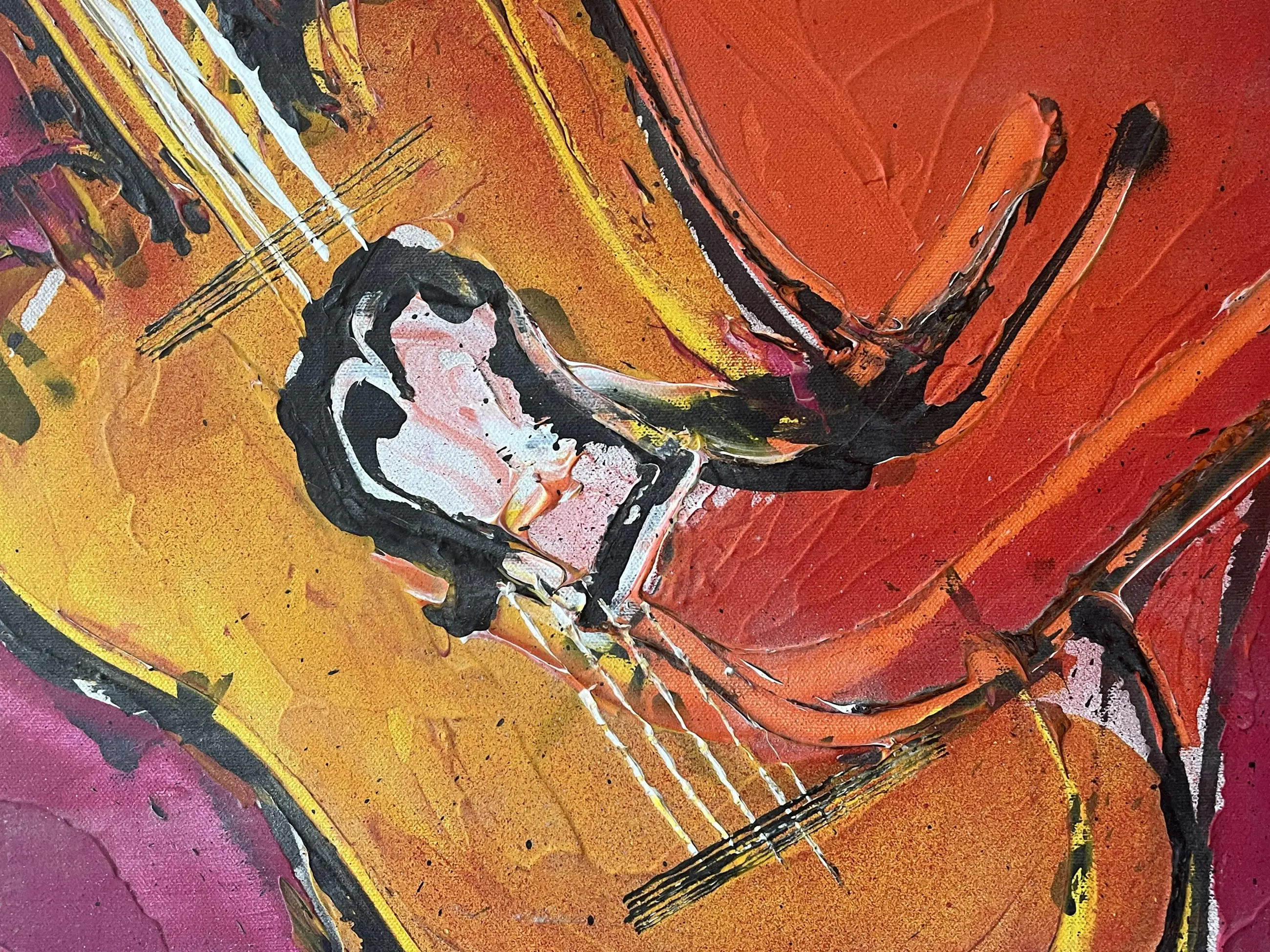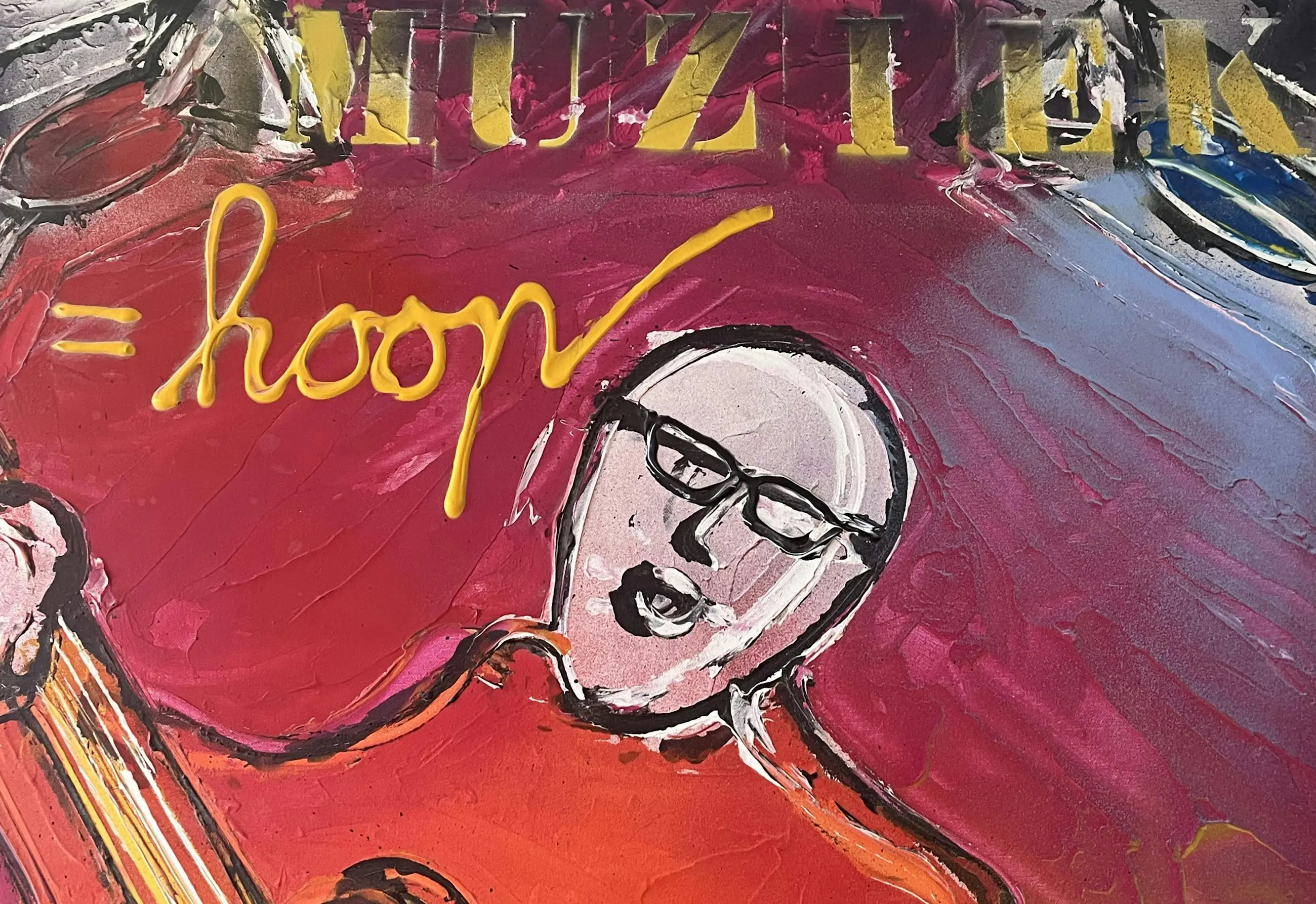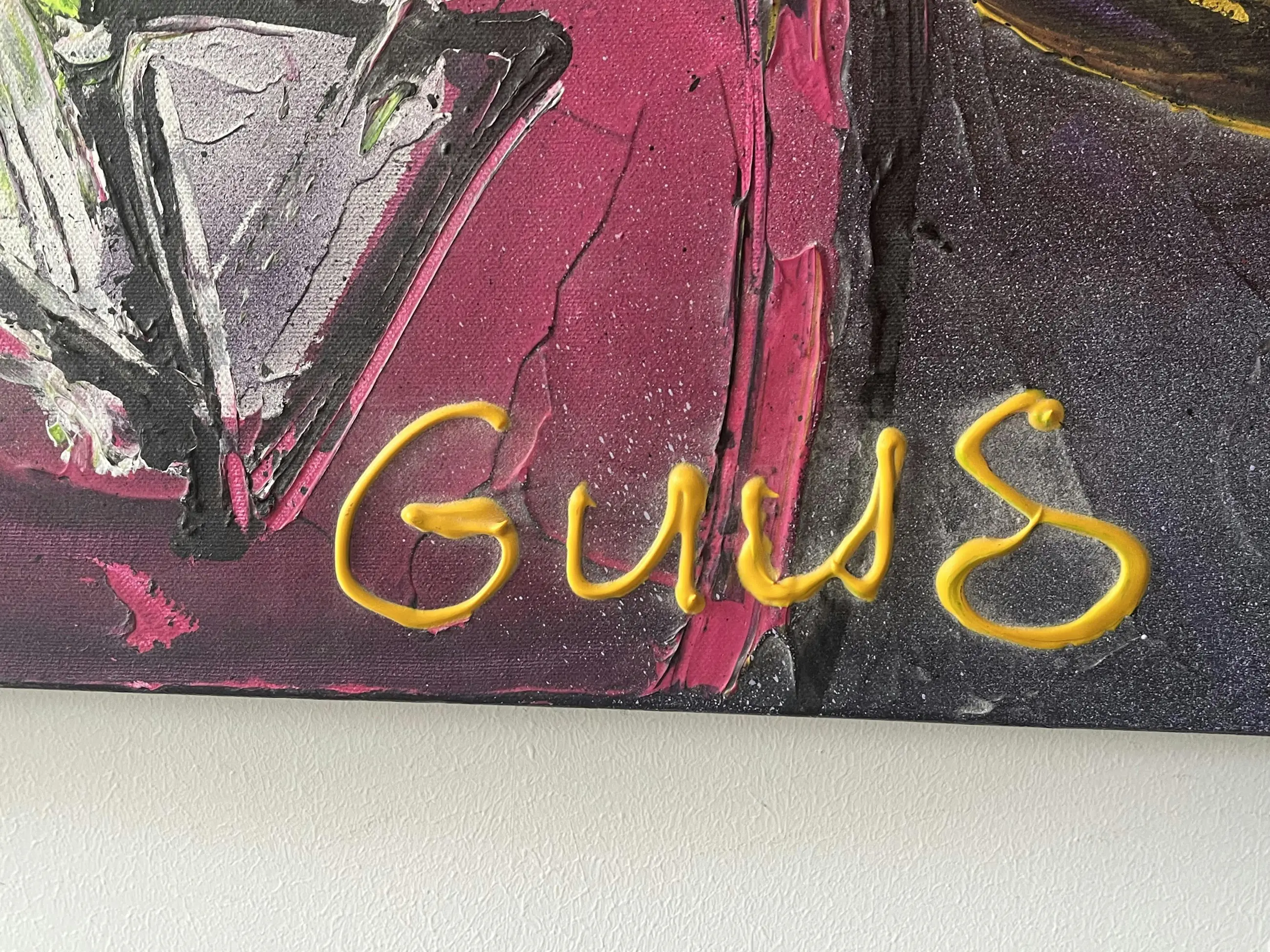 Dit unieke schilderij met als titel “Muziek = Hoop”, is ontstaan uit een samenwerking tussen Guus Meeuwis en beeldend kunstenaar Geoffrey Wijn (Wine) met als doel om geld in te zamelen voor de Stichting Papageno, waar Meeuwis ambassadeur van is. Dat heeft plaatsgevonden in 2014. De eigenaar heeft er onlangs afstand van gedaan.
