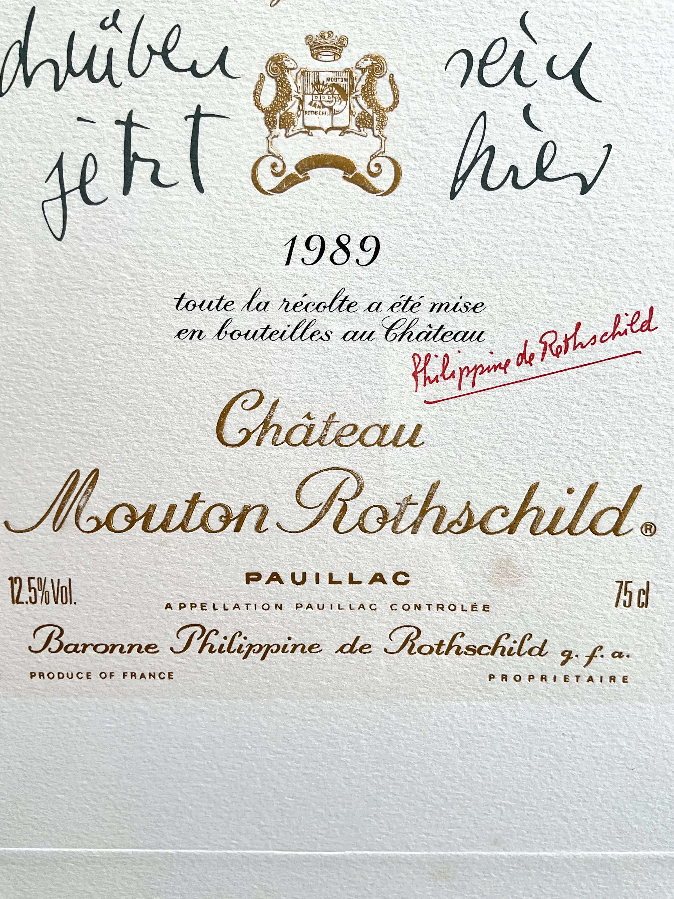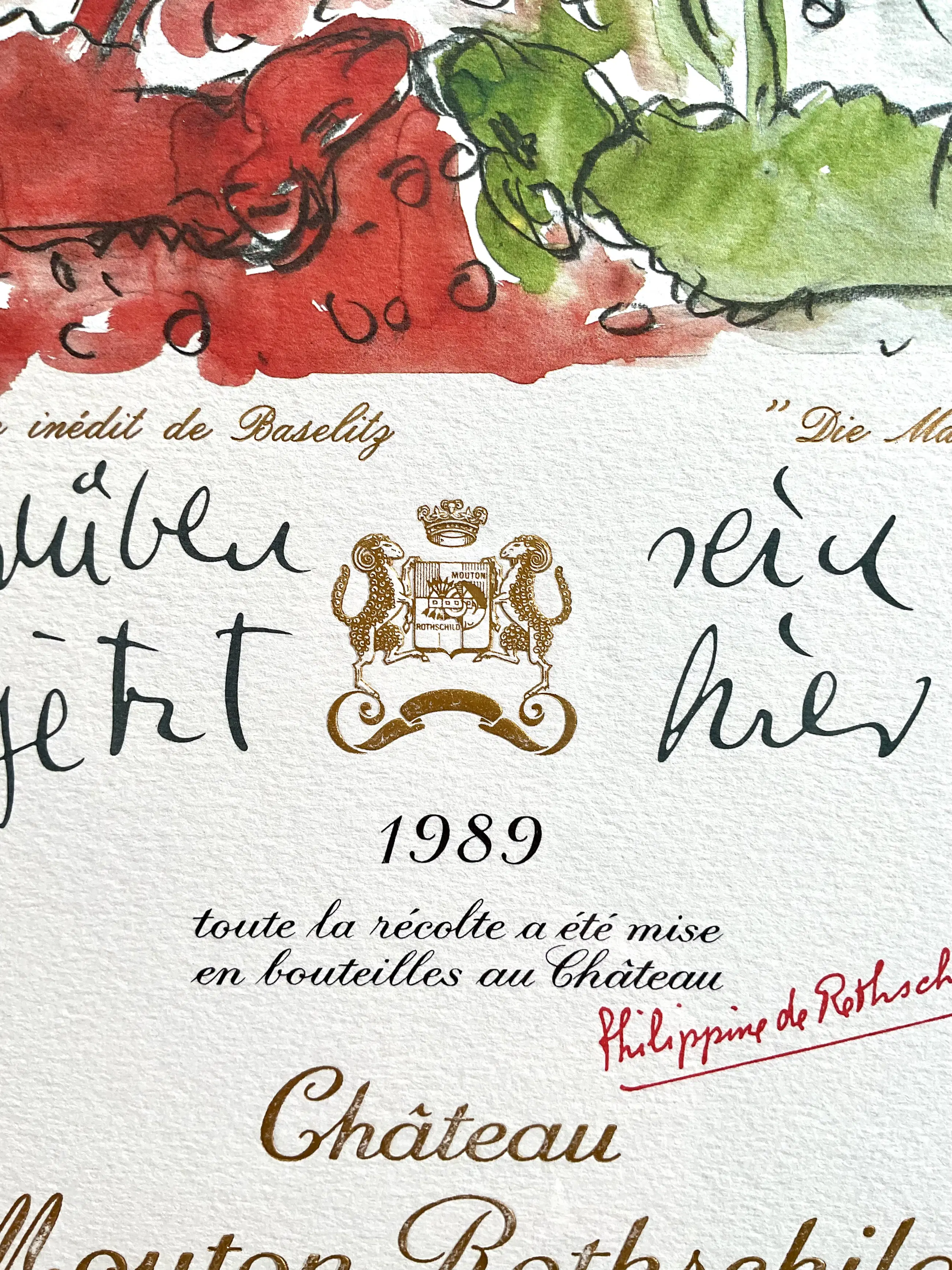 De twee omgekeerde rammen op de Mouton Rothschild 1989-etiketten worden geassocieerd met de schokkende gebeurtenis van 1989: de afbraak van de Berlijnse muur. Rondom de heraldiek staan de woorden "Drüben sein jetzt hier" - "Daar is nu hier" een nieuw en herenigd Duitsland. De kunstenaar, Hans Georg Kern Baselitz, geboren in Saksen in 1938 wist niets van hedendaagse kunst totdat hij op 20-jarige leeftijd Oost-Duitsland verliet. De stijl van Baselitz is provocerend met beelden als verminkte voeten, vervormde penningen of angstaanjagende maskers. "Upside-down" schilderen is een techniek die in al zijn werk wordt gebruikt en een letterlijke revolutie teweegbrengt in de manier waarop het publiek naar de wereld kijkt.