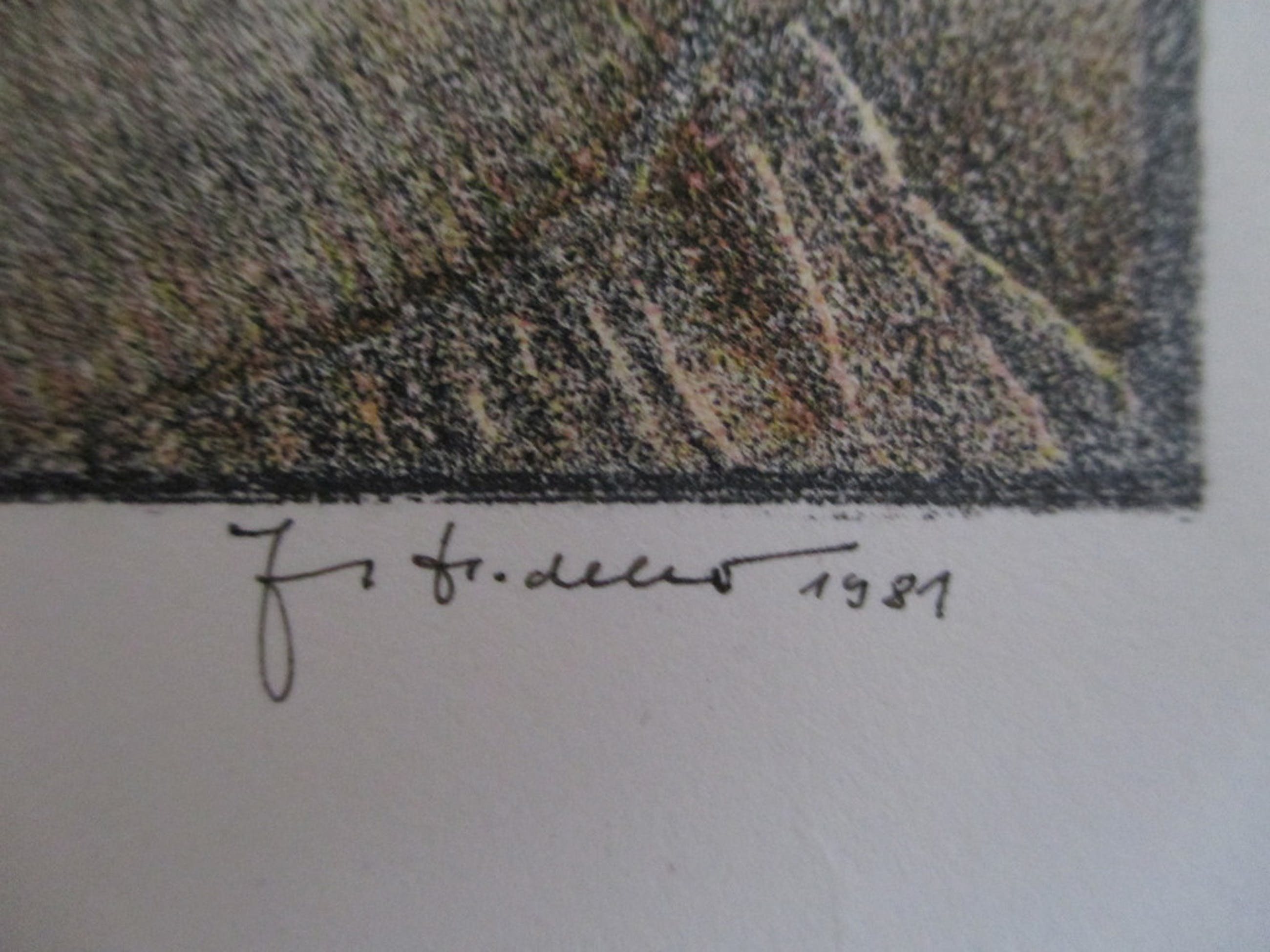 Litho van Georg Hadeler uit 1981, genummerd 6/25 en gesigneerd in pen. Dit blad is afkomstig uit de collectie van Henk van der Vet. Afm. blad 24,5x17,5 cm, beeld 20,5x13,5 cm. In perfecte staat.