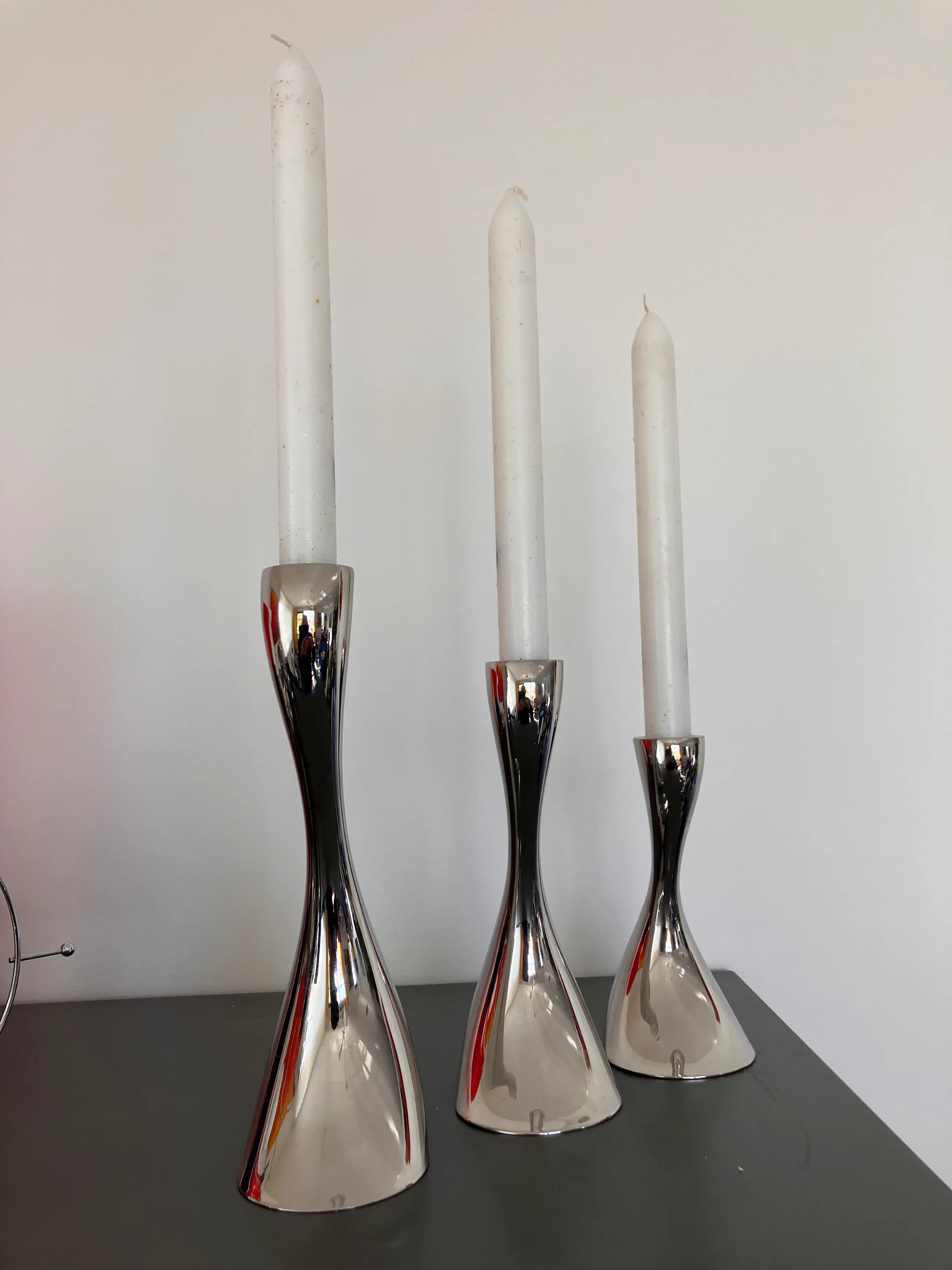 Deze door designer Constantin Wortmann ontworpen set glanzend RVS GEORG JENSEN kandelaars COBRA zijn op en top design. Bijzonder elegant, rank van vorm. Respectievelijk 24, 20 en 16 cm hoog