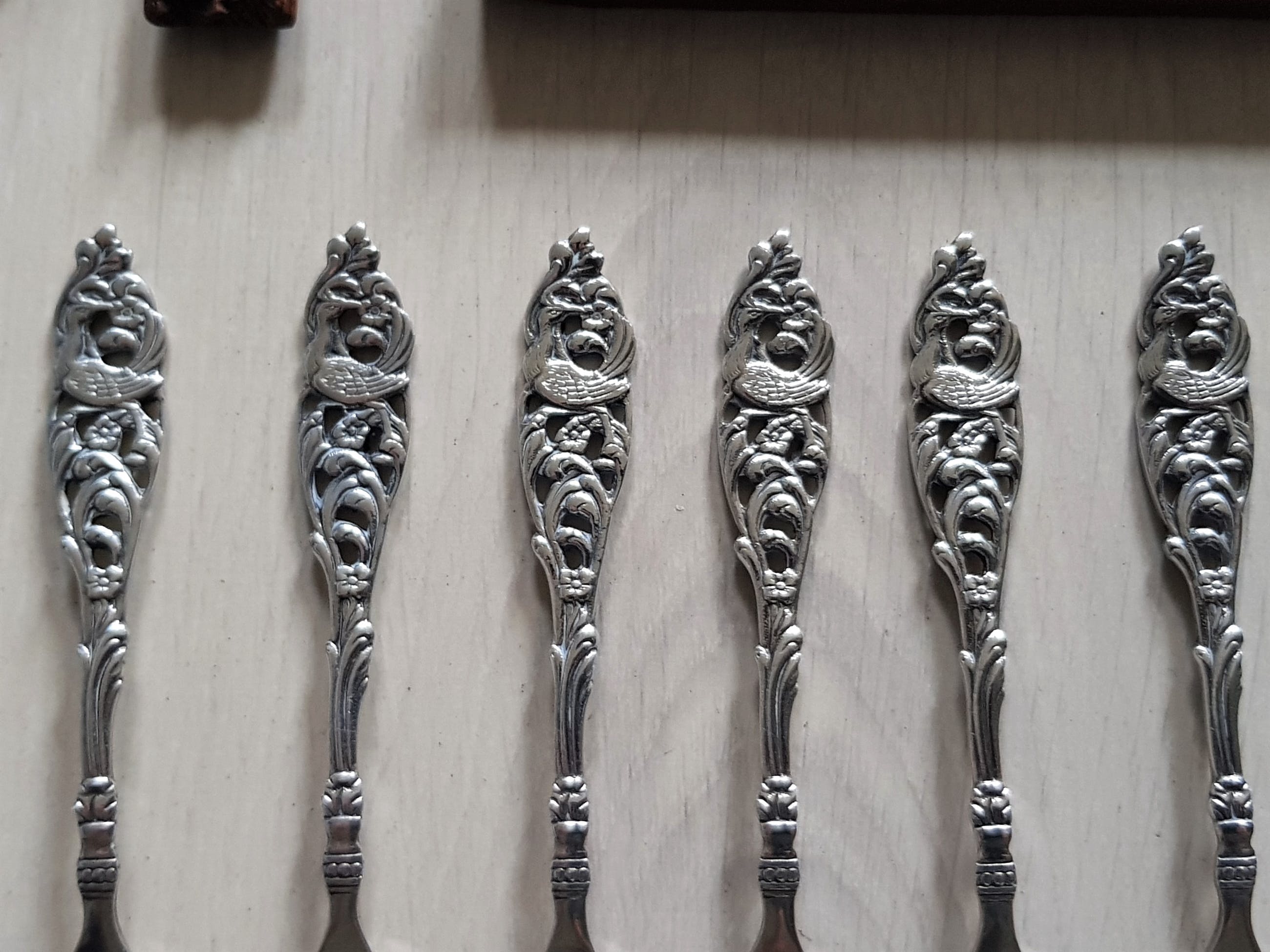 2 Lepelrekjes - 6 Taartvorkjes, Gero, Georg Nilsson 90. (Kraanvogel) Model 647 en 12 Theelepeltjes, Gero, Georg Nilsson 90. Alles staat gemerkt met Gero, Georg Nilsson 90. Deense designer/zilversmit die werkte voor o.a. Gero en daar de meest toonaangevende designer was. Hij werkte eerst in de Deense Gero fabriek en kwam na sluiting in 1933 naar de Gero fabriek in Zeist. Afm Vorkjes: 12 cm. Afm Theelpeltjes: Grootste, 12.5 cm. Kleinste: 9 cm. Gewicht, vorkjes en lepeltjes totaal: 237 gram. In perfecte staat. Bij het verzenden wordt het zeer zorgvuldig ingepakt.
