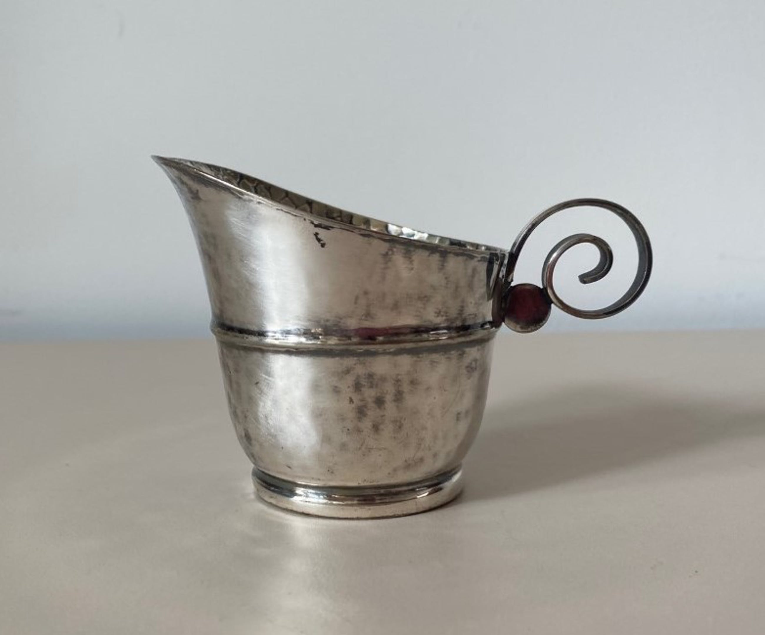 Art deco verzilverd melkkannetje ontwerp Georg Nilsson voor Gero Zeist. In goede gebruikte conditie, gemerkt aan de onderzijde en voorzien van monogram GN.