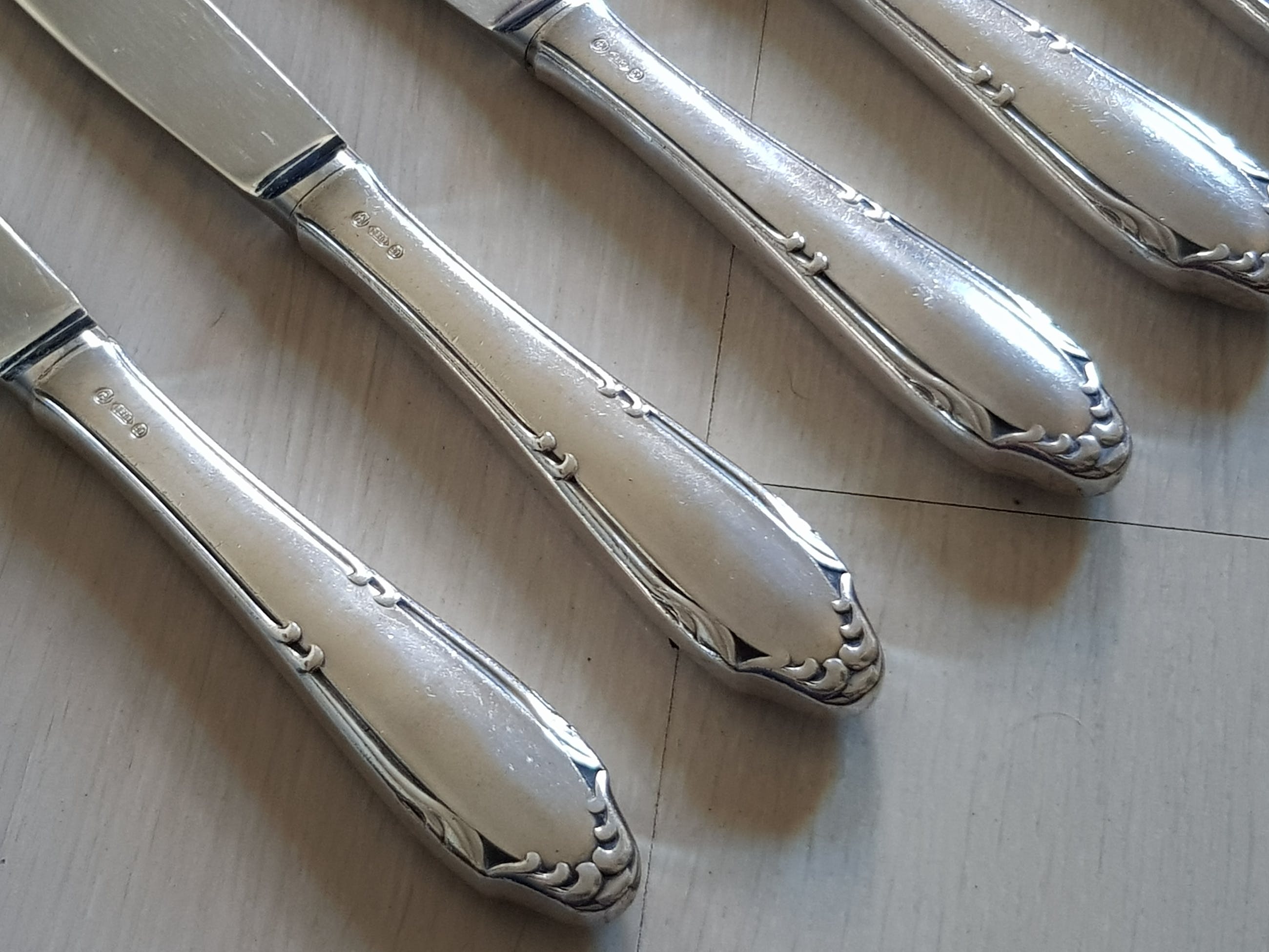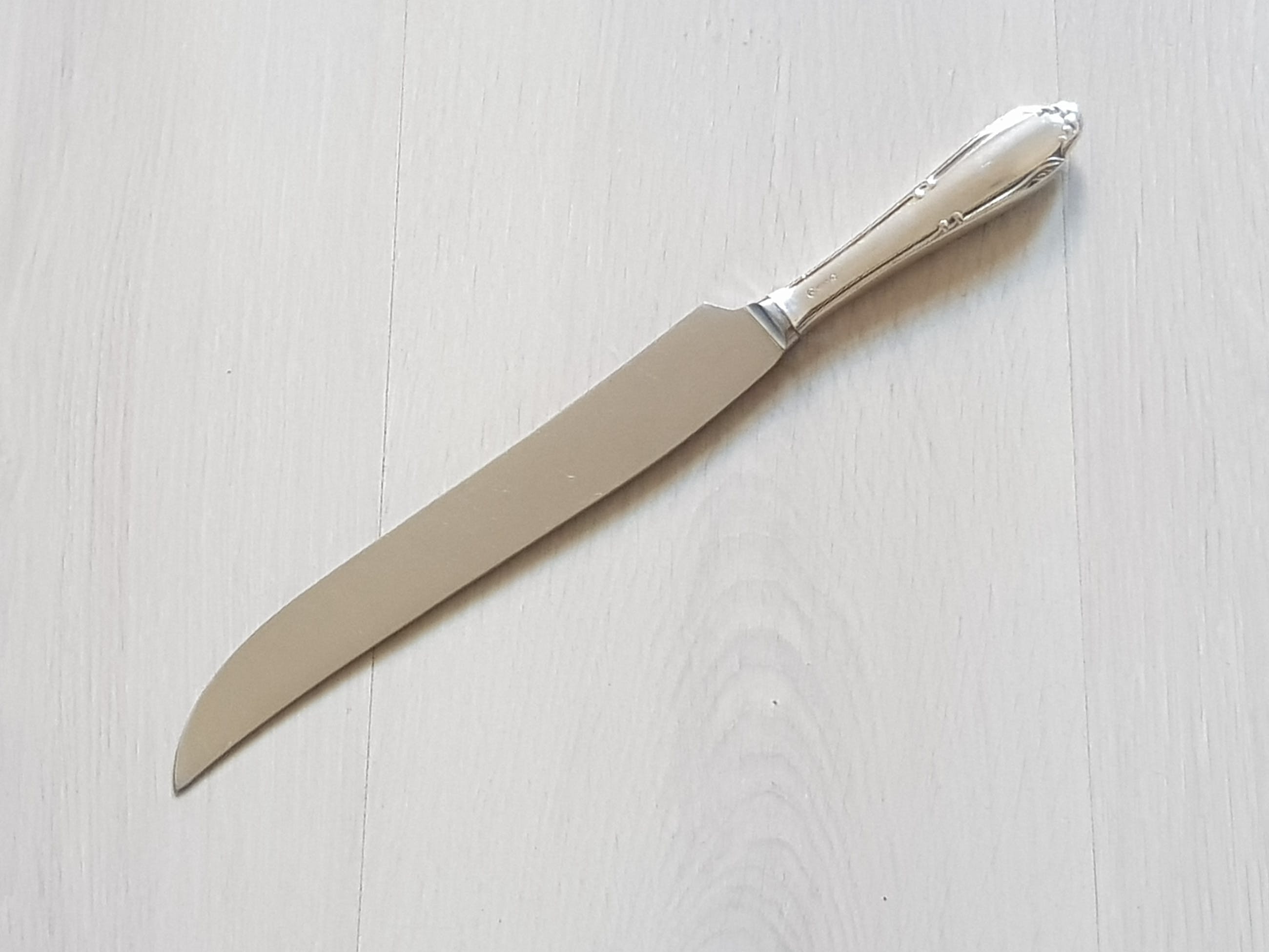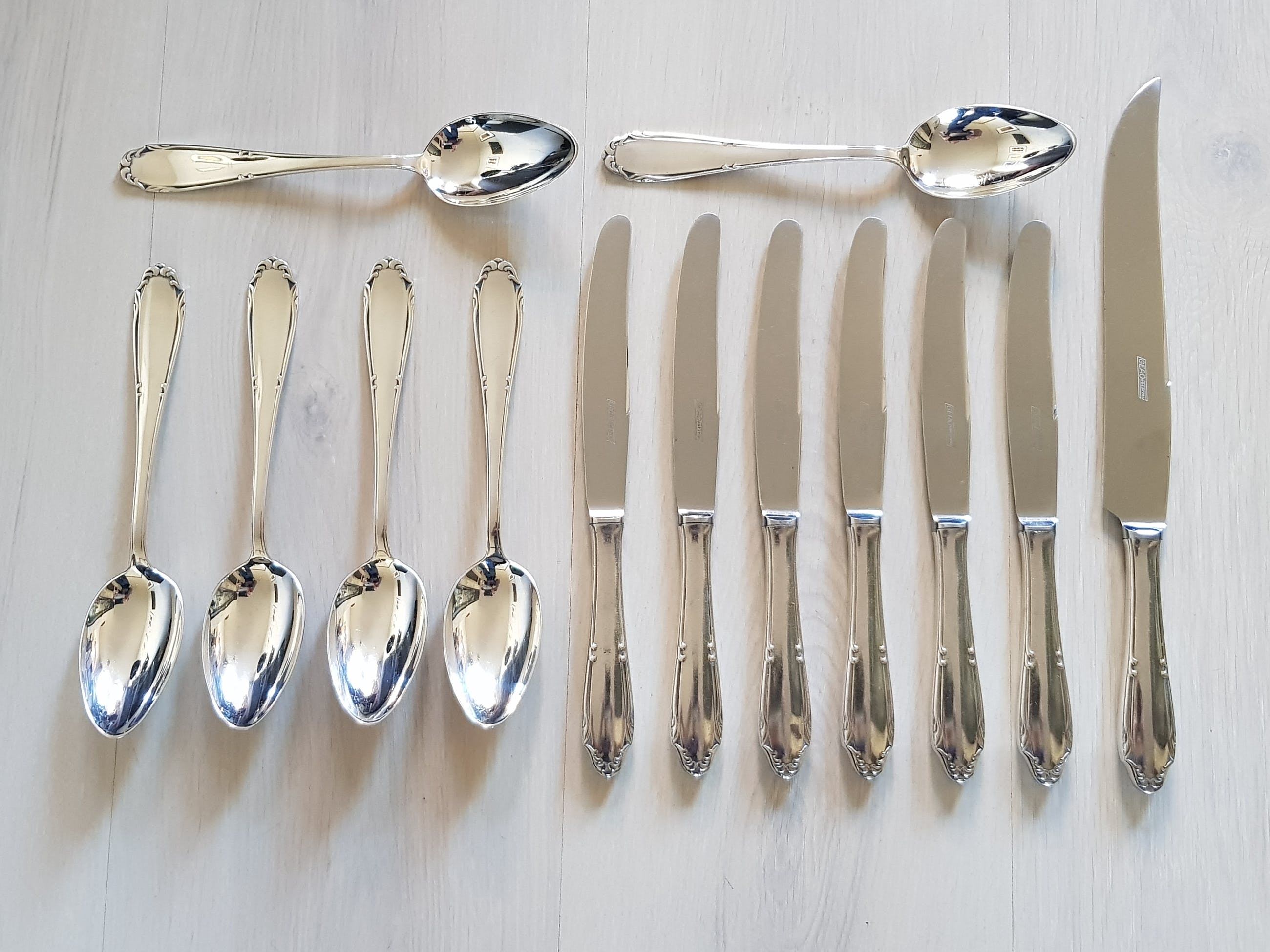 13 Stuks Georg Nilsson Bestek, Deense designer/zilversmit die werkte voor o.a. Gero en daar de meest toonaangevende designer was. Hij werkte eerst in de Deense Gero fabriek en kwam na sluiting in 1933 naar de Gero fabriek in Zeist. Gemerkt, broodmes: GN-Gero 90. Gero Roestvrij. Afm: 32 cm. 6 Dinermessen. Gemerkt, GN-Gero 90. Gero Roestvrij. Afm: 24.5 cm. 6 Dinerlepels. Gemerkt, GN-Gero 90. Jaarletter S. Afm: 20.5 cm. Model Riche 694. Gewicht Totaal: 1053 Gram. Periode: eerste helft 20e eeuw. Bij het verzenden wordt het extra goed ingepakt.