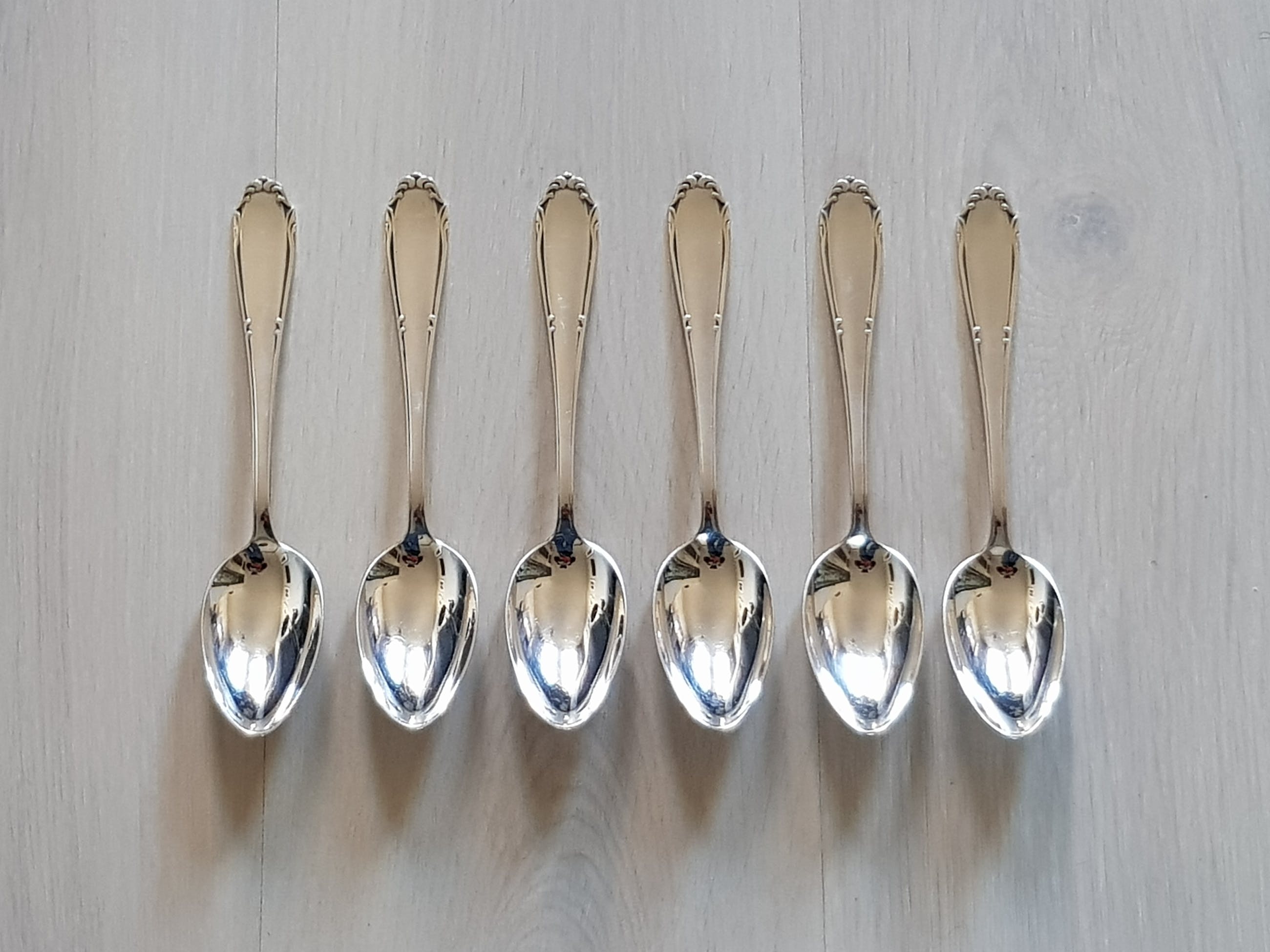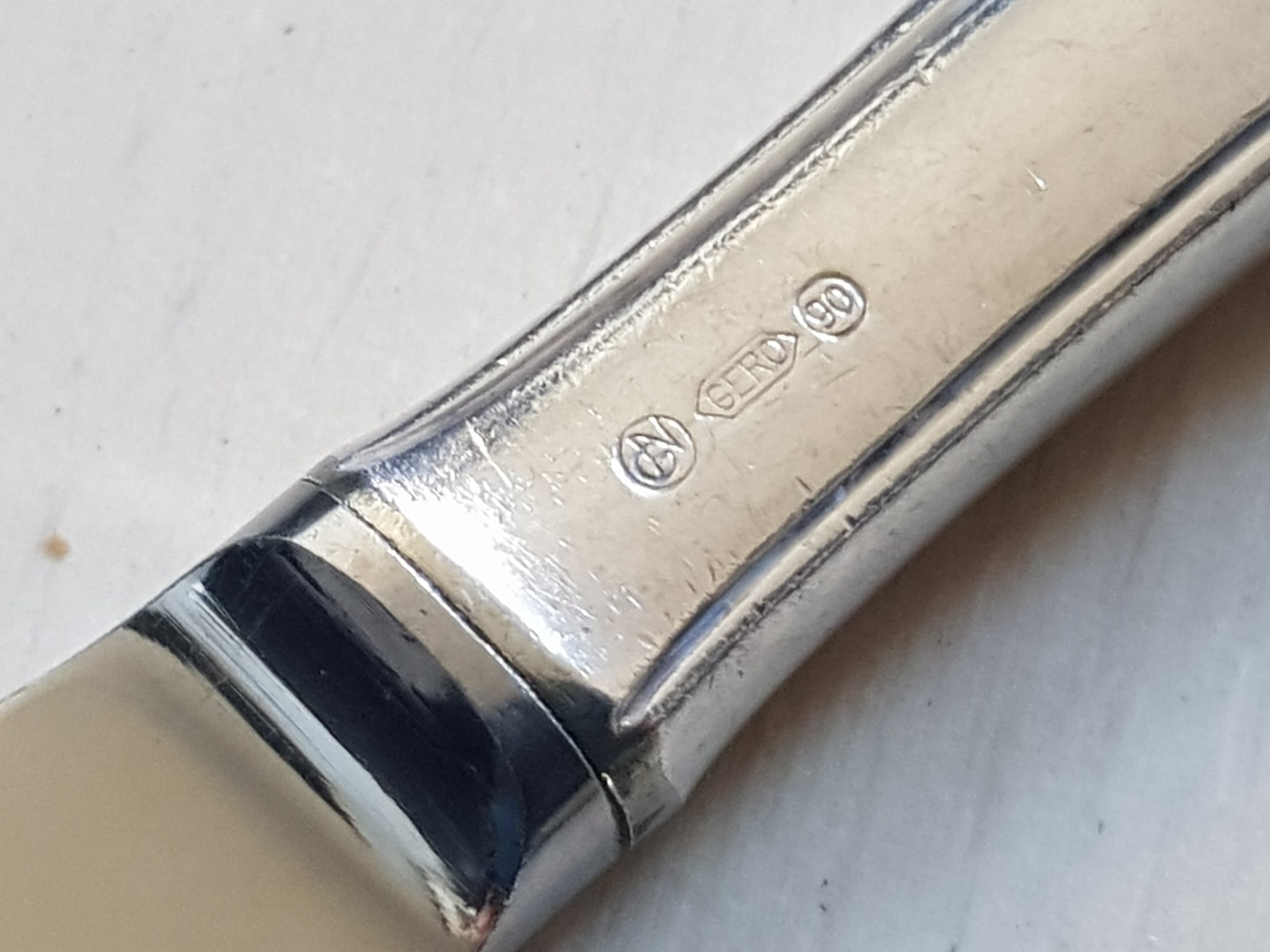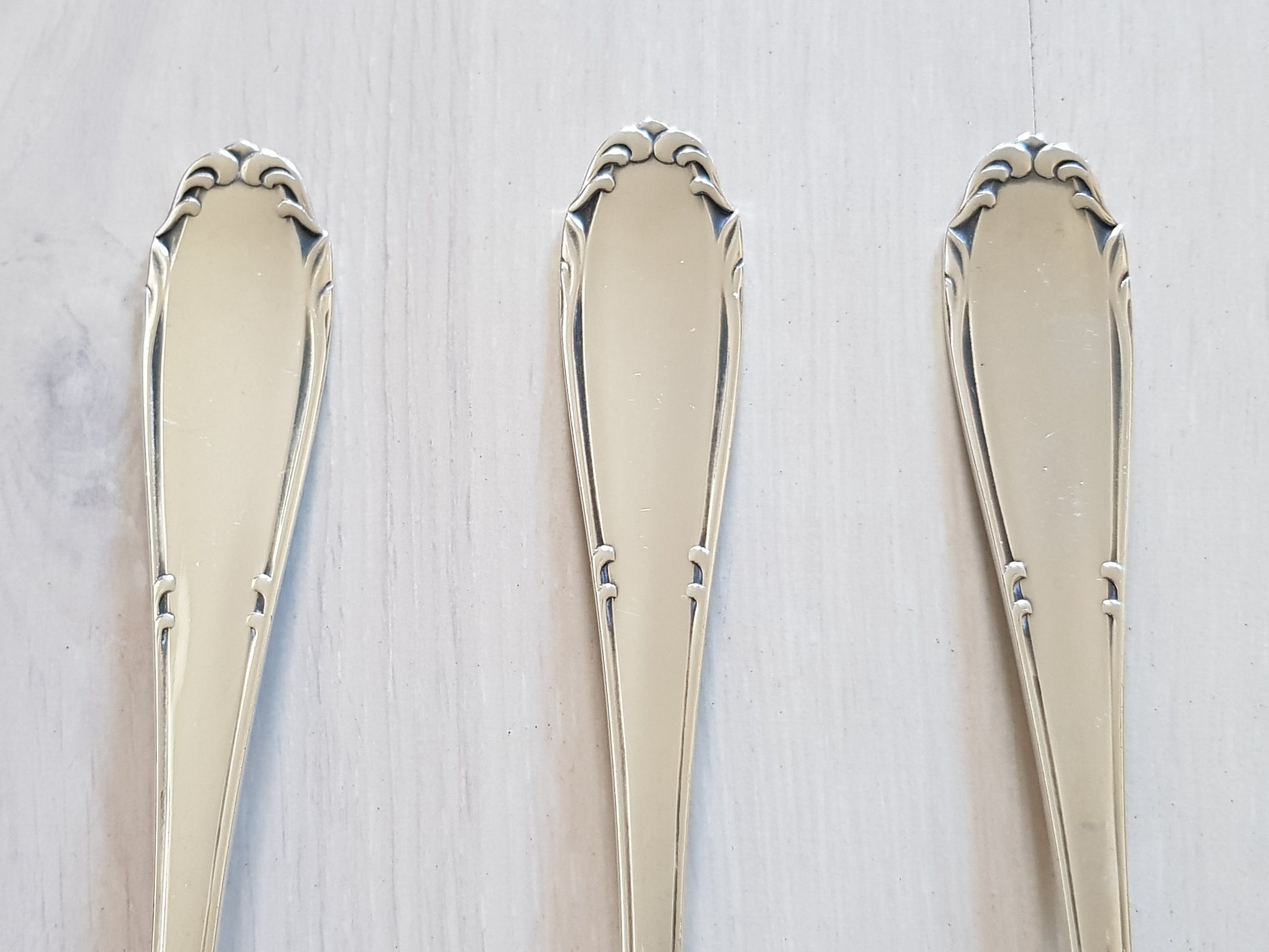 13 Stuks Georg Nilsson Bestek, Deense designer/zilversmit die werkte voor o.a. Gero en daar de meest toonaangevende designer was. Hij werkte eerst in de Deense Gero fabriek en kwam na sluiting in 1933 naar de Gero fabriek in Zeist. Gemerkt, broodmes: GN-Gero 90. Gero Roestvrij. Afm: 32 cm. 6 Dinermessen. Gemerkt, GN-Gero 90. Gero Roestvrij. Afm: 24.5 cm. 6 Dinerlepels. Gemerkt, GN-Gero 90. Jaarletter S. Afm: 20.5 cm. Model Riche 694. Gewicht Totaal: 1053 Gram. Periode: eerste helft 20e eeuw. Bij het verzenden wordt het extra goed ingepakt.