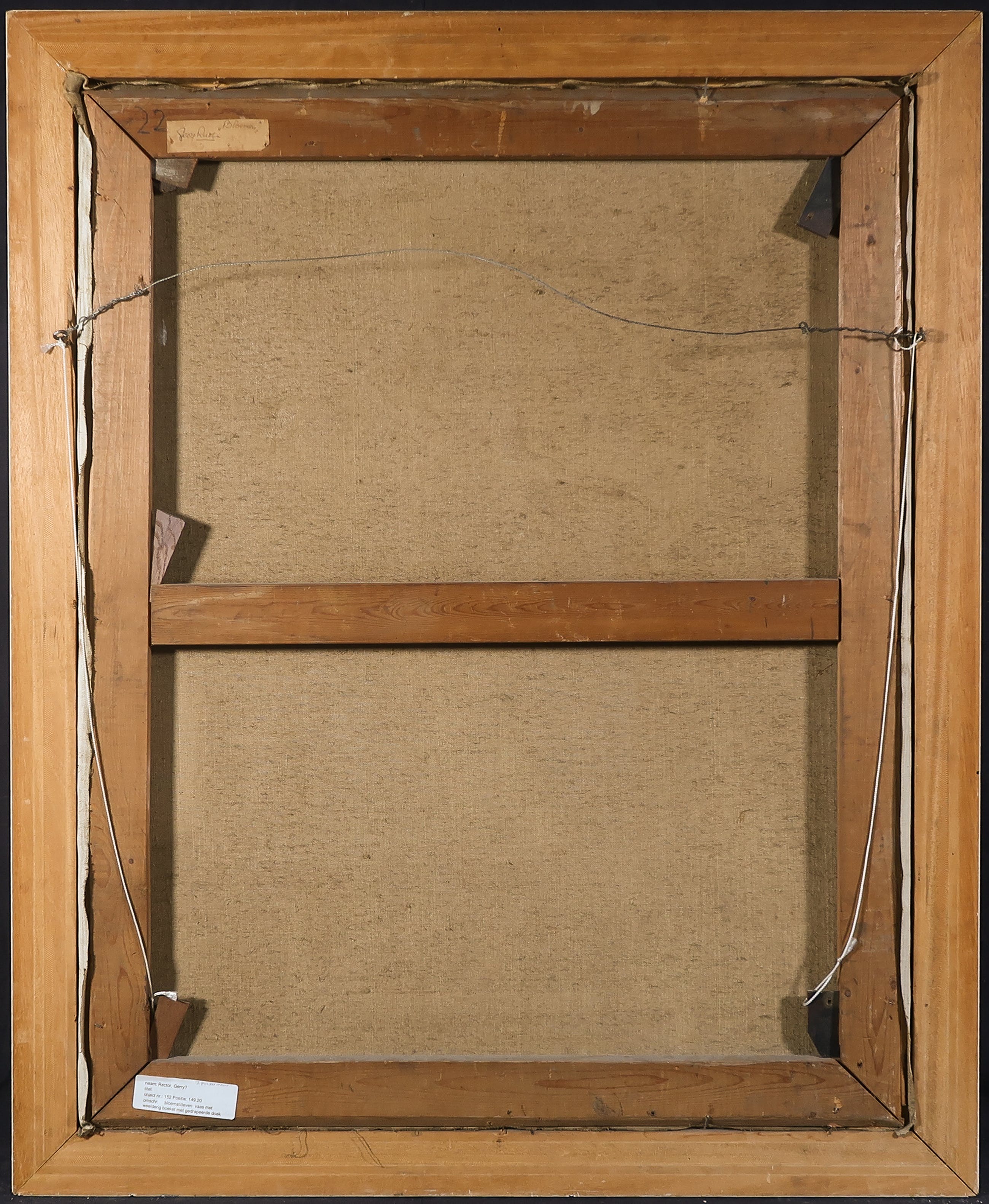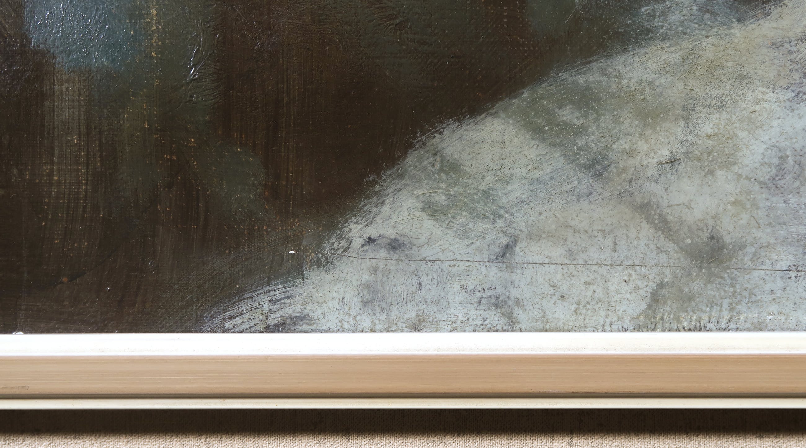 | kleine beschadiging linksonder in het beeld met verfverlies 5 mm en een kras onder in het beeld. Een paar lichte beschadigingen langs de randen van doek (achter de rand van de lijst, doek zit een beetje los in de lijst). Paar miniscule krasjes in het beeld en lichte golving in hoeken. | |