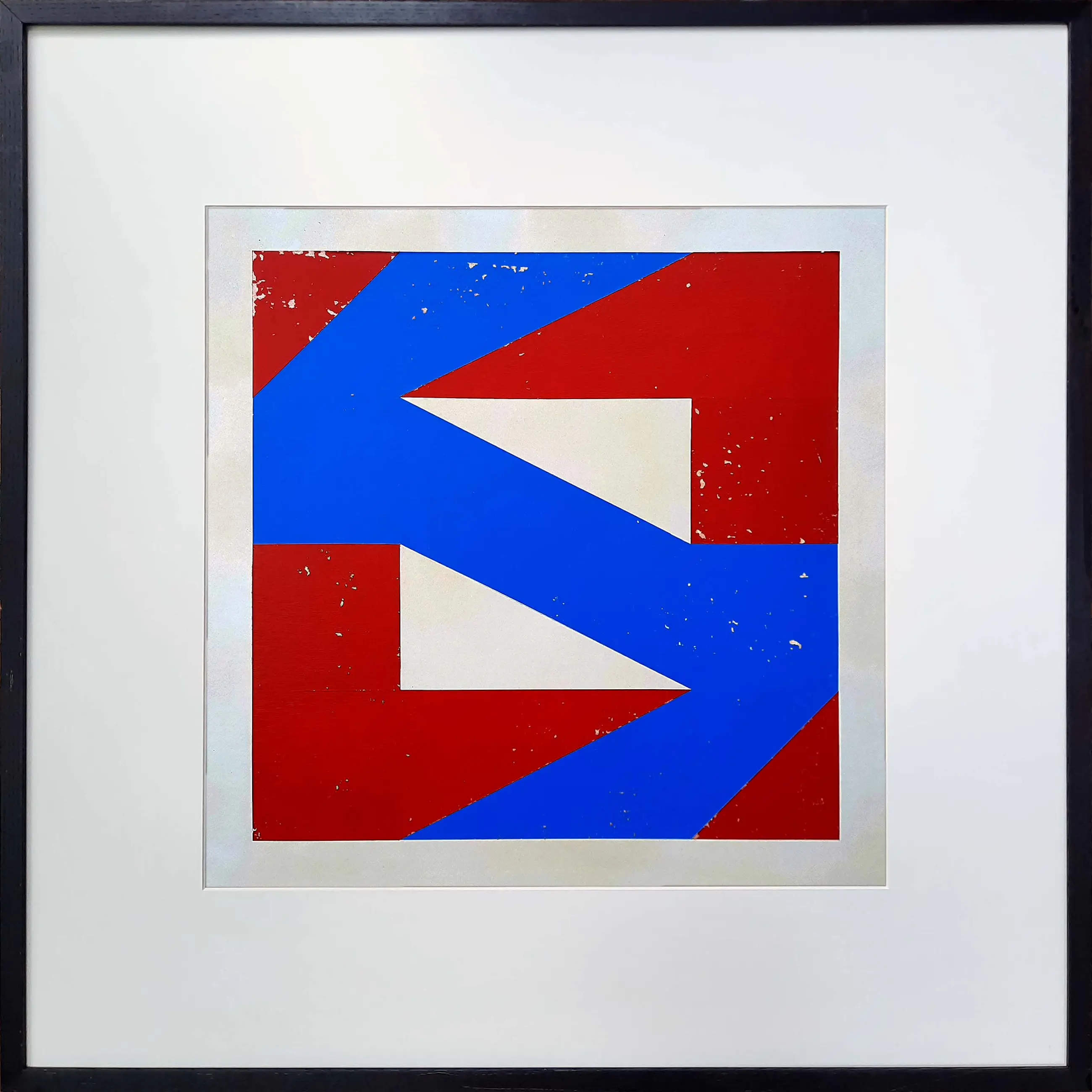 Dit geschilderd origineel ‘ontwerp voor zeefdruk’ komt uit het voormalig atelier van Johannes Georg Ruyter. Vanaf 1945 werkte hij (geometrisch) abstract. Het beeld is 45 x 45 cm. PP 53 x 53 cm. Kleurstelling: rood/wit/blauw. Afhalen in de galerie in Zaandam verdient de voorkeur. Het werk bekijken alvorens een bod te doen behoort ook tot de mogelijkheden.