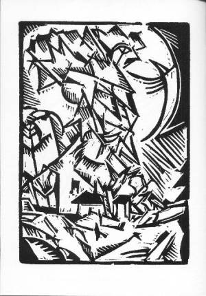 Georg Tappert( 1880 Berlin - 1957 Berlin), Original Linolschnitt "Landschaft I" aus "Der schwarze Turm", 1918, Expressionismus,(hier späterer Abzug von der Original Platte, 1963), Format ca: 12,5 x 17,5 cm auf ca: 14,5 x 20,5 cm. Siehe auch Rifkind 2913 mit Abbildung.---------------------------------------------------------- Tappert war einer der Wegbereiter des Expressionismus, er gründete die "Novembergruppe" und war Professor an der Staatlichen Kunstschule, Berlin. 1937 wurde er von den Nazis entlassen, etwa 40 seiner Bilder wurden aus Museen entfernt. Von den Bildern, die er versteckte, wurde eine große Zahl durch Kriegseinwirkung zerstört.