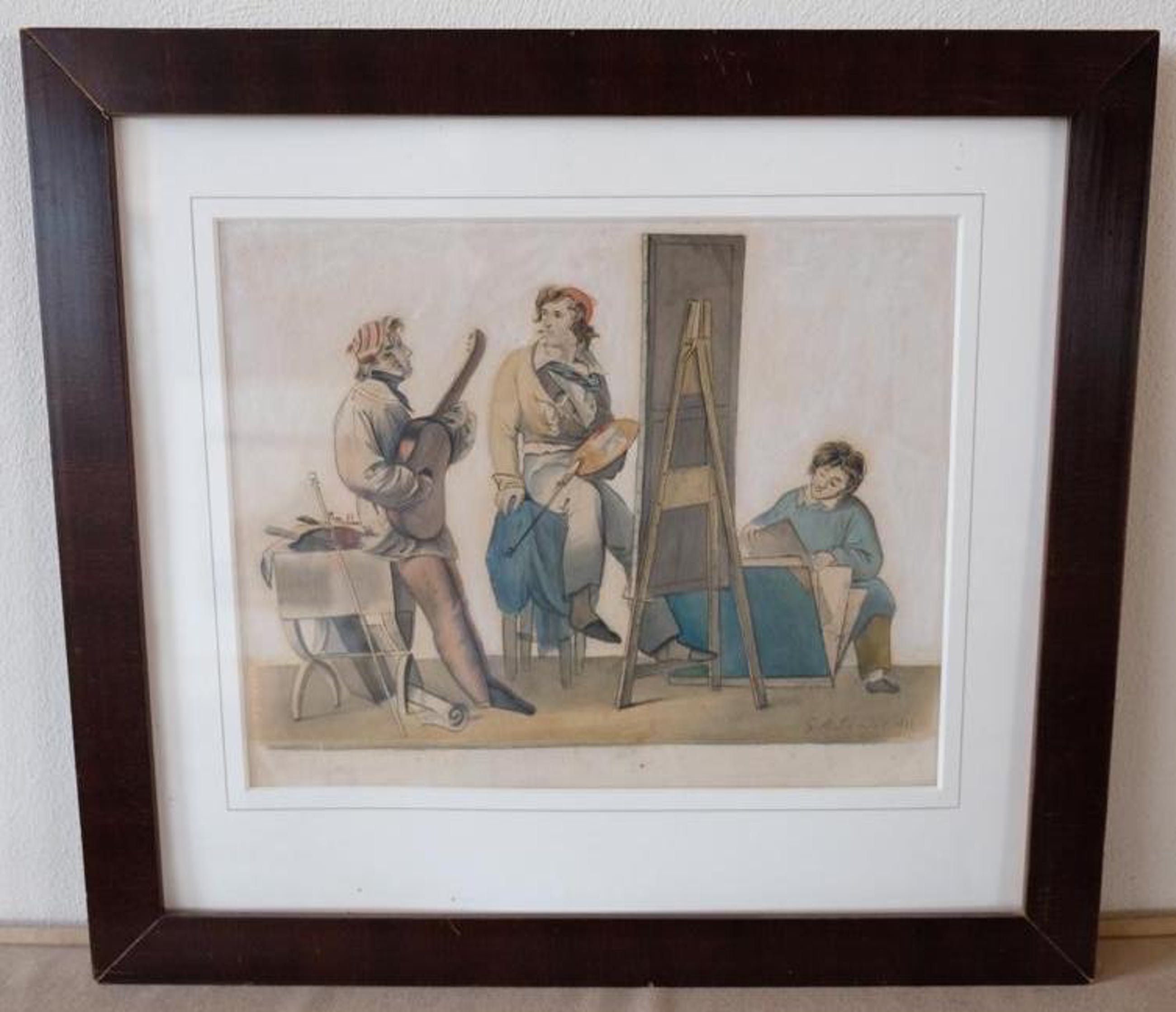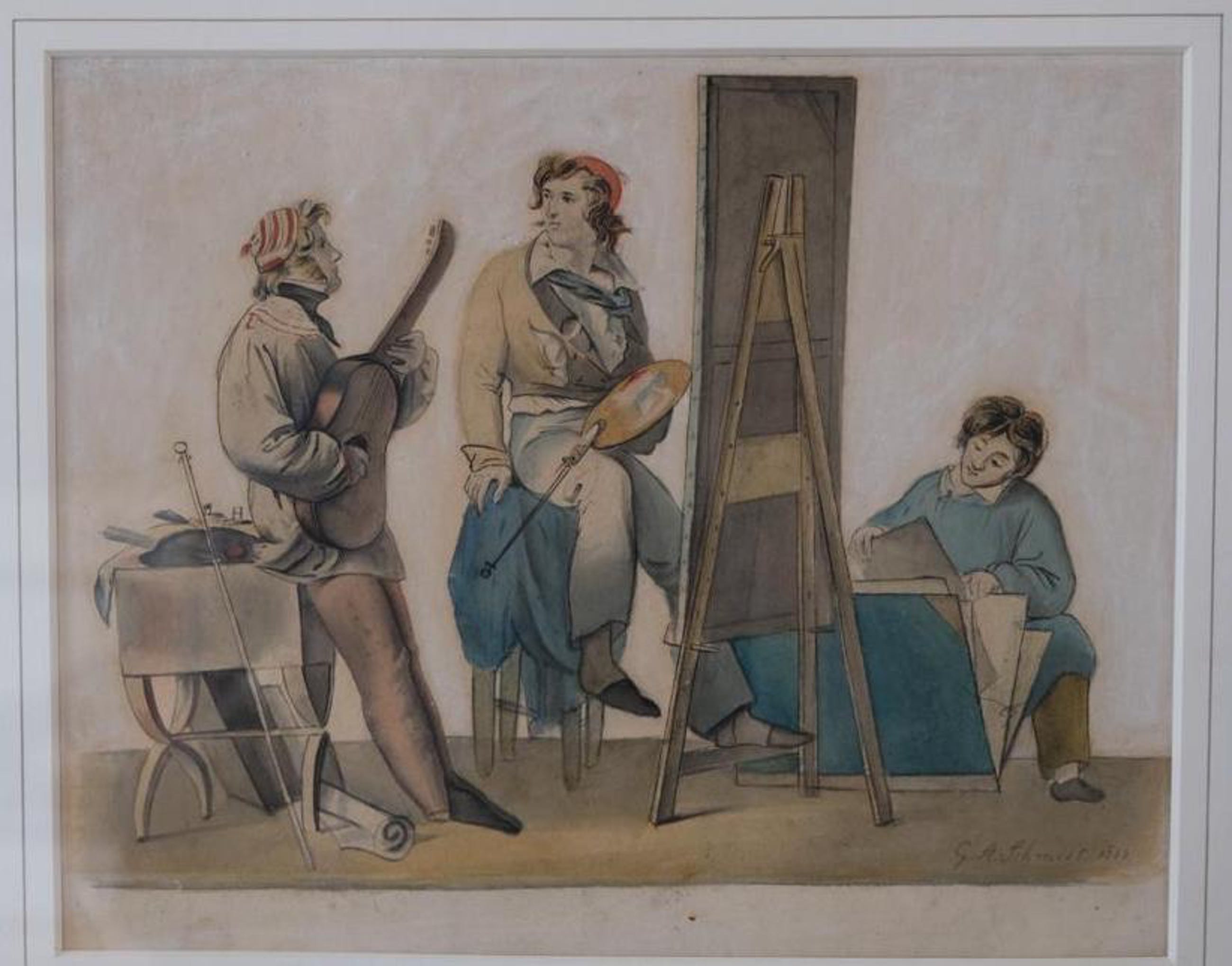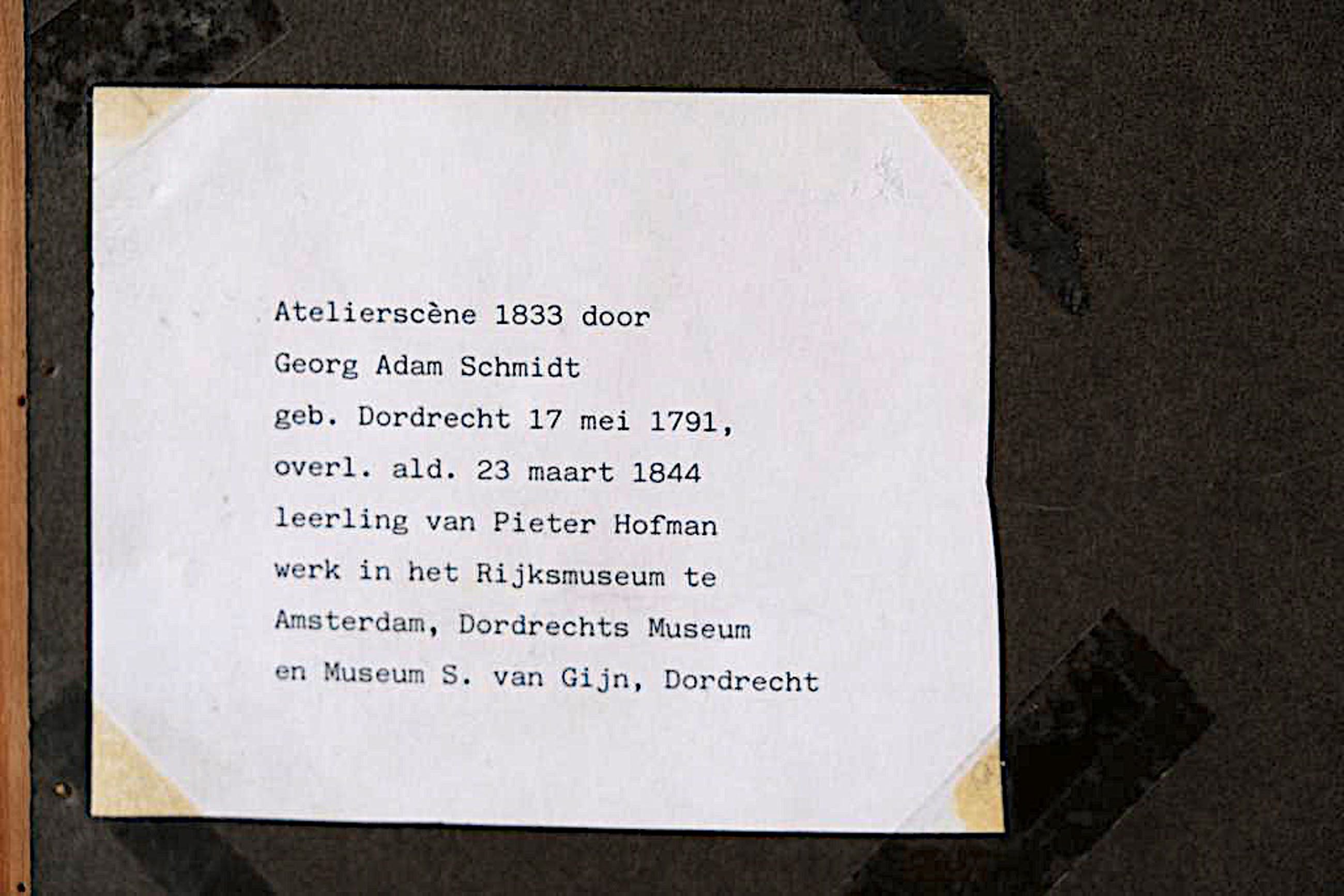 Dit is een atelierscene uit 1833 bij Georg Adam Schmidt. Werken van deze leerling van Pieter Hofman zijn o.a. in Het Rijksmuseum, Dordrechts Museum en het Museum S. van Gijn.