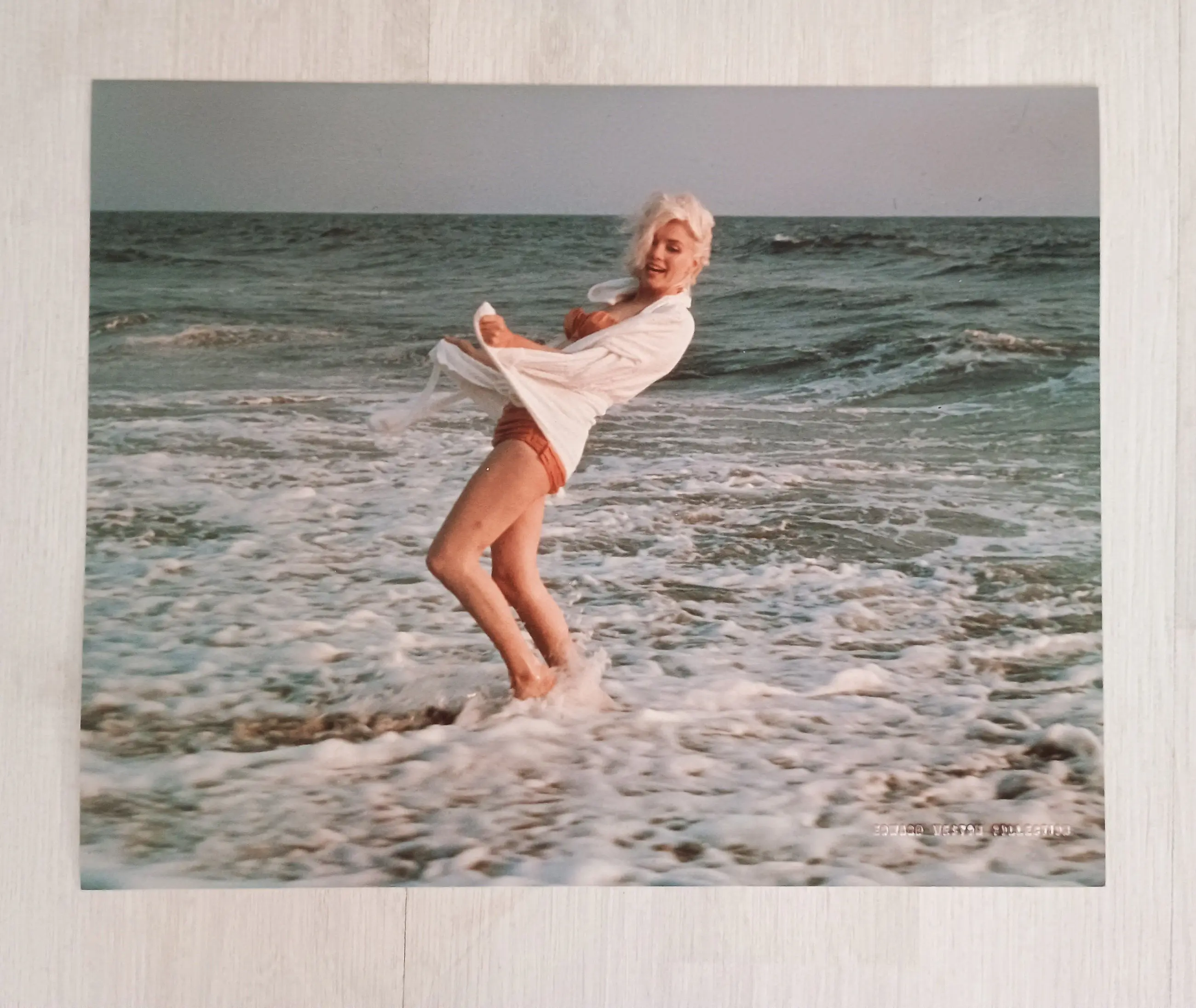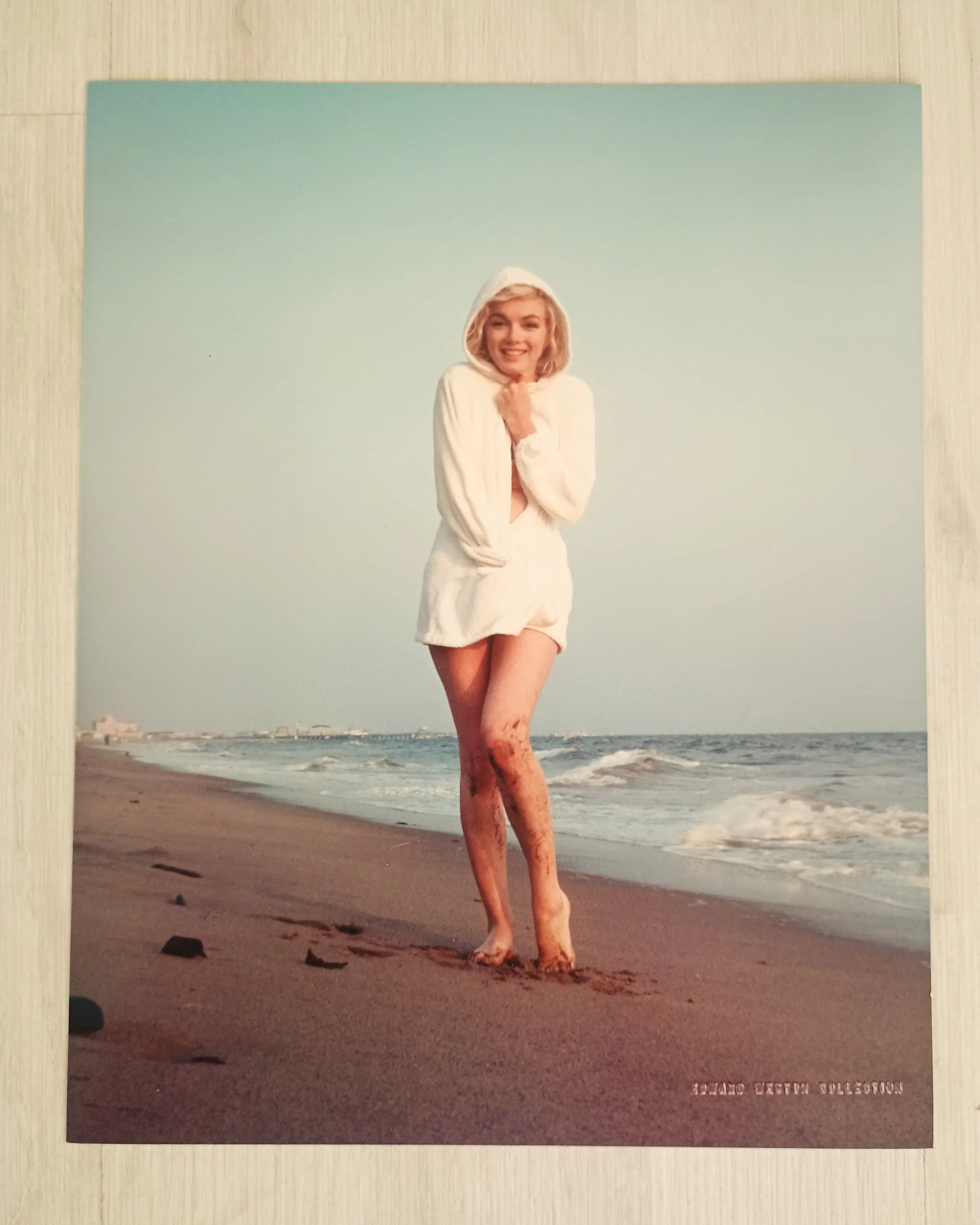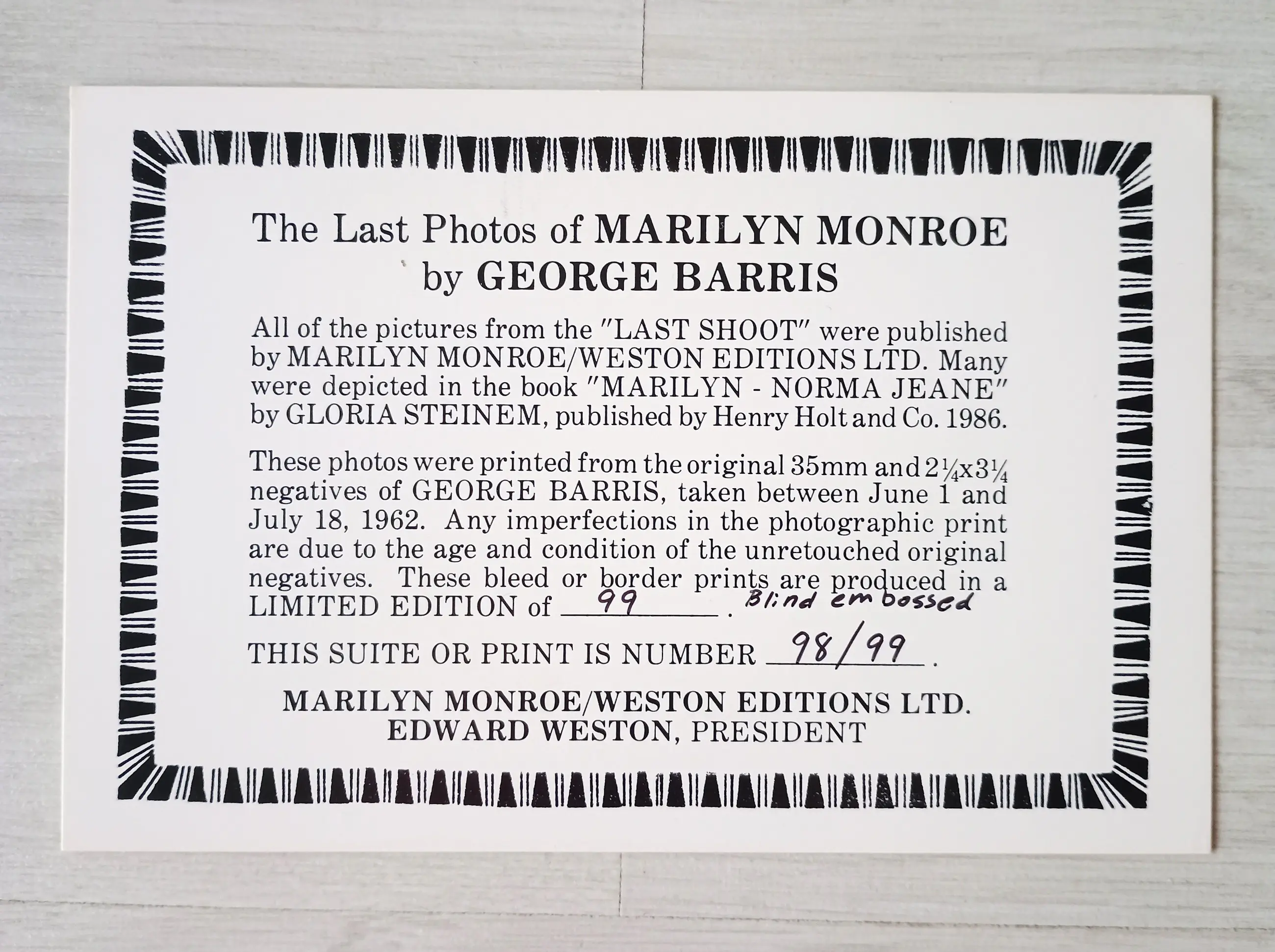 Een groep van acht foto's, afgedrukt in 1987 met een halfmatte afwerking, waarop Marilyn Monroe grotendeels op het strand te zien is. Elke foto is voorzien van een rode stempel op de achterkant met de tekst "1987", twee blauwe stempels en een zwarte stempel met "Weston Editions Ltd.". De foto's bevinden zich in een speciale witte map met de tekst "Marilyn Monroe/ 25th Anniversary / The Last Photos" op de voorkant, evenals verdere tekst binnenin en op de achterkant. Ook inbegrepen is een certificaat van echtheid met nummer "98/99".