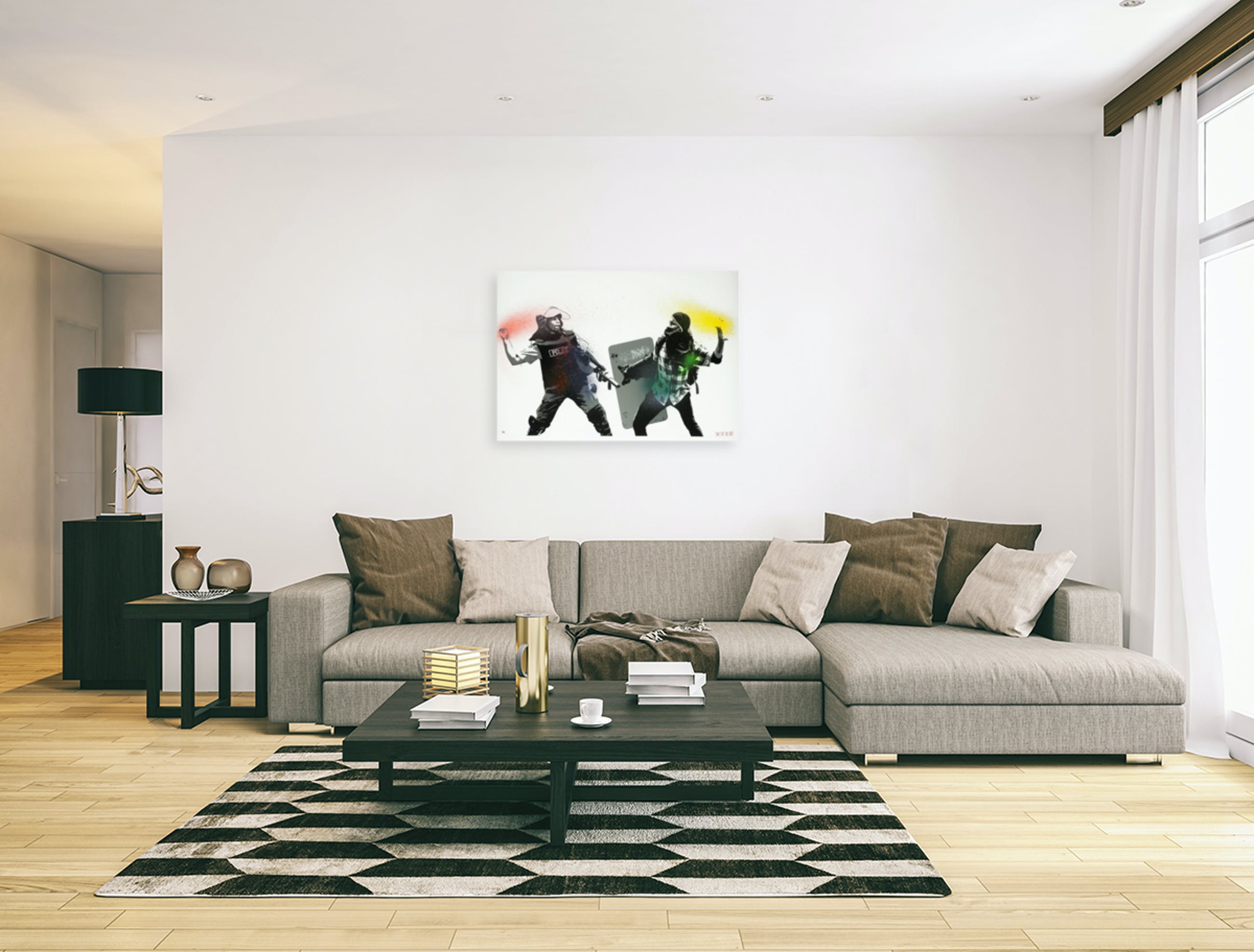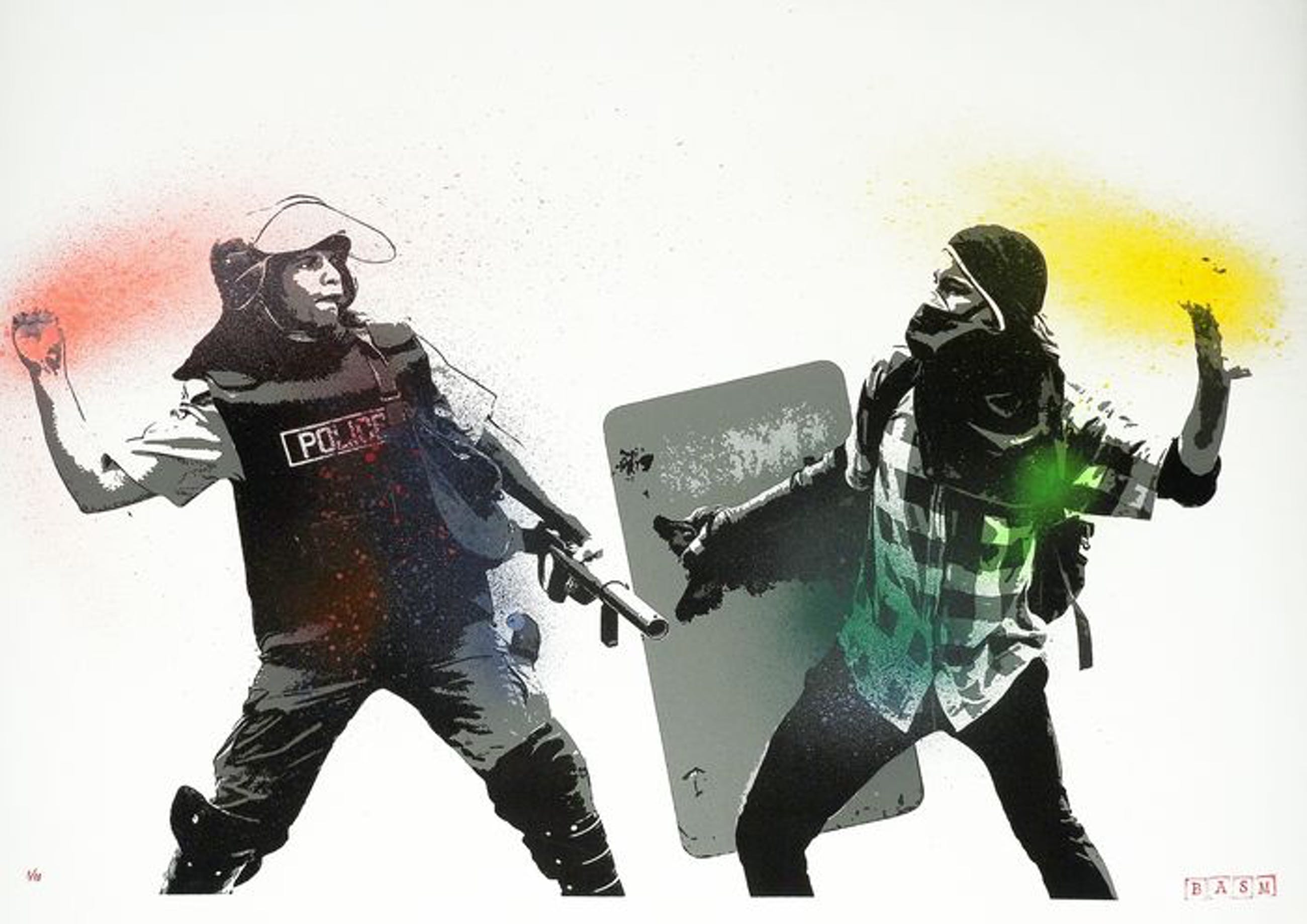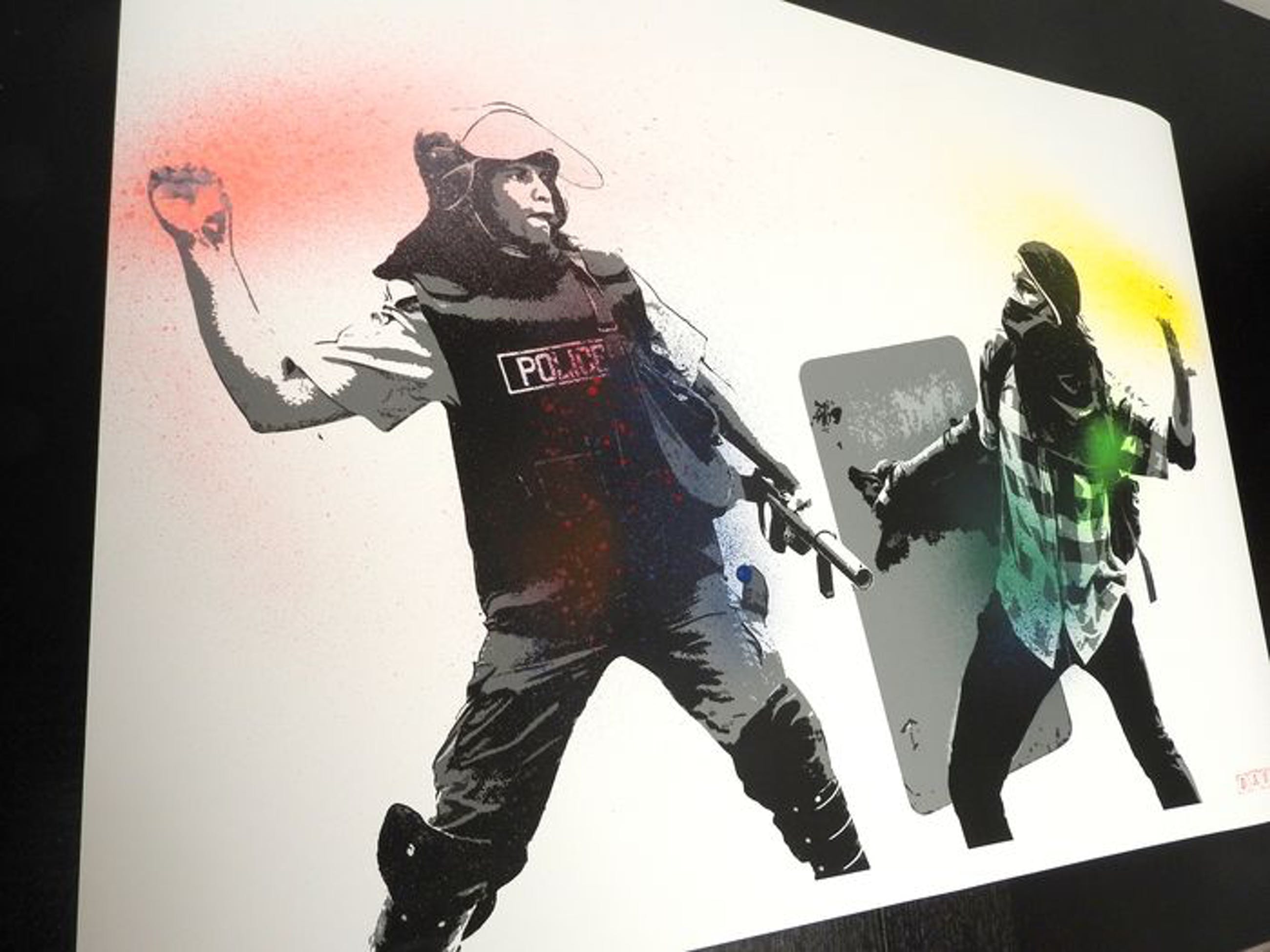 Artist: George Cosmin (BASM) Title: The Clash Technique: Spraypaint on fine art paper Dimensions: 84 x 59 cm Signed: Yes, stamped signed and numbered limited edition (Certificate of Authenticity) Framed: No (possible for €135) Condition: Mint