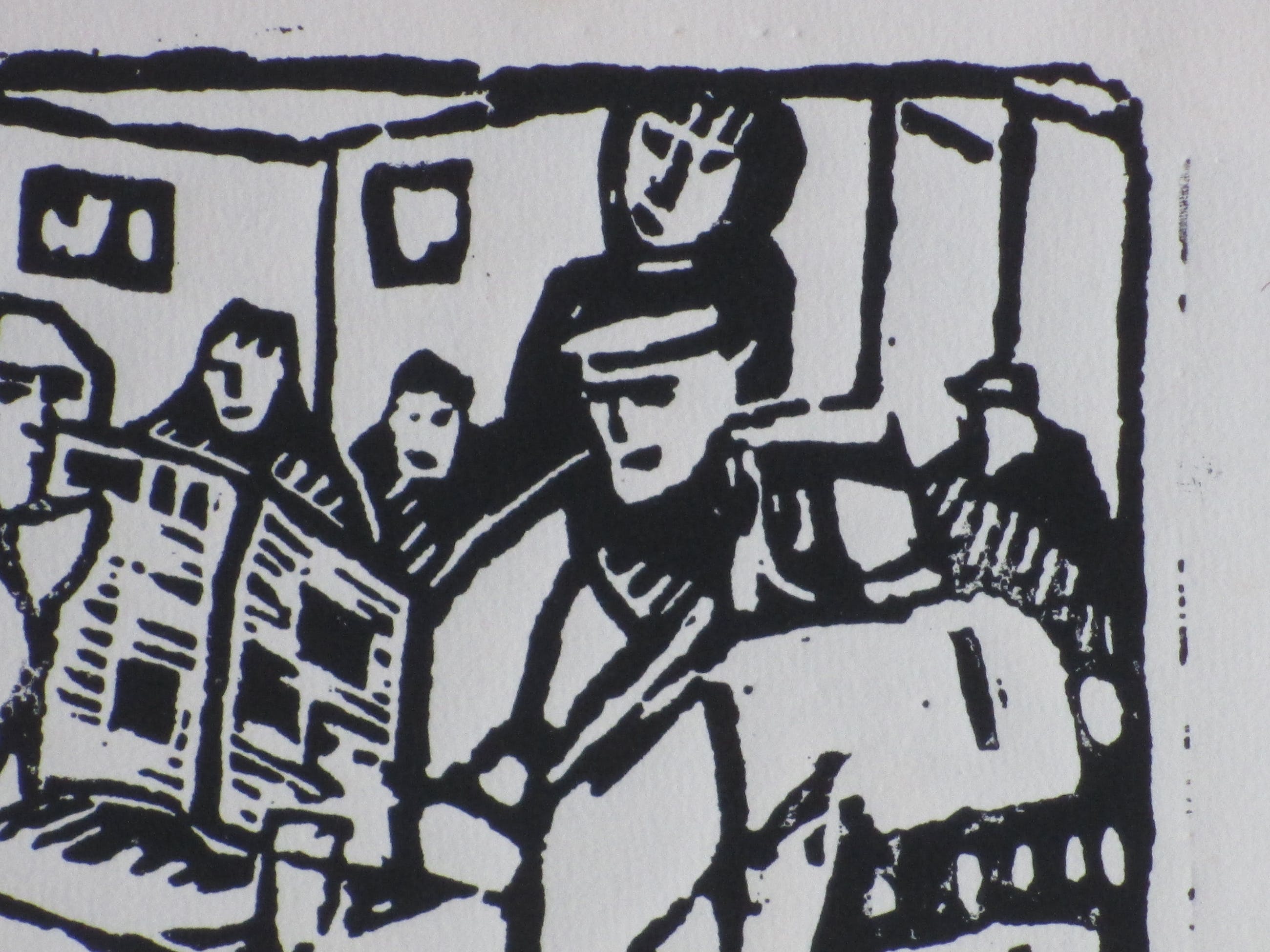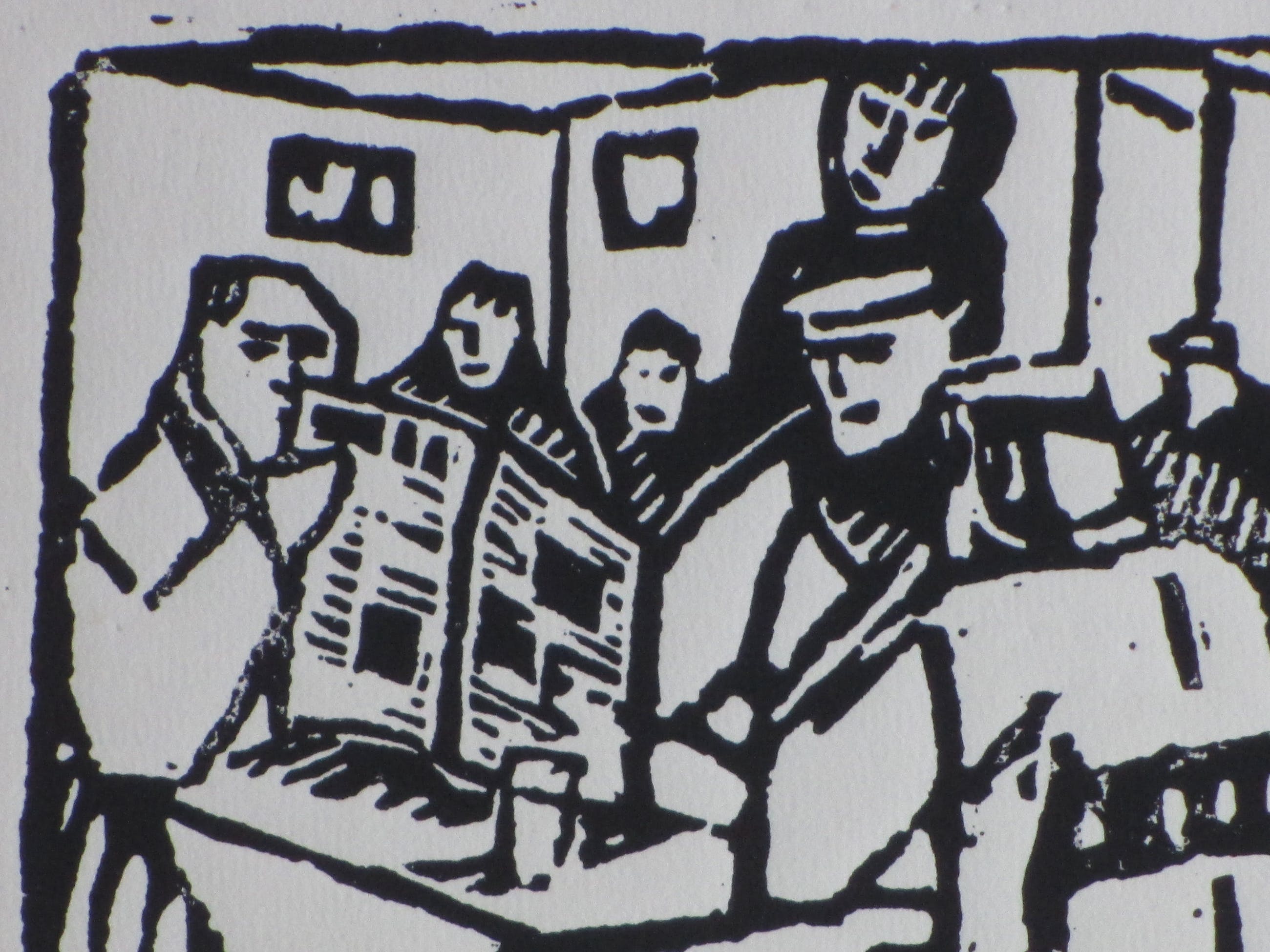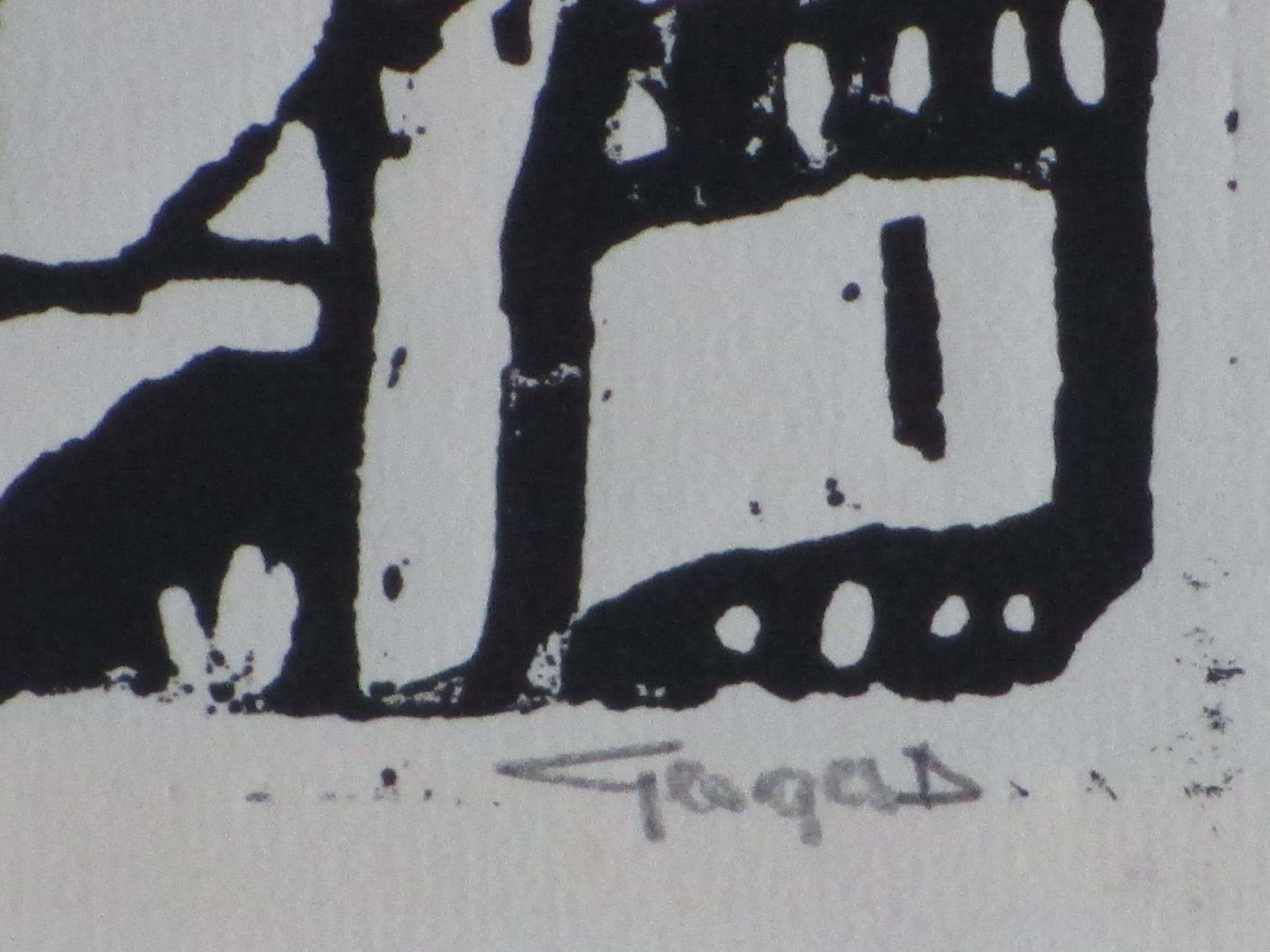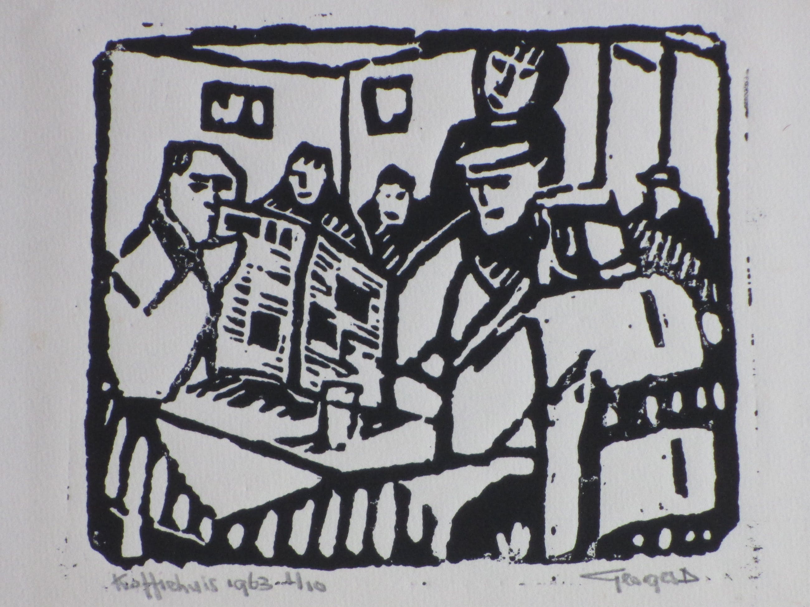 Linosnede door George DegenhartVoorstelling van personen in het koffiehuisLosbladig, beeldmaat 11x13, bladmaat 16x18Gesigneerd in potlood r.o. 'George D'Getiteld, gedateerd en genummerd l.o. 'Koffiehuis 1963 - 1/10'Authenticiteit volledig gegarandeerd