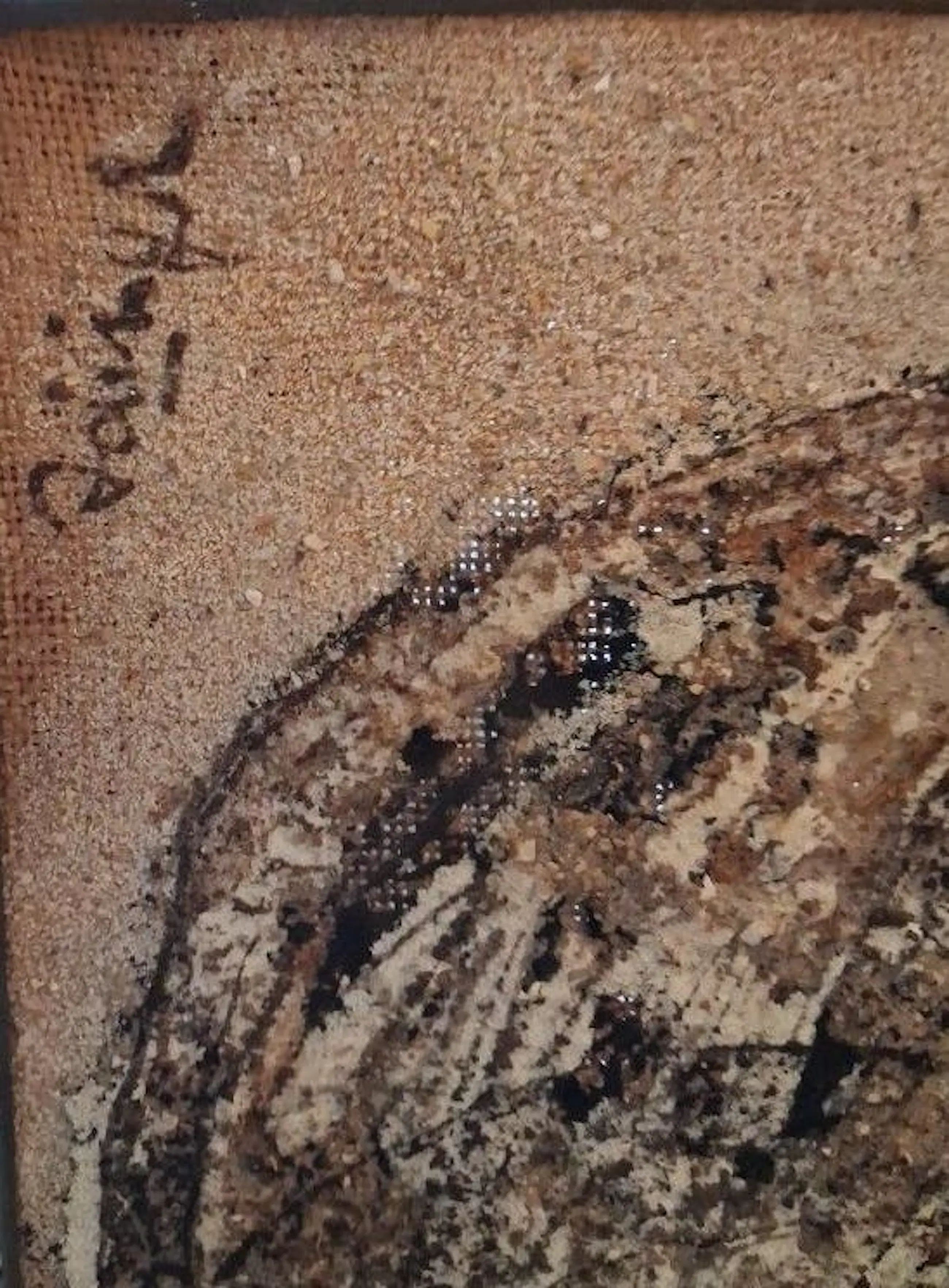 Het werk is met eenvoudige materialen gemaakt. Latten, jute, kiezel, zand. Is zo n 50 jaar oud
