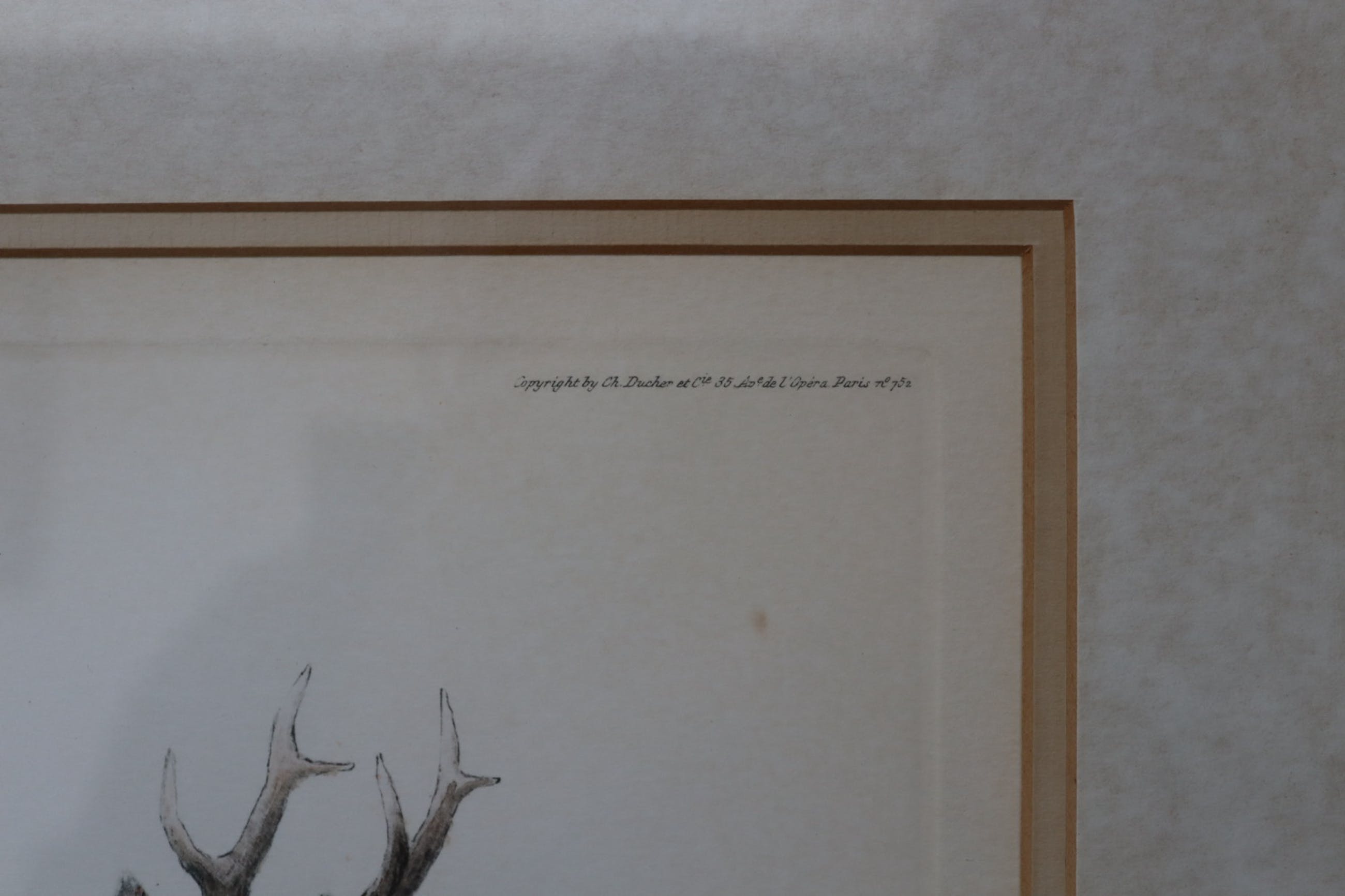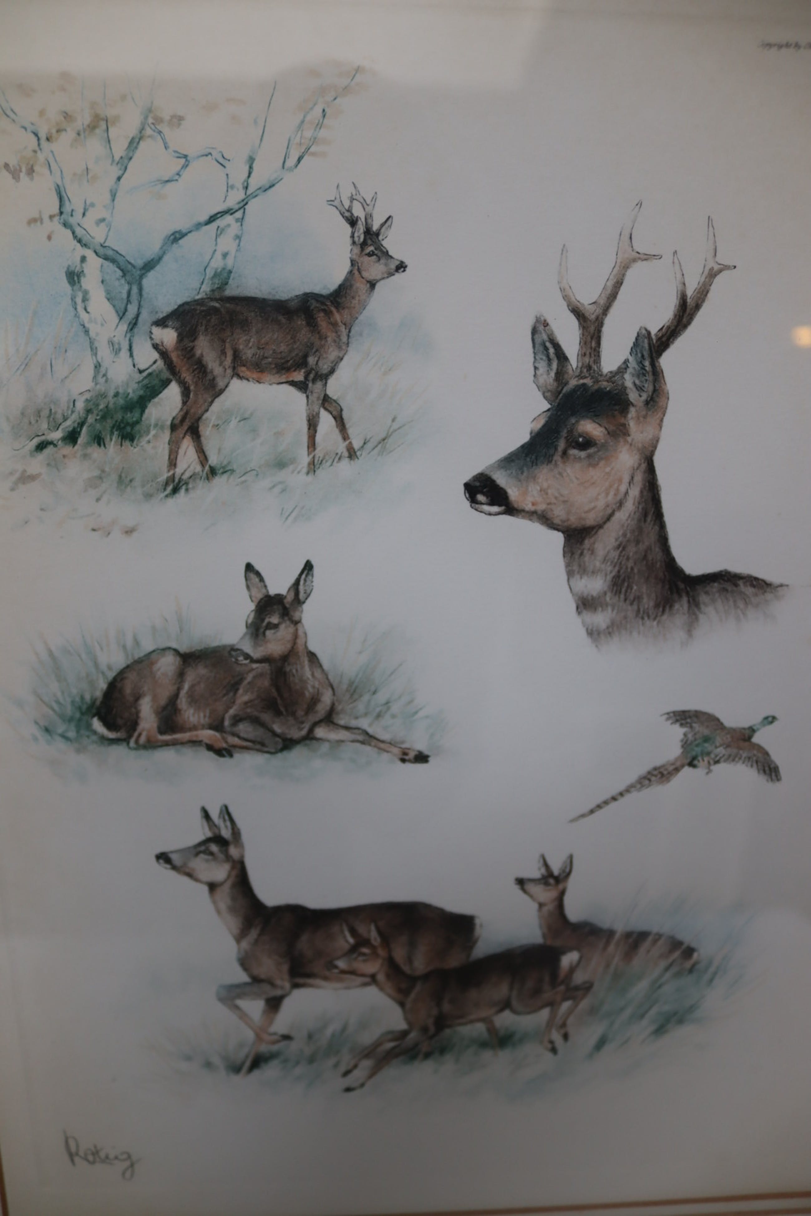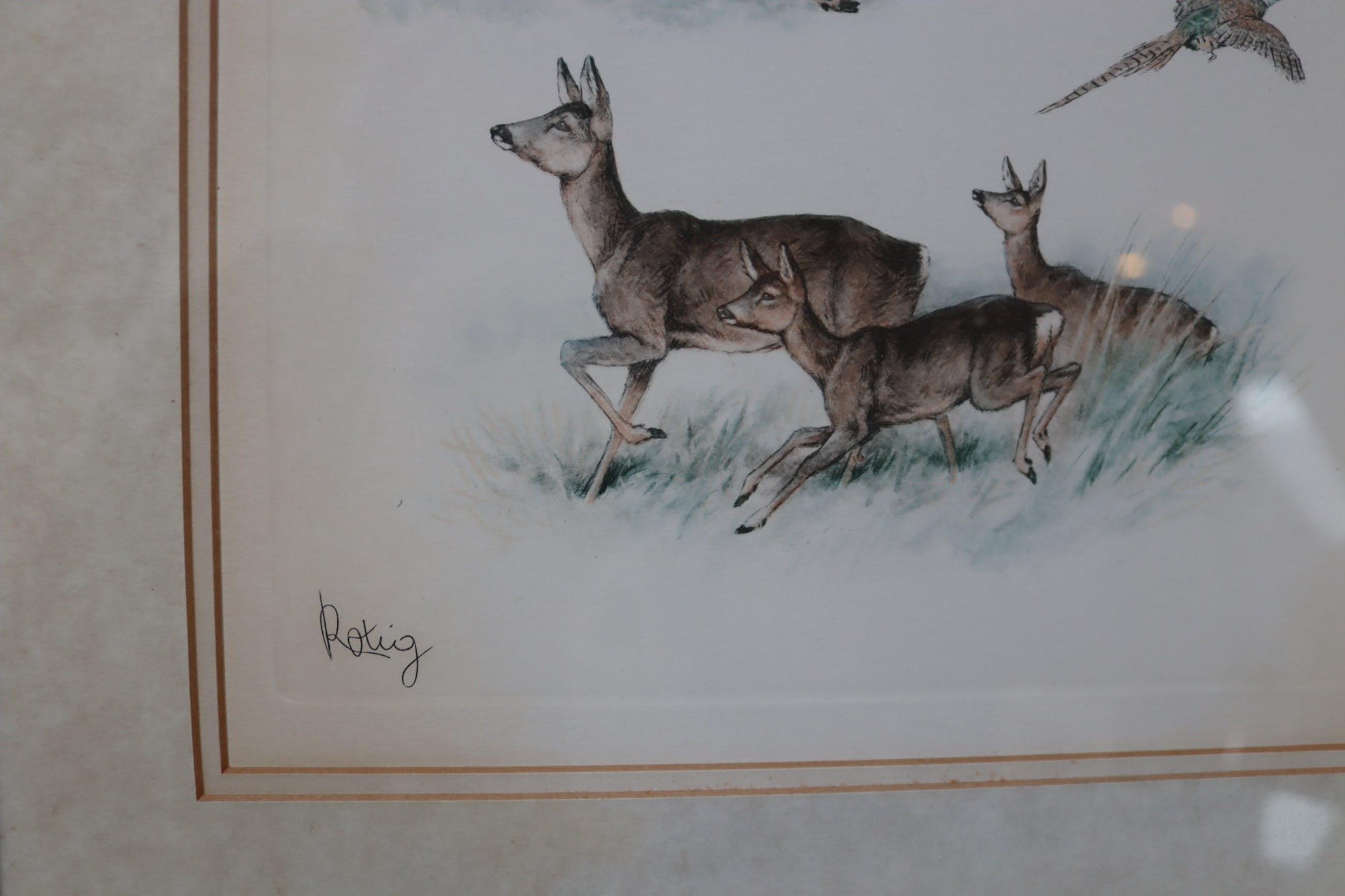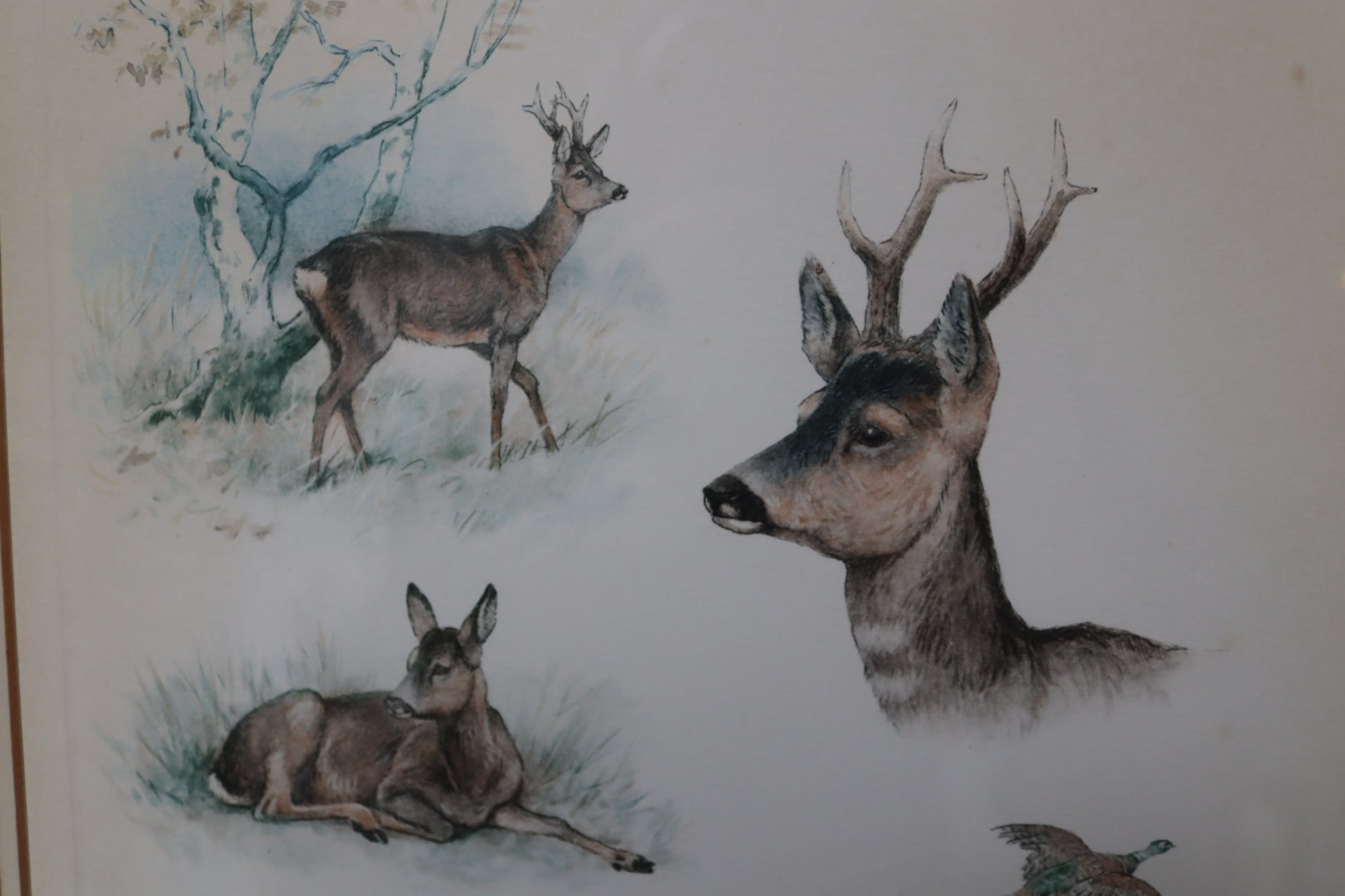 Mooie lithografie van Georges-Frédéric Rötig (1873-1961) van verschillende hoofden van herten, reeën en een fazant. Mooie kleuren en zeer gedetailleerde koppen. Gesigneerd linksonder, ingelijst met glas. Vermoedelijk tussen '38-'40.
