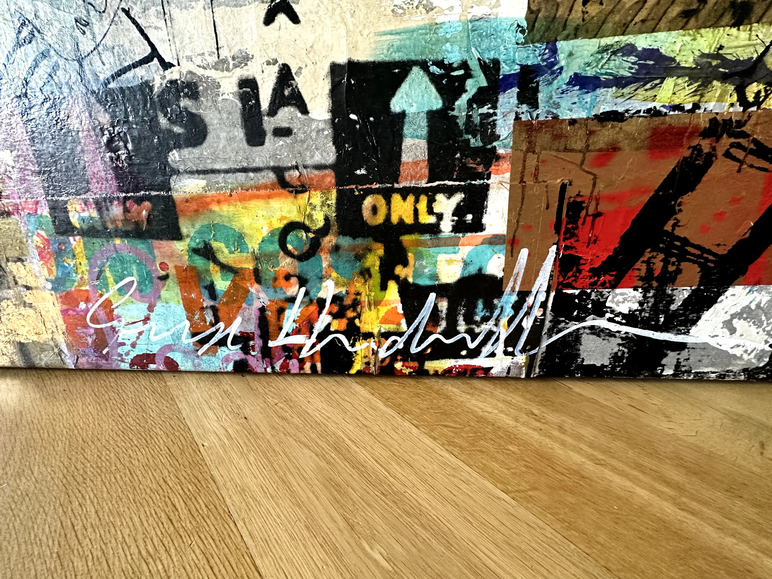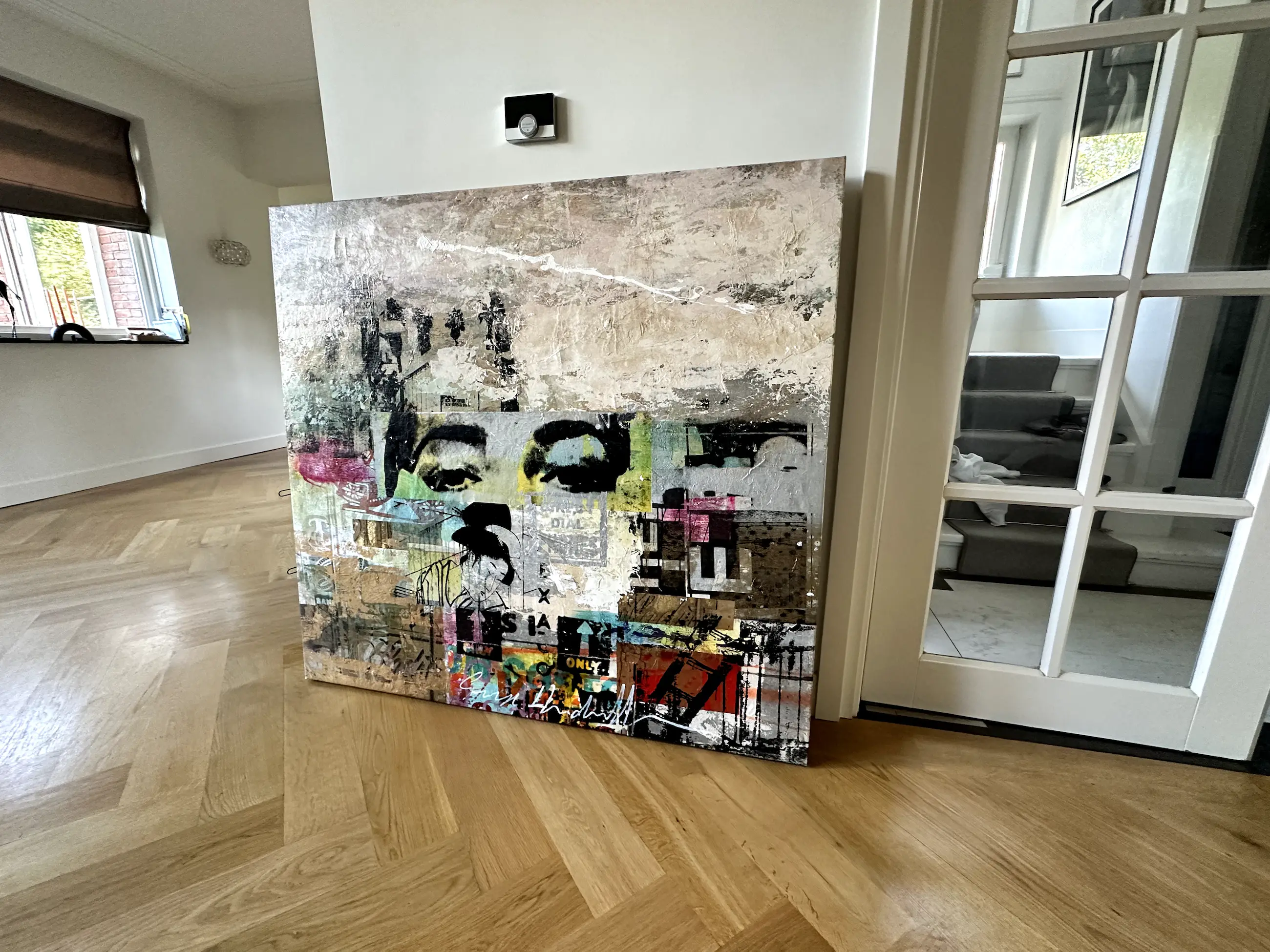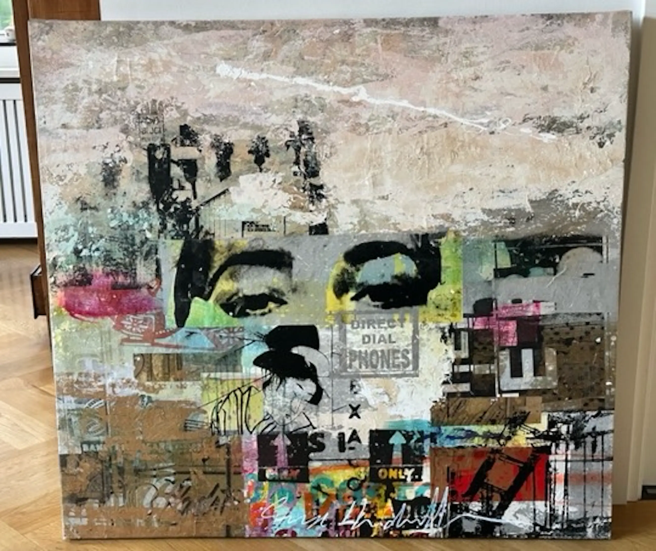 Werk van de Amsterdamse beeldend kunstenaar George Heidweiller. Dynamisch werk, waarbij gemengde technieken worden gebruikt. Sterke Westerse (oa ogen Audrey Hepburn) en Oosterse iconen en visualisatie naast elkaar, straatcultuur, stadsleven. Krachtige, bijna vierkante vorm. Persoonlijk gesigneerd onderaan het werk.