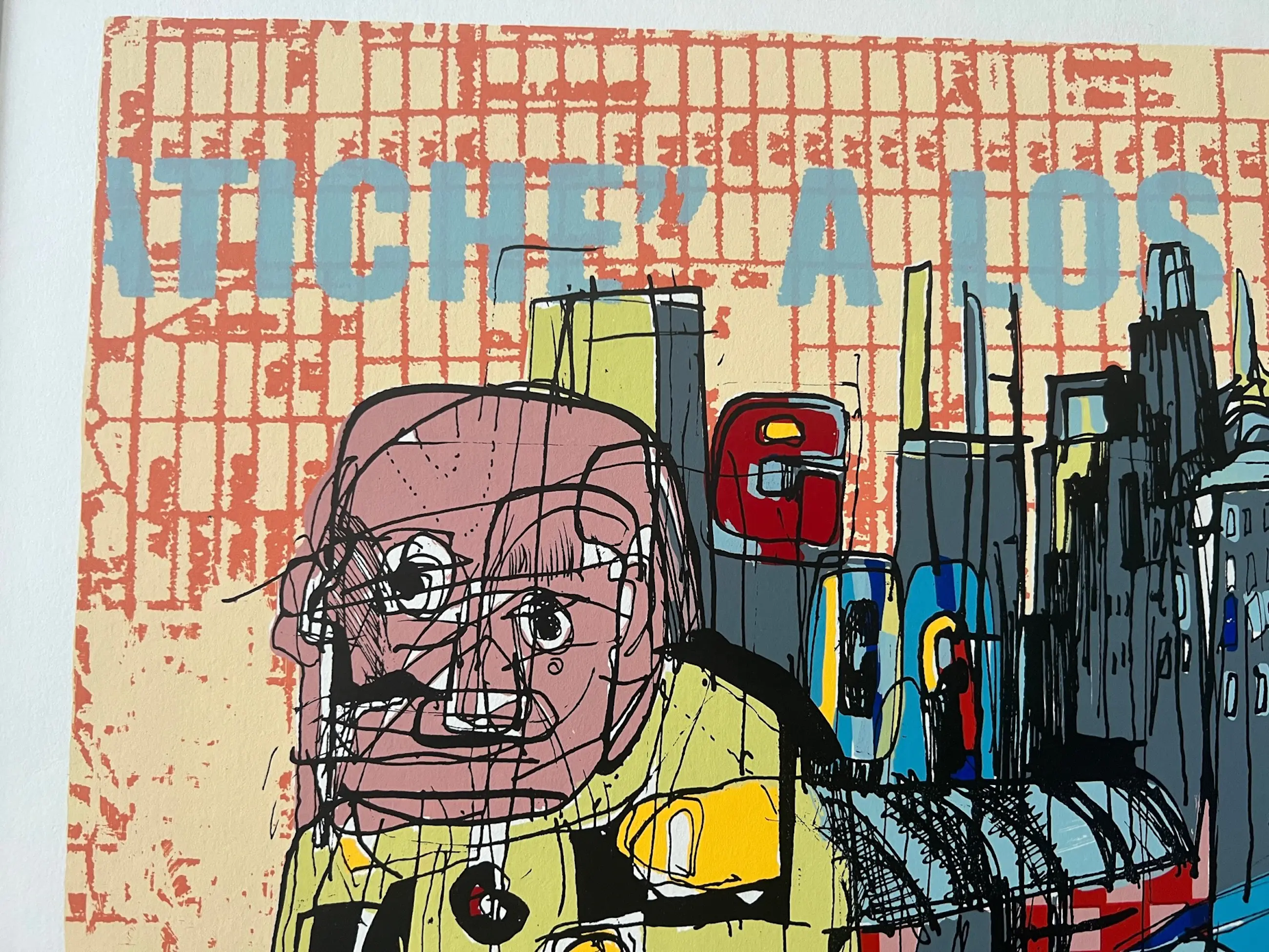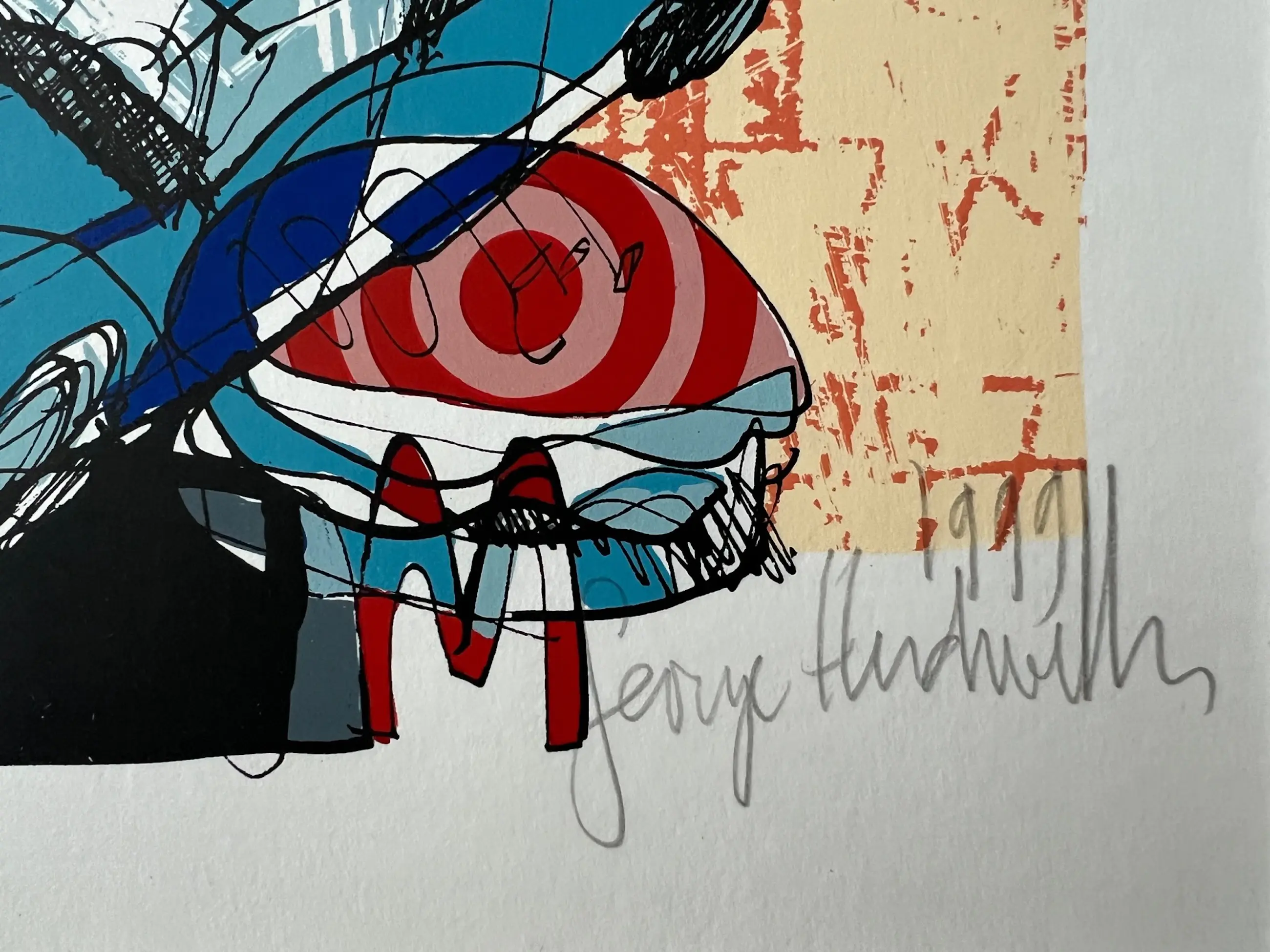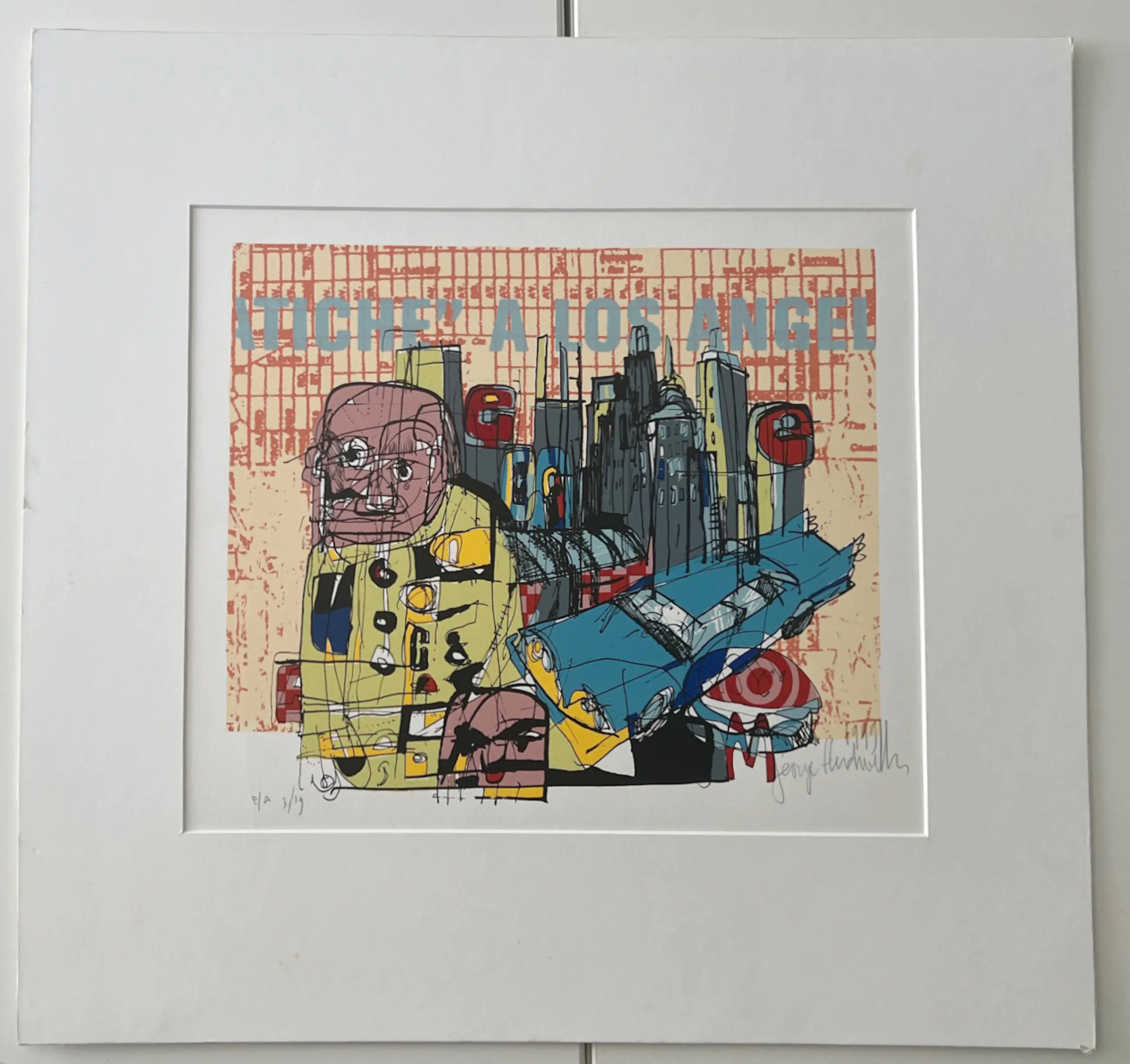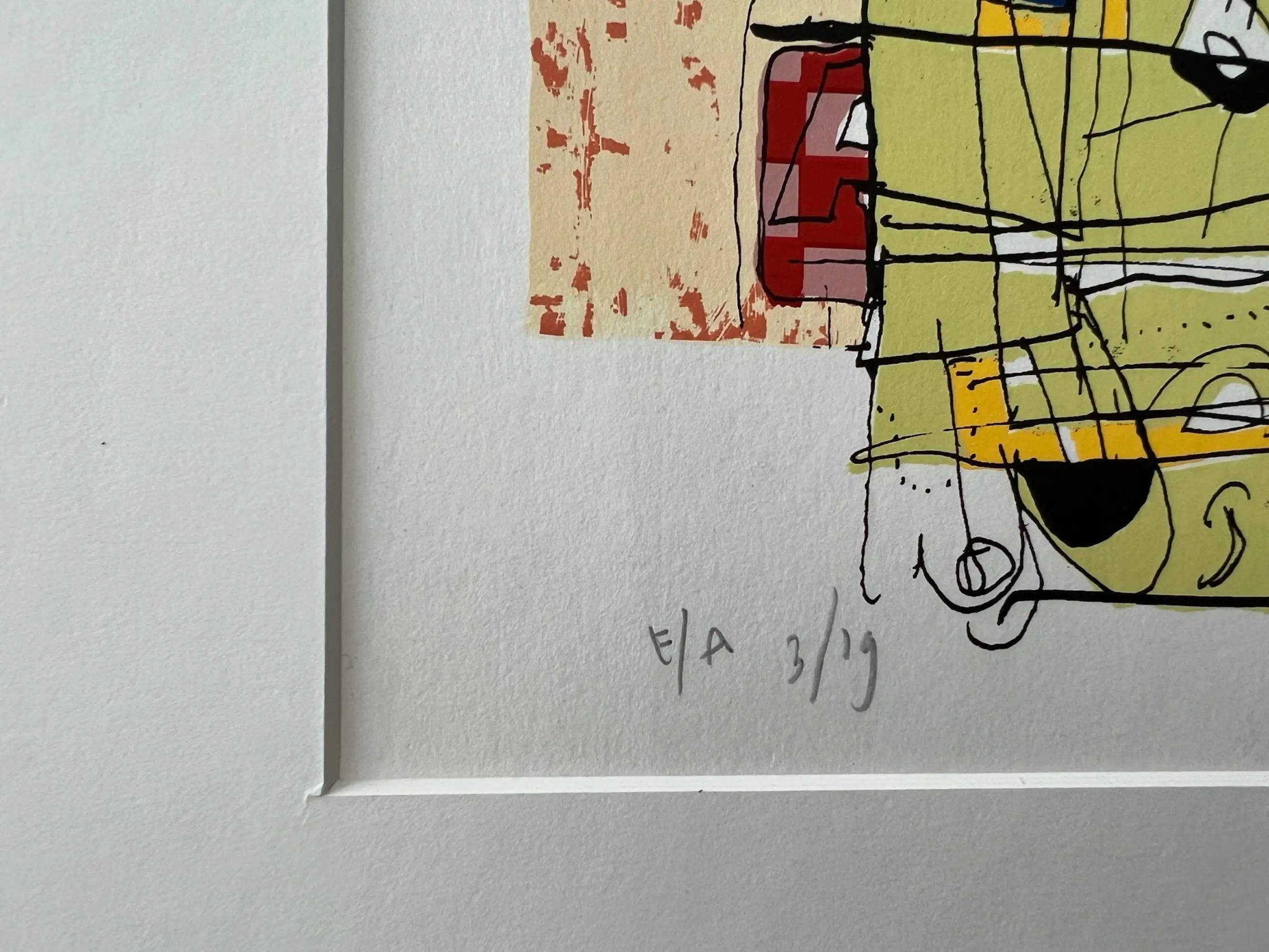 Zeefdruk is in zeer goede staat. Het passe-partout heeft een kleine beschadiging aan de linker zijkant langs de rand maar deze valt weg in de sponning van de lijst als het werk ingelijst wordt.