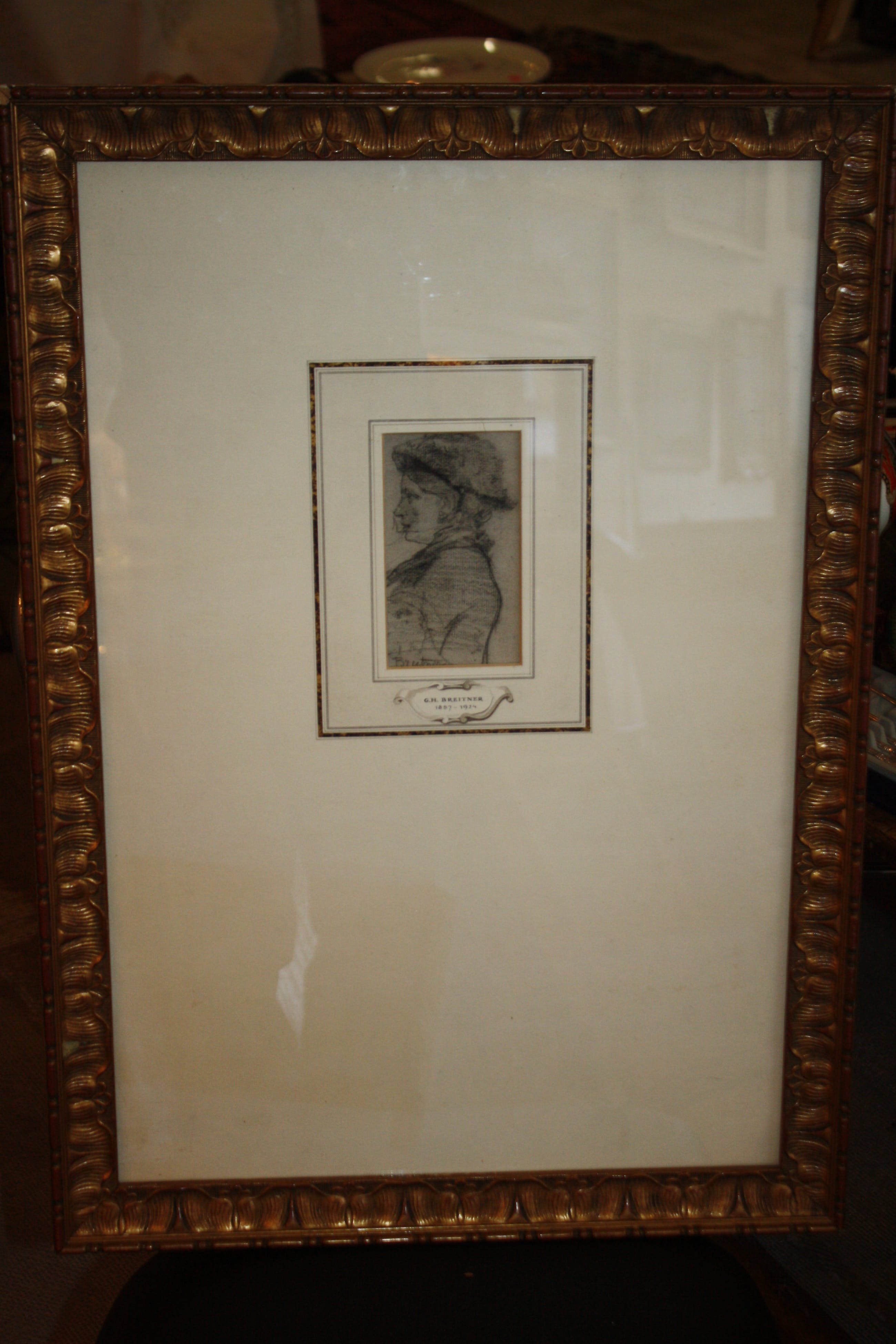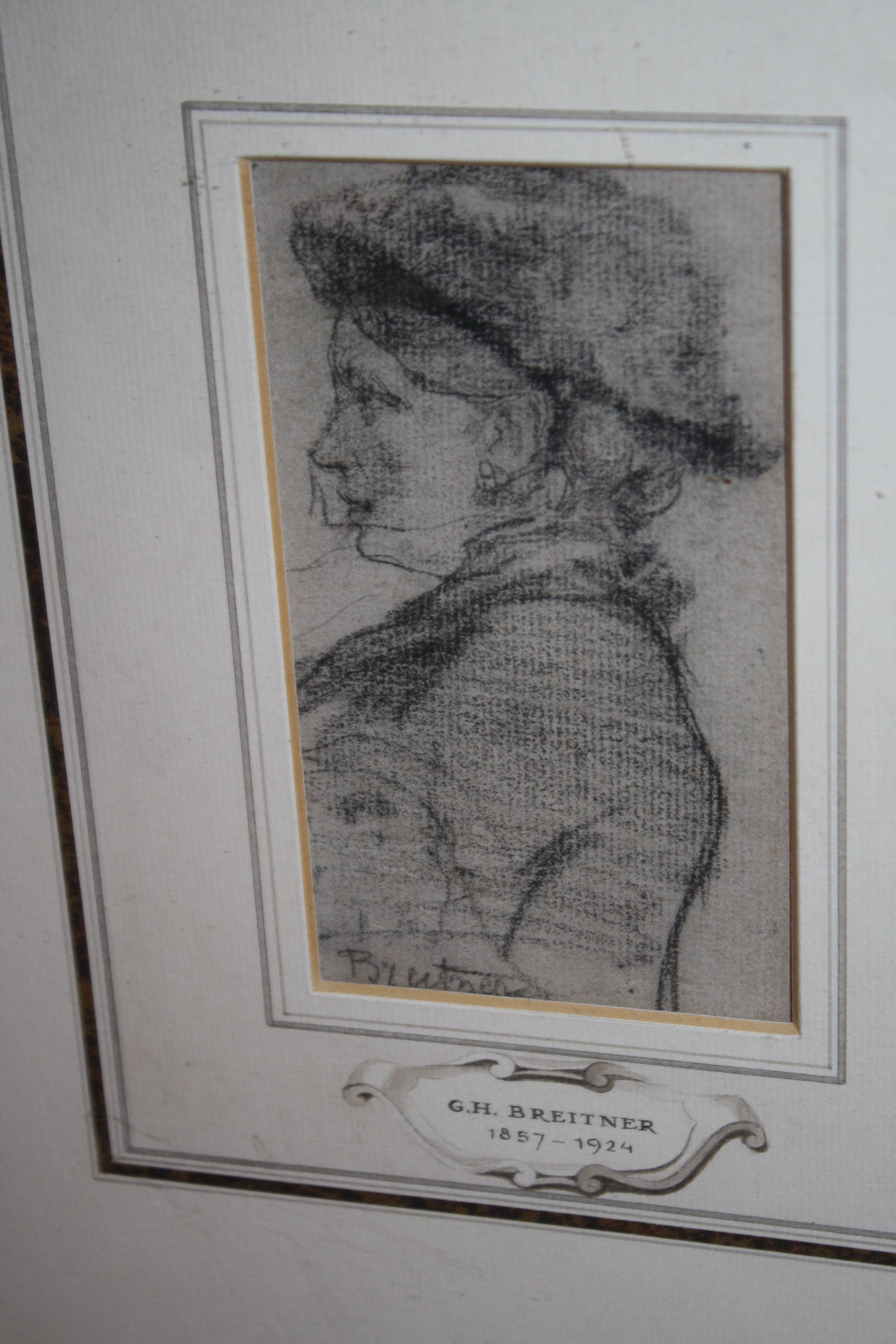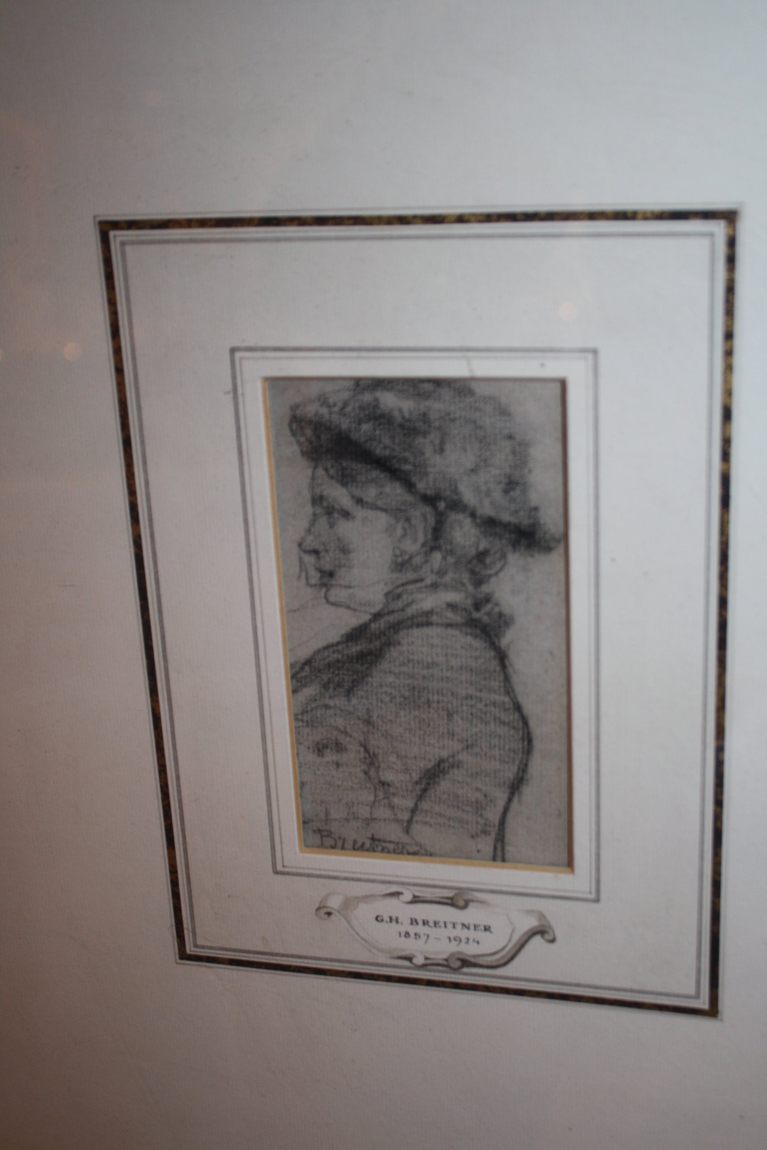 GH BREITNER PORTRET DAME MET SLUIER zwart krijt tekening in de maat 8 x 13 gesigneerd onder zeer fraai gekaderd in goudkleurige lijst met handgemaakte passe partoutin de maat 46 x 66 cm Tentoonstelling / Breitner schilder & fotograaf APELDOORN 1971zie tentoonstellingslabel aan de achterzijde / zie foto verzenden aangetekend of ophalen in beverwijk