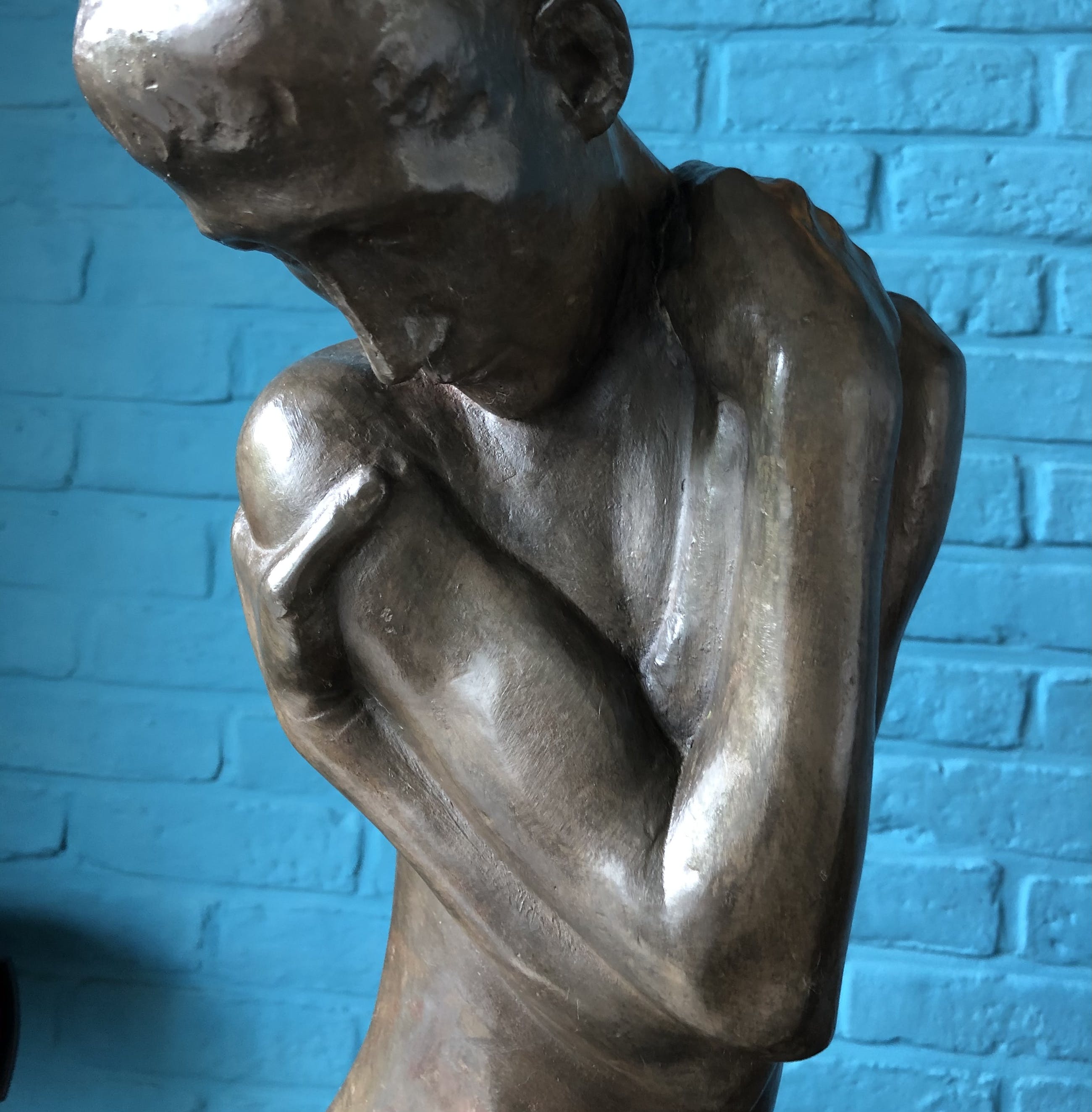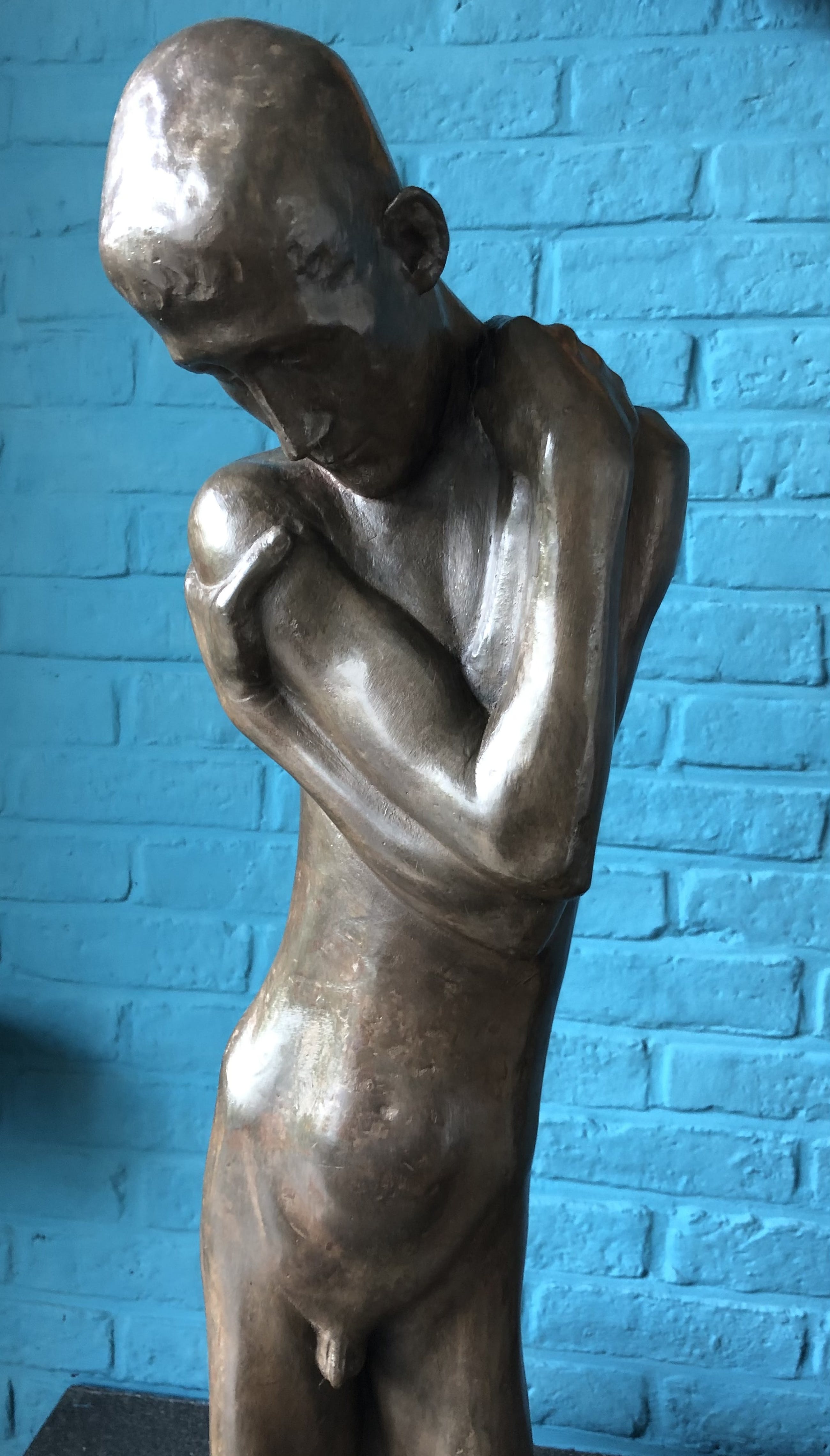 Een tengere man, geknield, de benen tegen elkaar, lijkt in meditatie verzonken. Zijn op de borst gekruiste armen evoceren onzekerheid, of eenzaamheid. Hij kijkt naar beneden, overweldigd door het gevoel dat hem overspoelt. De geknielde van de fontein van George Minne is een van de meest iconische werken van de Gentse beeldhouwer. De kunstenaar, die zich sterk tot de gotische kunst aangetrokken voelde, lengt het lichaam hier uit en vereenvoudigt zijn vorm, zonder op de klassieke canons terug te grijpen.