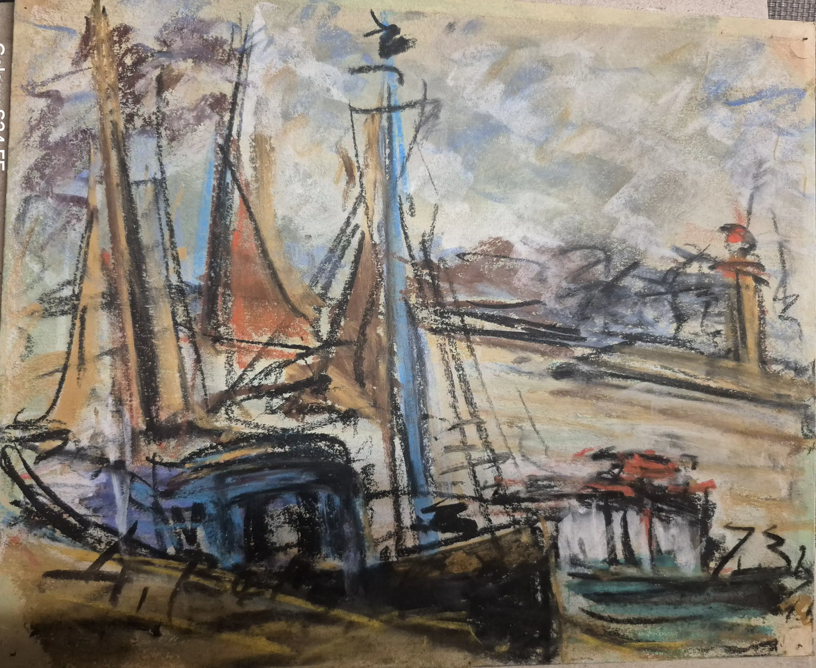 Handtekening van Georges Berger uit 1973, waarop vissersboten in de haven van Honfleur in Normandië zijn afgebeeld. Gemaakt met oliekrijt.