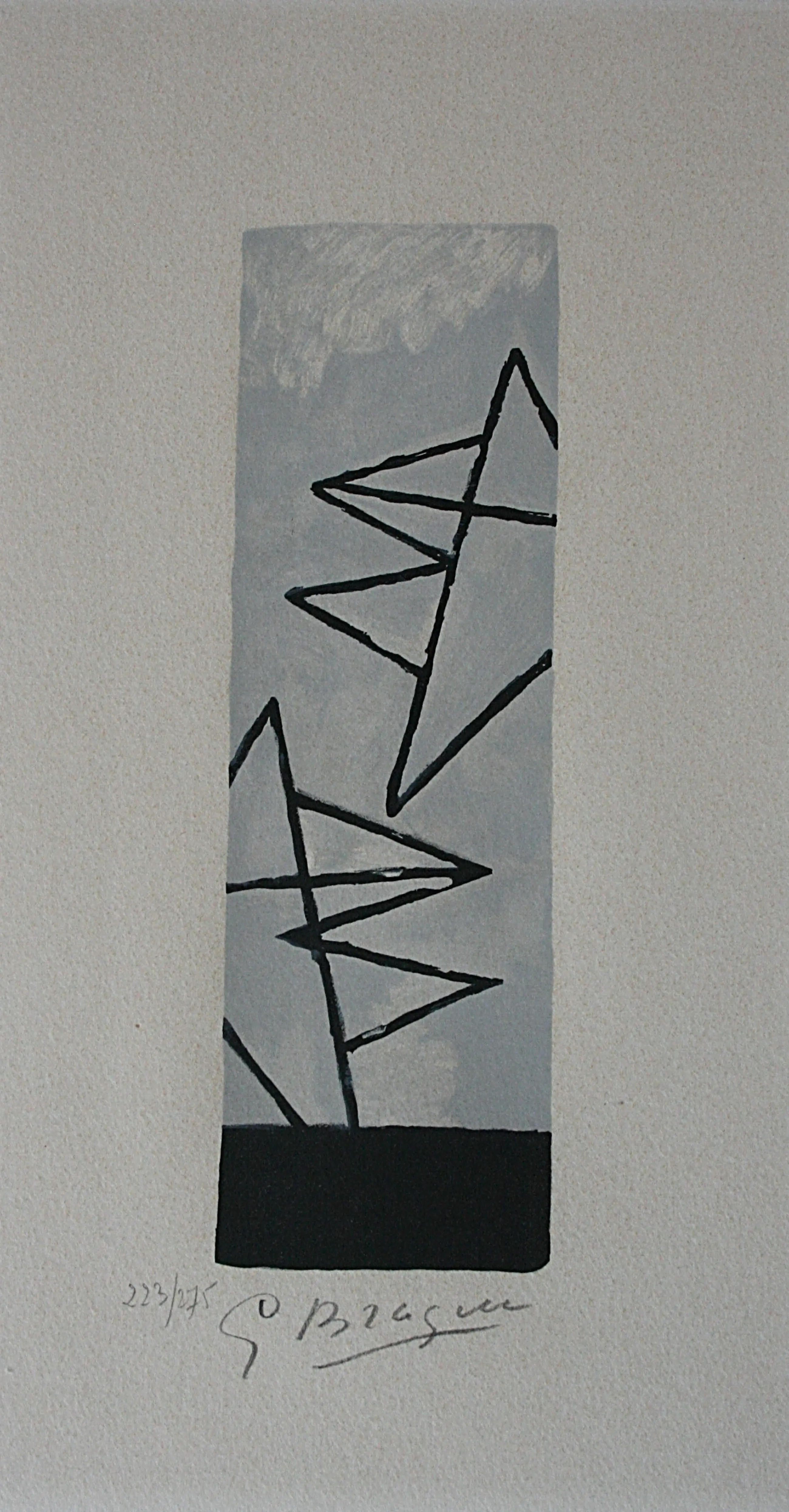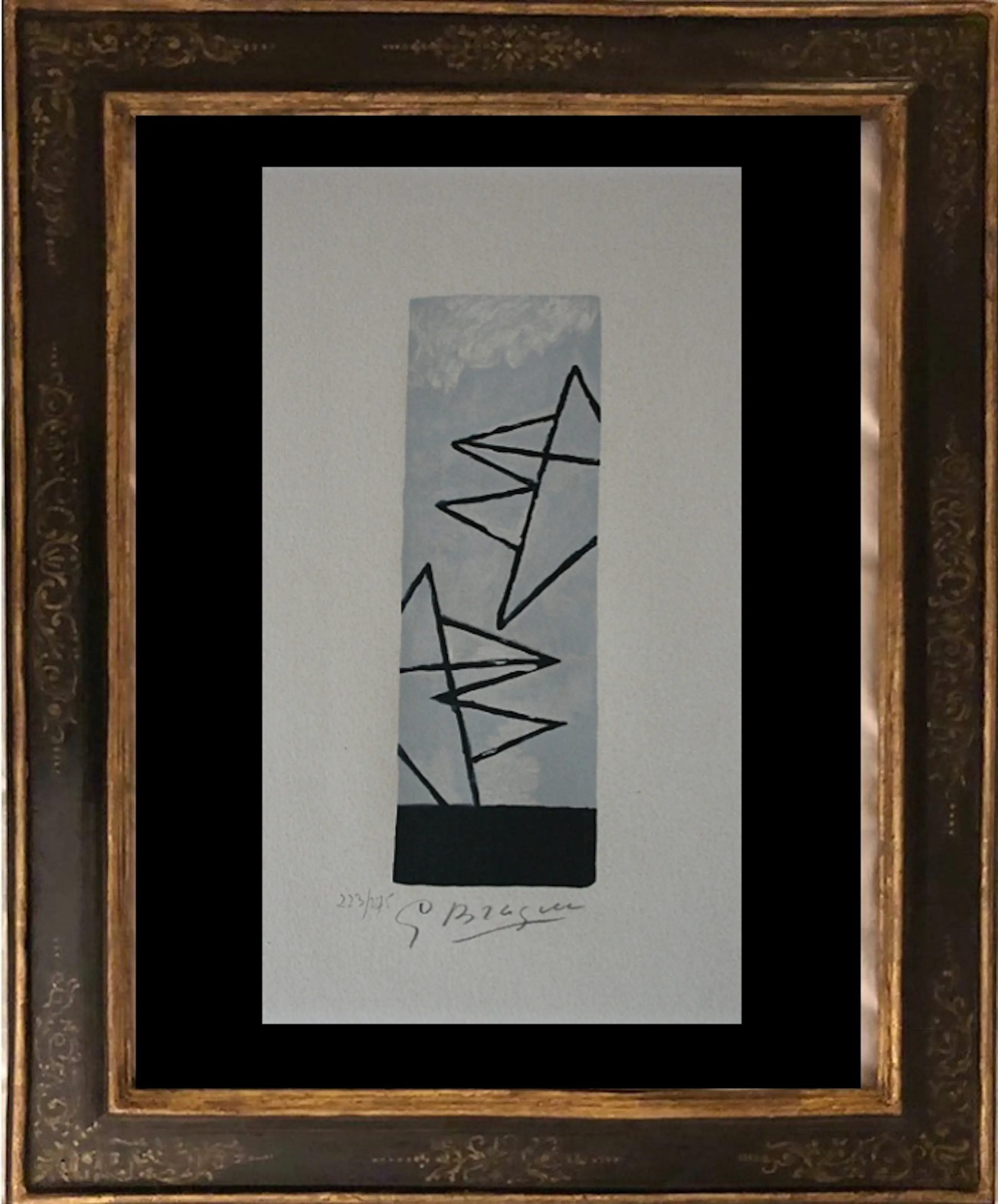 Aangeboden wordt de litho gemaakt door Georges Braque onder de naam "Ciel gris I" in 1959 (gelegd papier met de reliëfstempel van Maeght Paris). De gesigneerde oplage is 275 exemplaren, dat is exemplaar 223/275. Formaat van de afbeelding ca. 9 x 22,5 cm. Velformaat ca. 32,5 x 48,5 cm. Het werk is te zien in de oeuvrecatalogus van Maeght onder nummer 1032 en in Vallier op pagina 295. Het frame maakt geen deel uit van het aanbod. De galerieprijs ligt rond de 1.700 euro (zie foto). De verzendkosten binnen Duitsland bedragen 25 euro.
