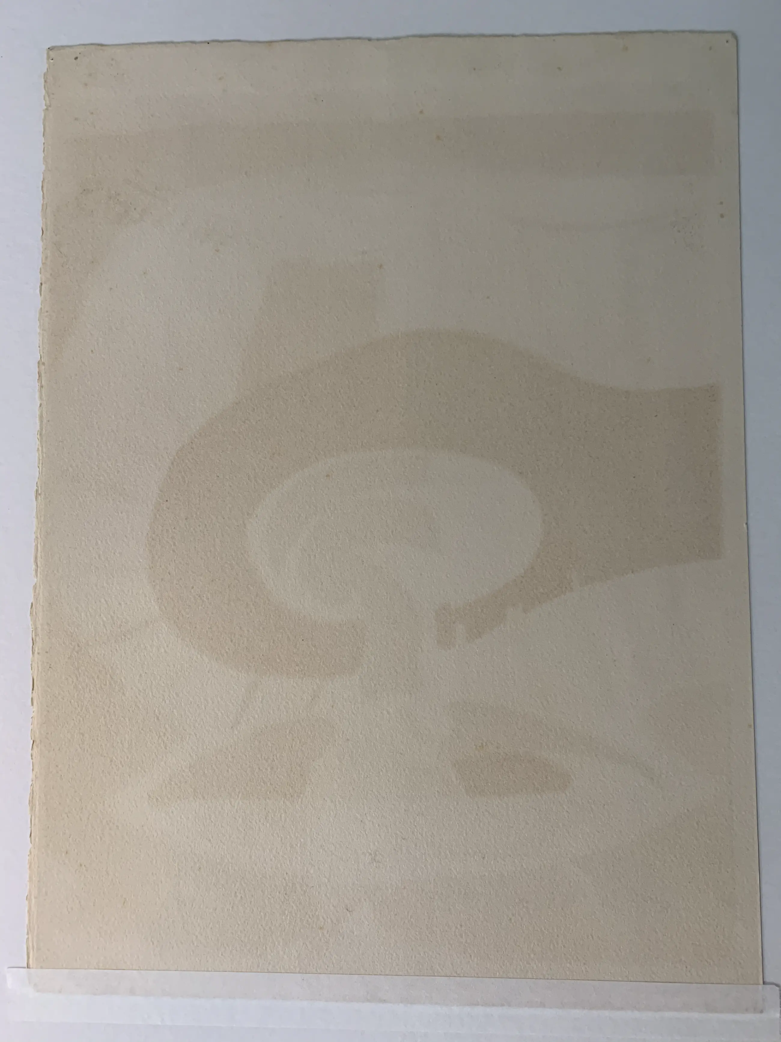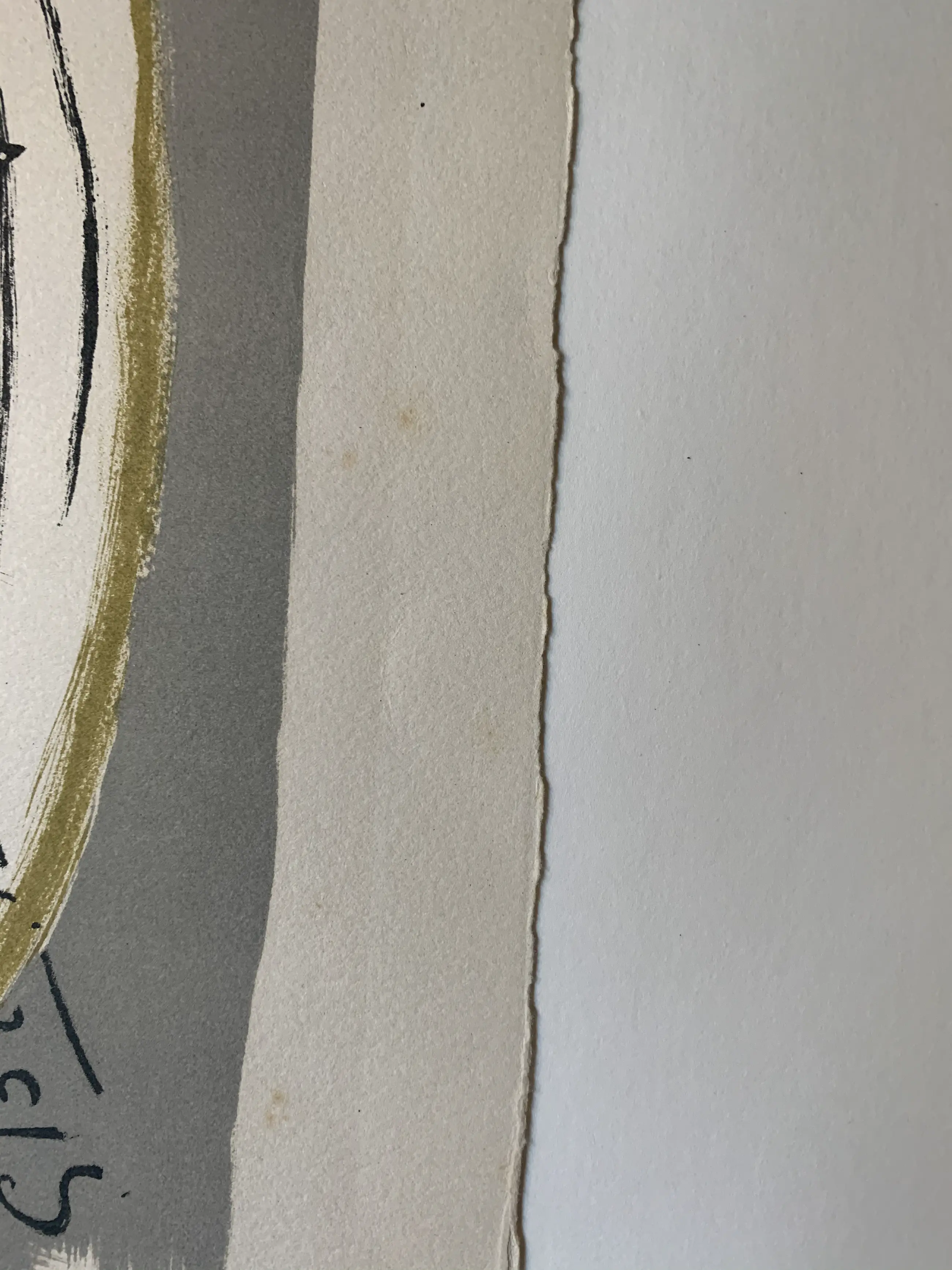 Aan de randen net onder het passe-partout iets verkleuring van het papier in. Iemand van kleien stipjes