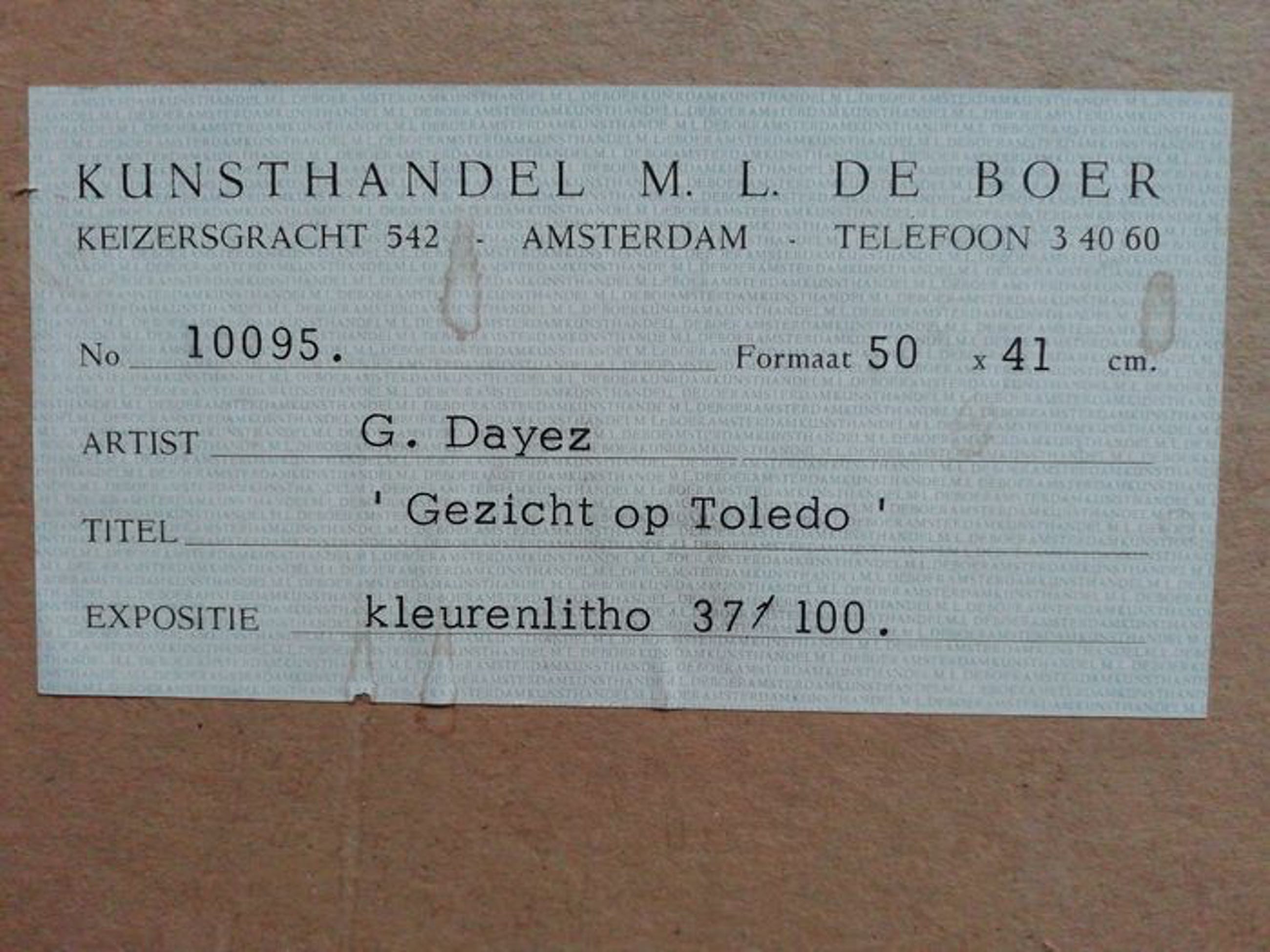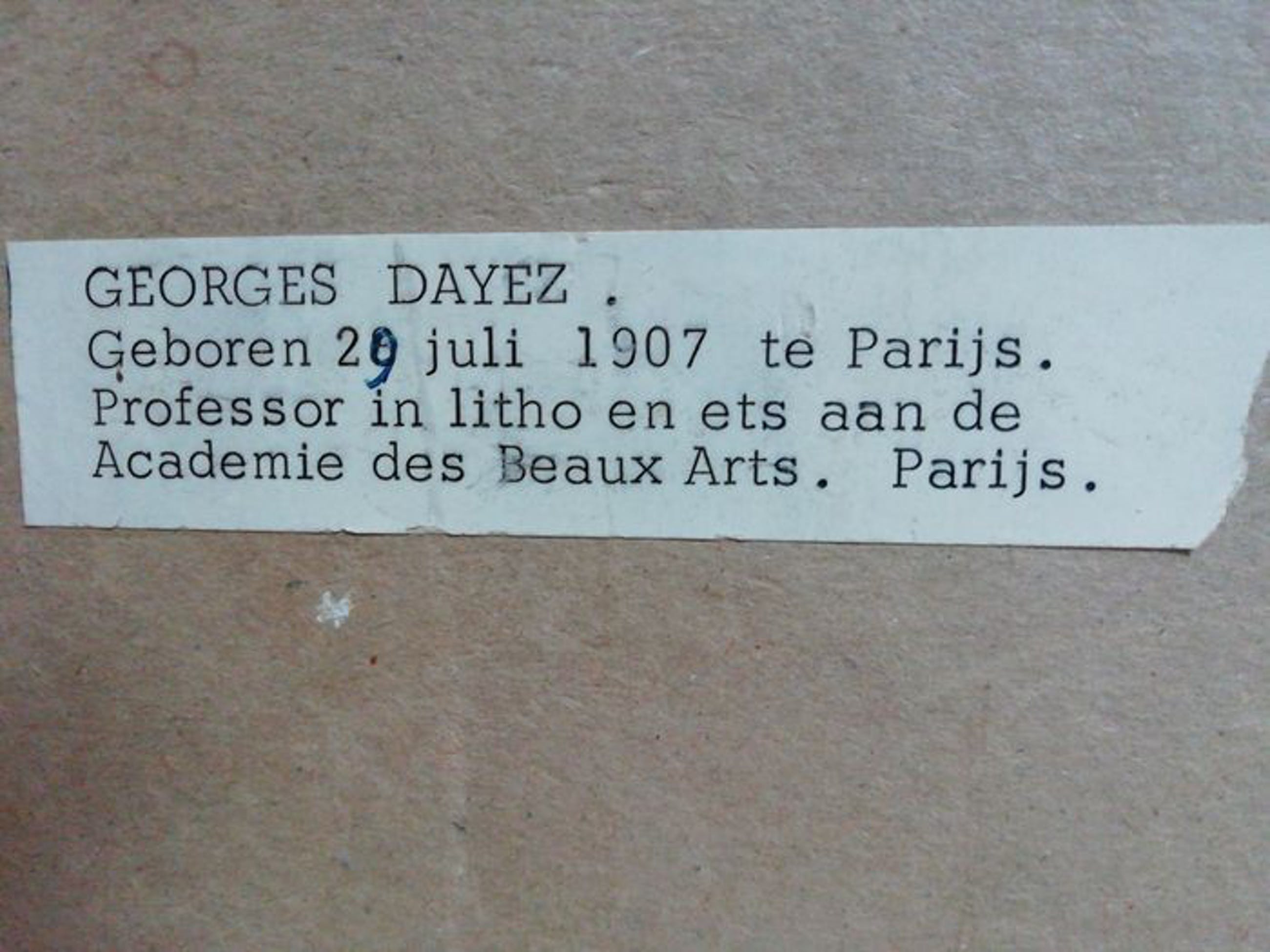 Georges Dayez (1907-1991) - Franse schilder en lithograaf, fan van kubisme, vooral Georges Braque. Vanaf 1944 stelt hij regelmatig zijn werken tentoon. In de jaren vijftig en zestig heeft hij tal van individuele tentoonstellingen over de hele wereld. Hij doceerde ook lithografie aan de Academie des Beaux Arts in Parijs.