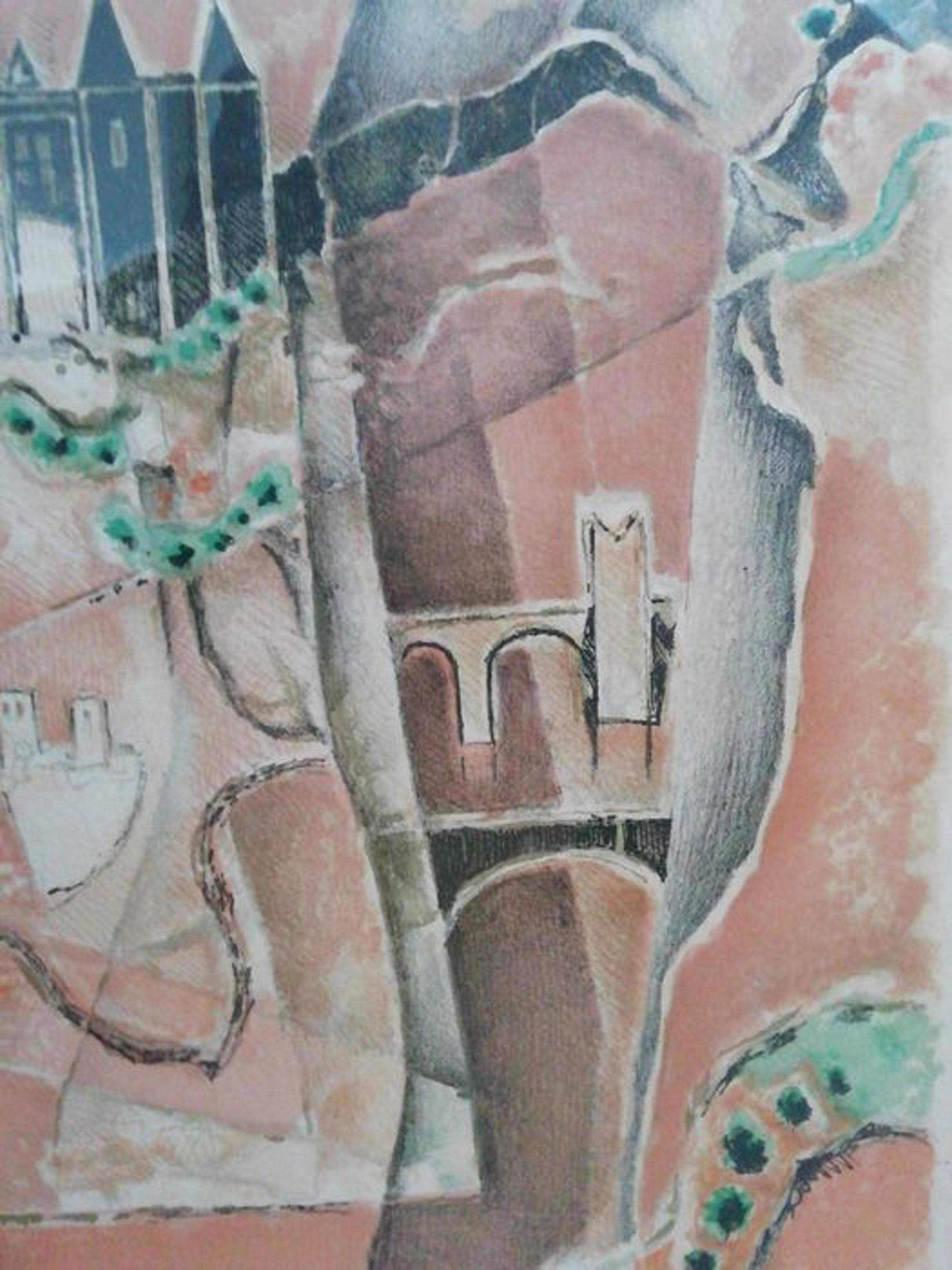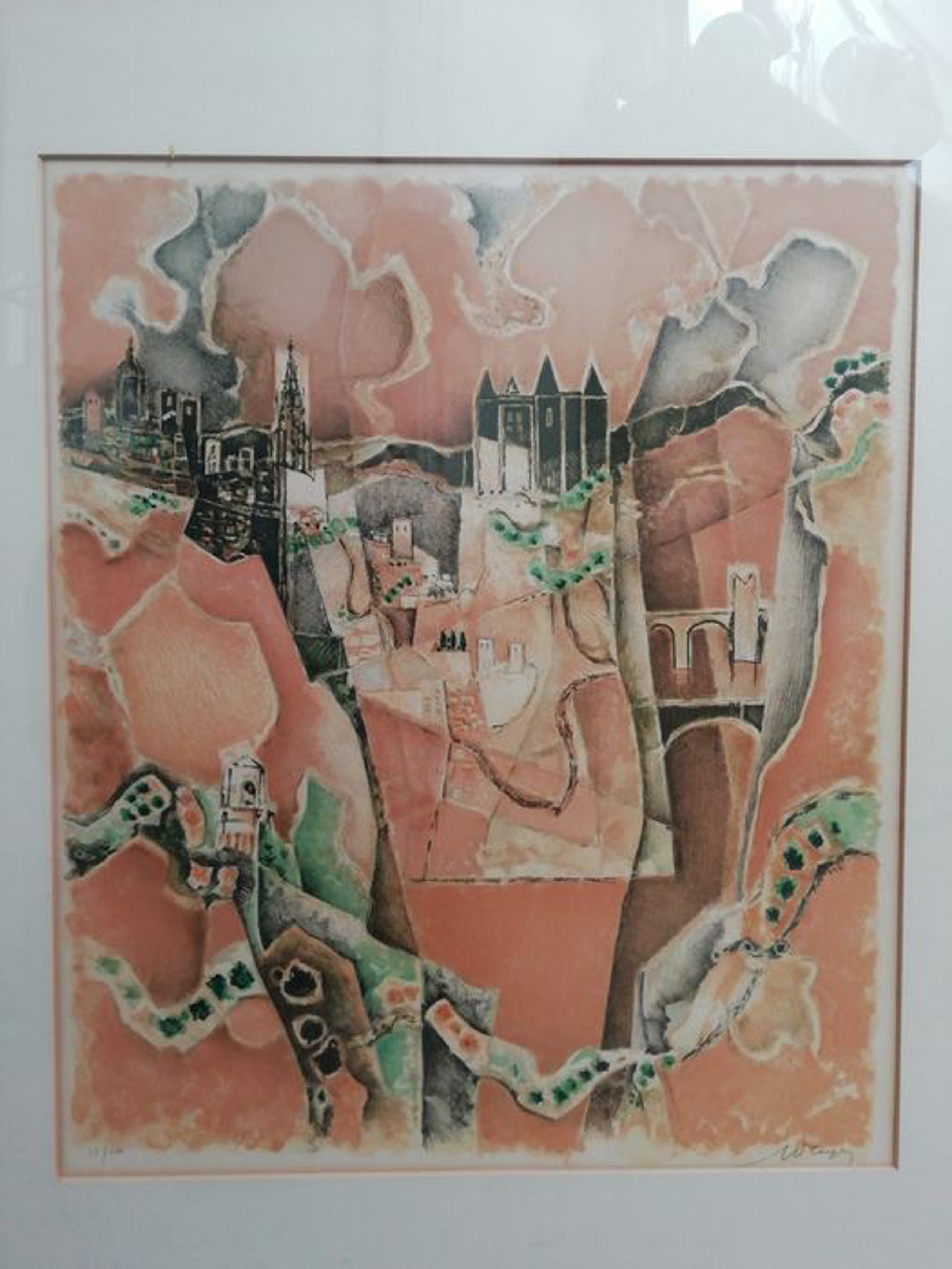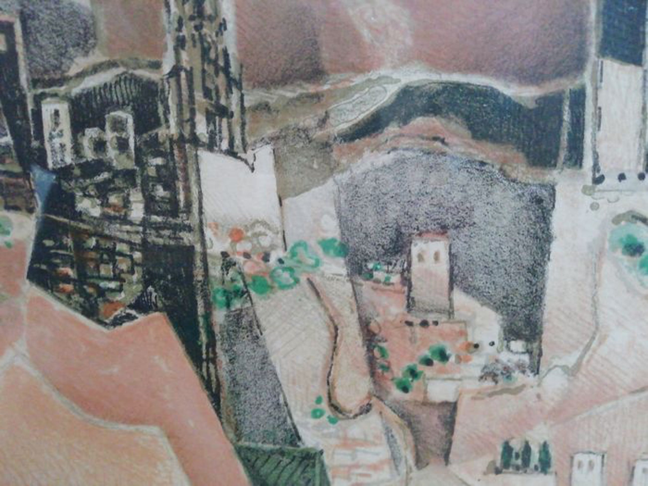 Verticale afbeelding van een Spaanse stad die beroemd is om zijn middeleeuwse en renaissancistische architectuur. Het totale landschap is vertoond, wat minder gebruikelijk is. Dayez gebruikt in zijn werk kubistische taal op basis van een analytische benadering van het onderwerp.