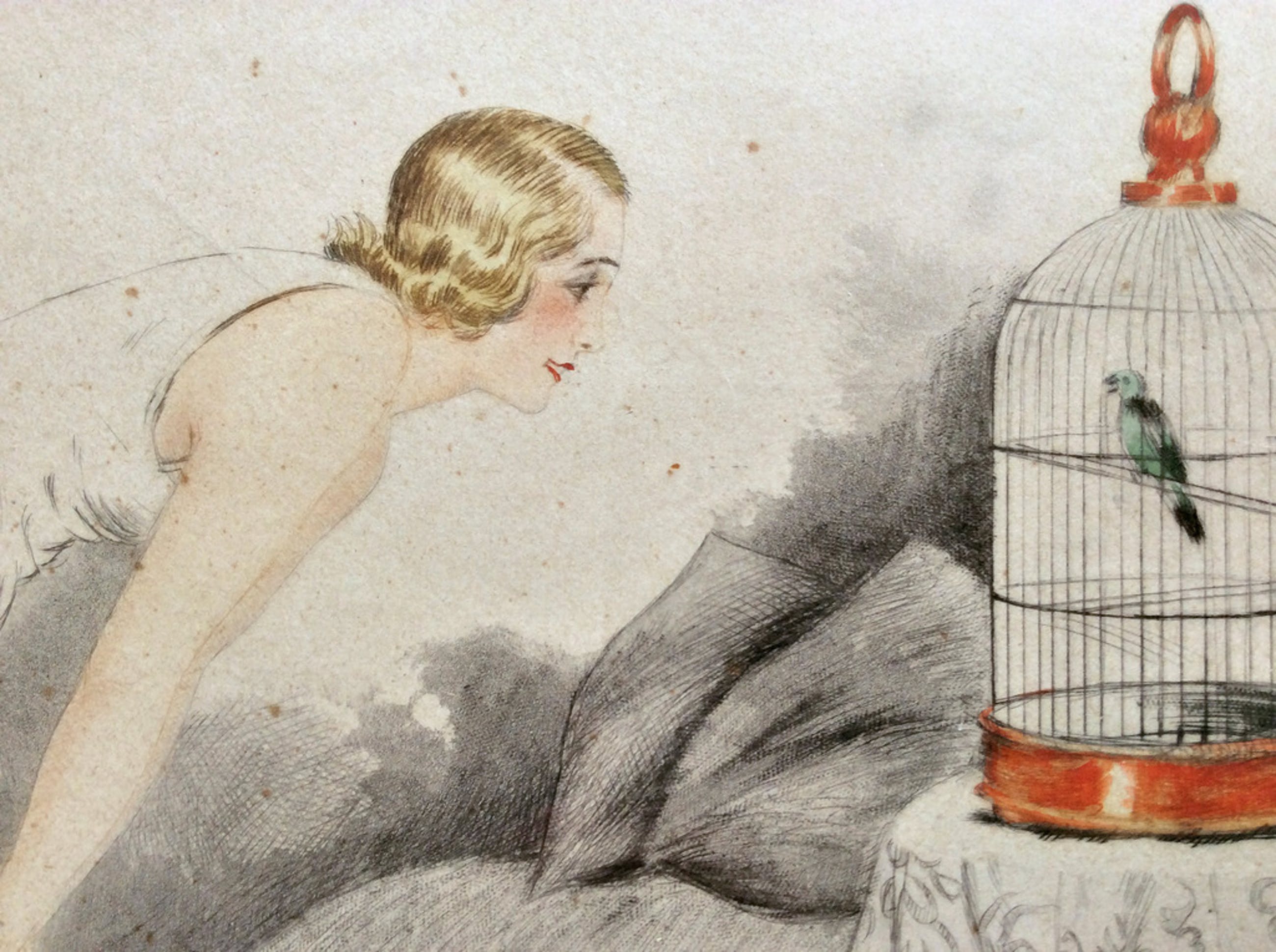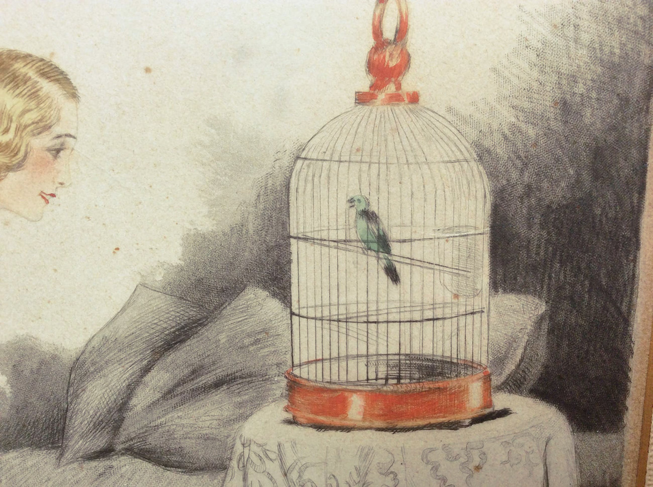Lithografie van jonge vrouw met vogel in de kooi. Ca. 1920.In eenvoudige lijst, incl. passepartout formaat incl. 34 x 40 cm. Litho grootte 20 x 27 cm.