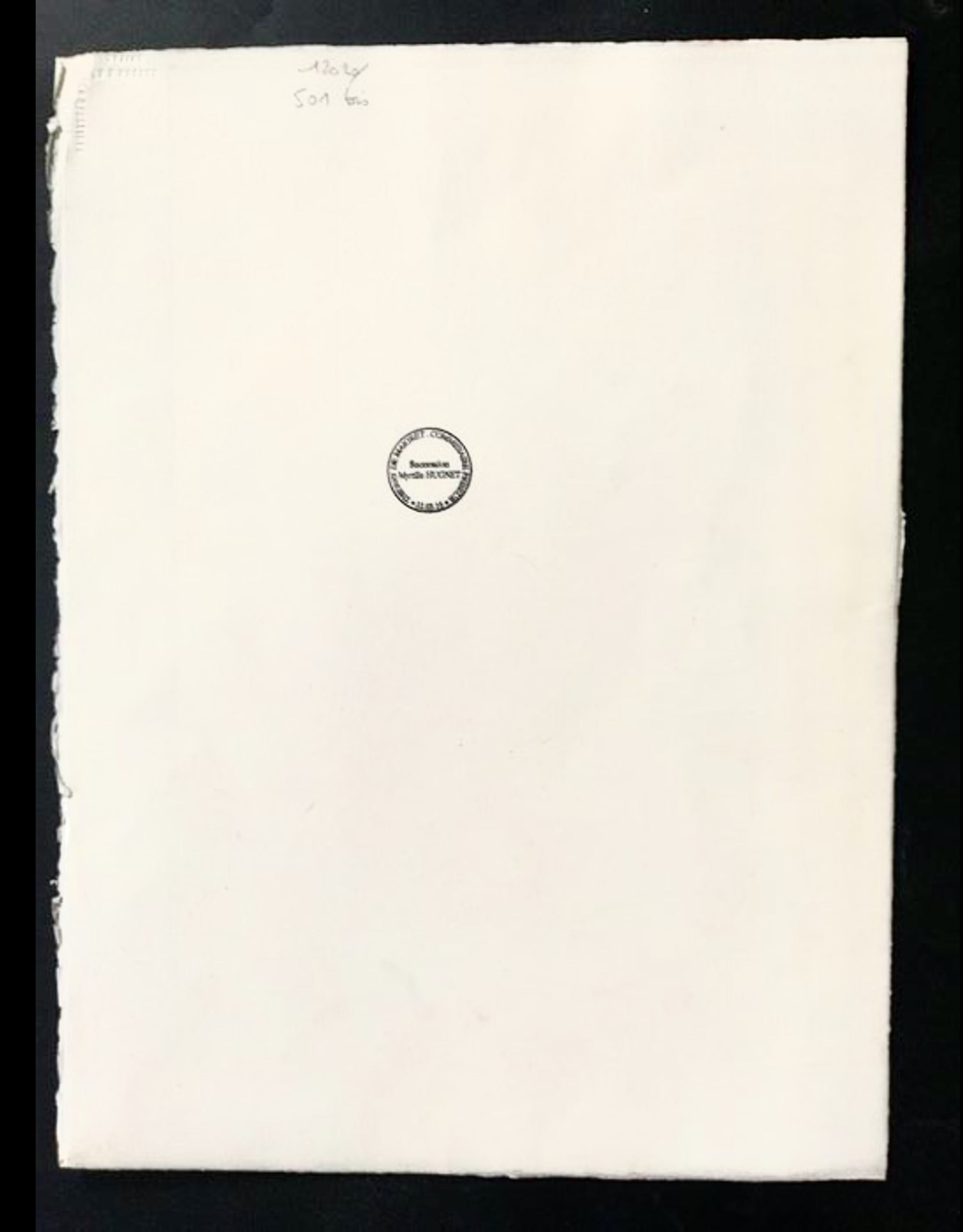 Het werk is rechts onderin ondertekend met zijn initialen G.H. 72. Op achterzijde staat een stempel van Myrtille Hugnet Estate, de weduwe van Georges Hugnet - met datum 11-03-2016.
