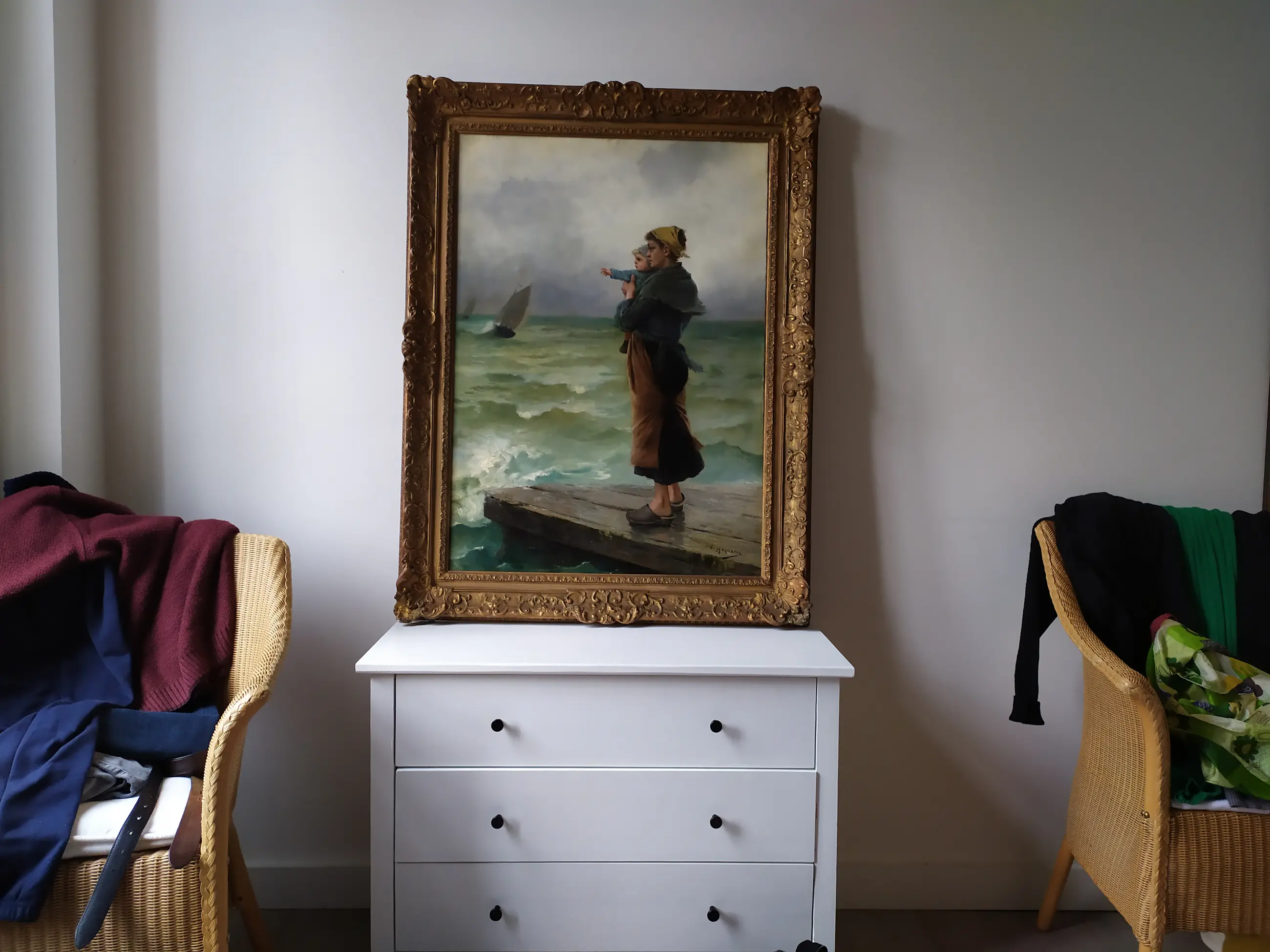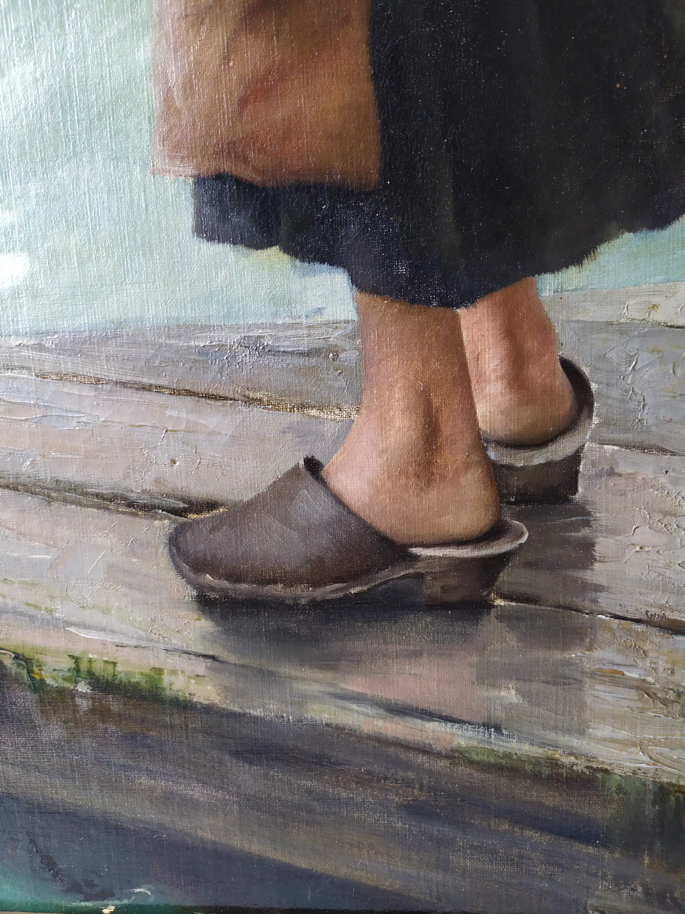 Op dit schilderij figureert weer zijn favoriete model, de jonge vrouw met kind die haar visser uitzwaait op de aanlegsteiger in het haventje.